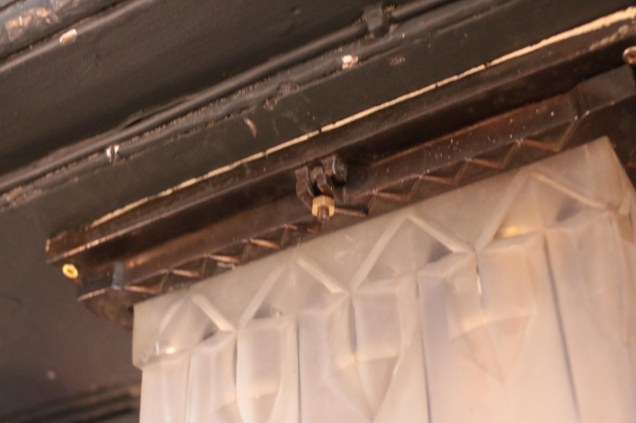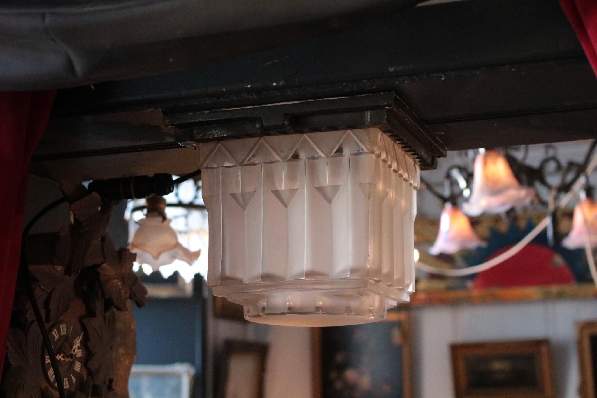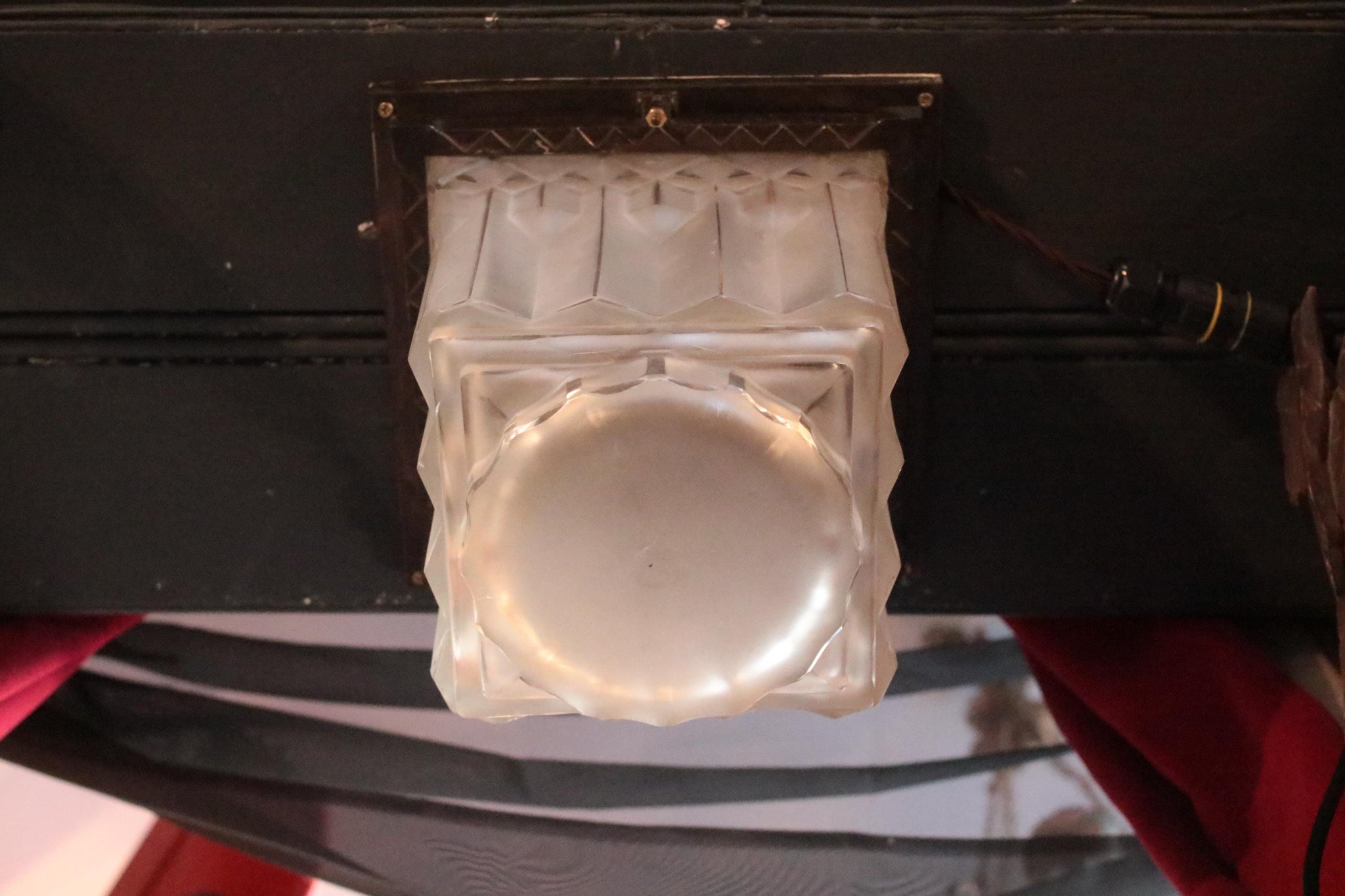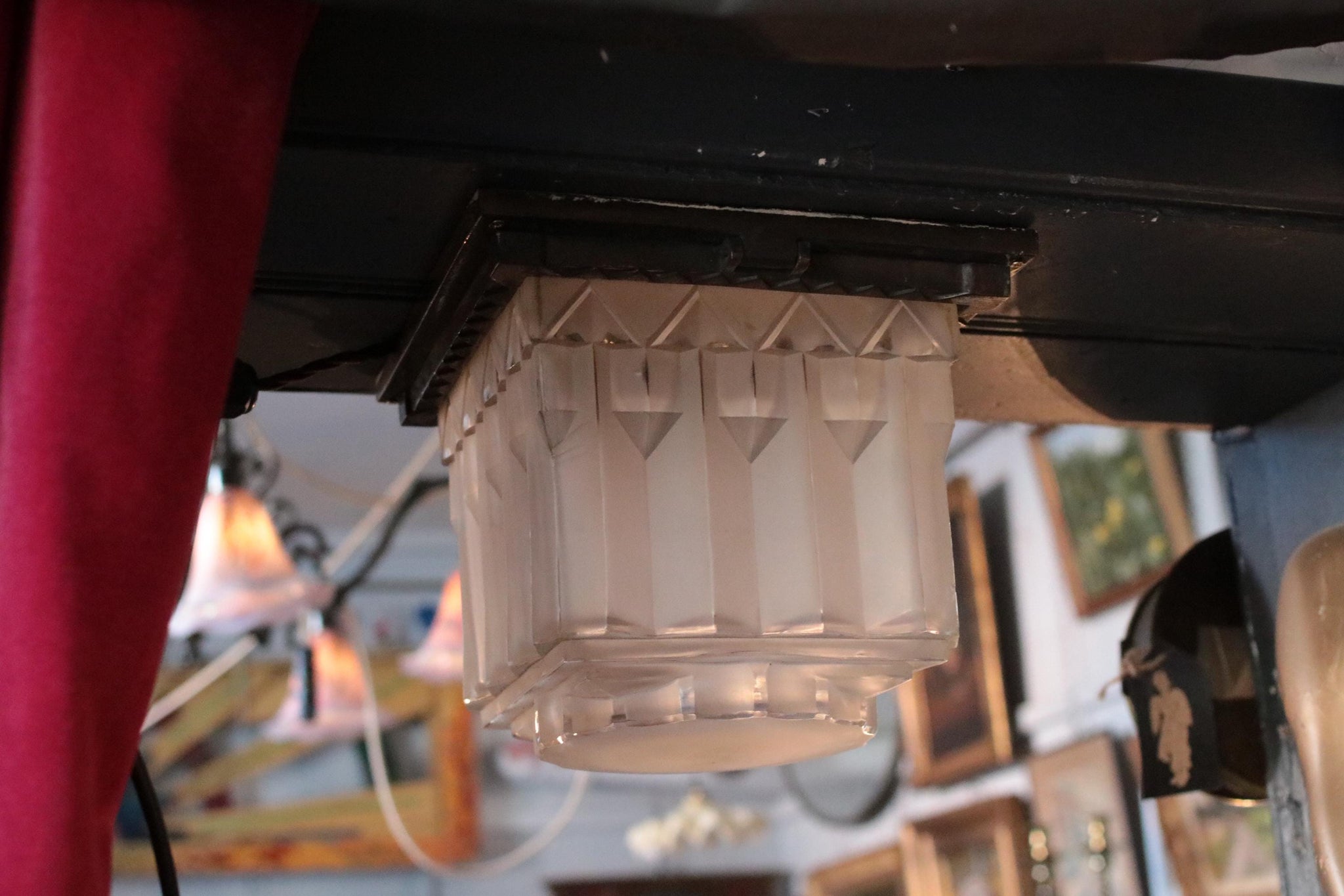 The piece has been rewired with modern bulb holder braided flex, ready for safe use, and can be either chain-hung or flush-mounted depending on ceiling height. Ideal for hallways, home bars, or any interior drawing from Art Deco, old Hollywood, or modernist revival aesthetics, this lamp bridges vintage craftsmanship and timeless design.