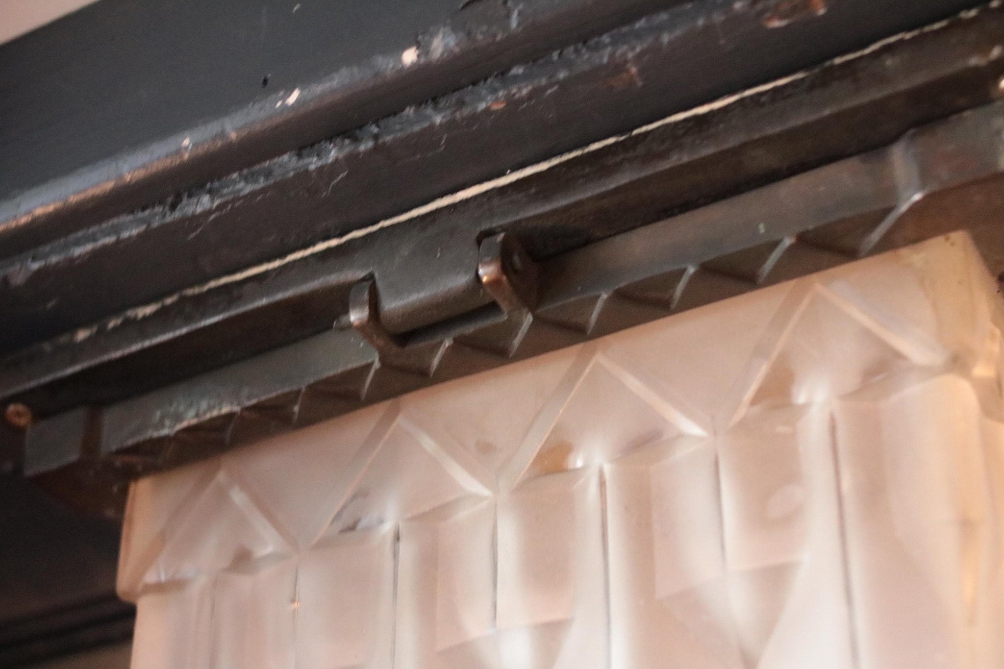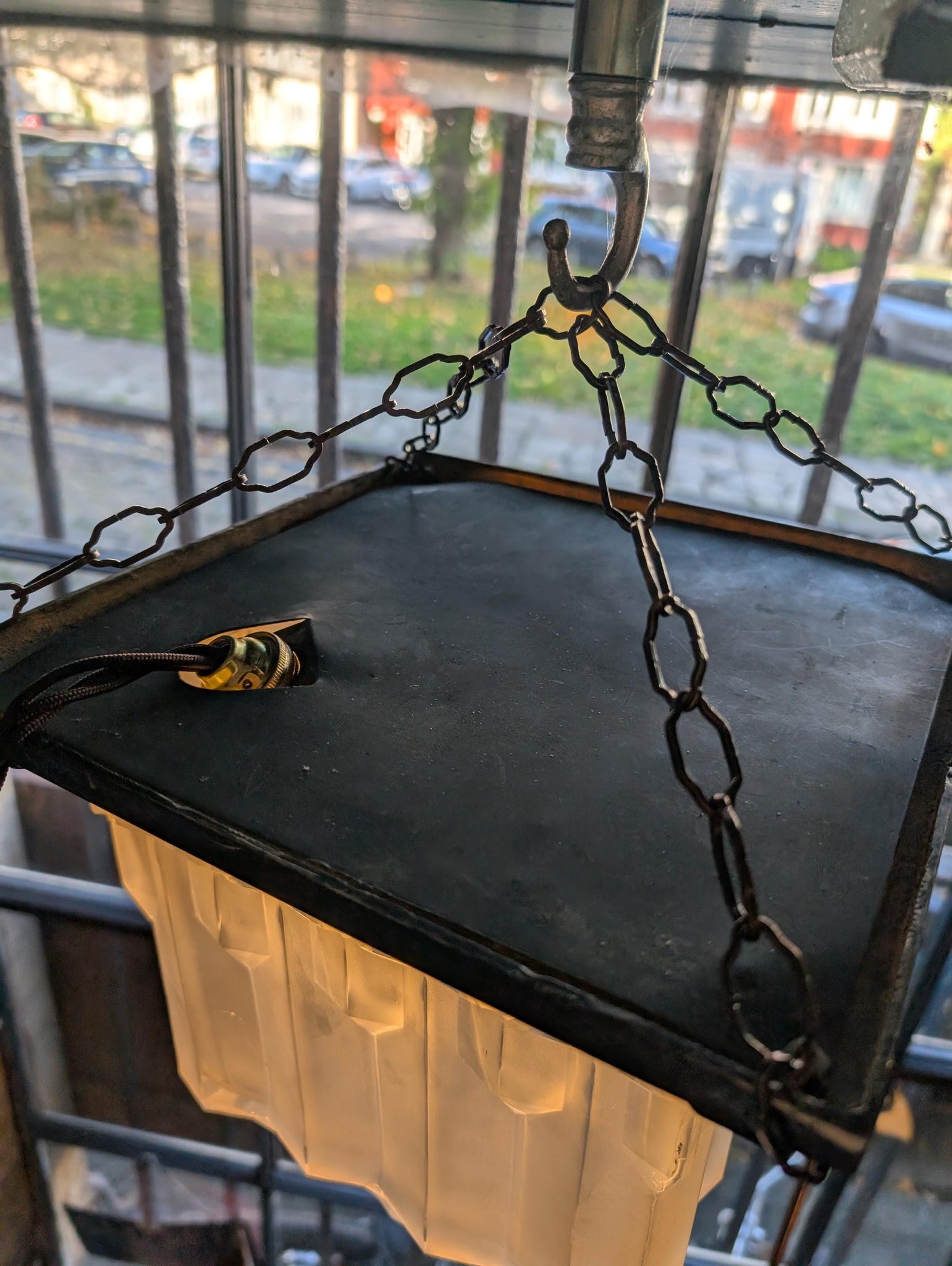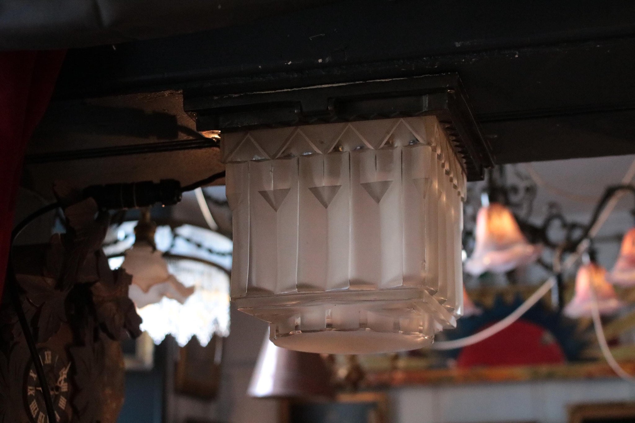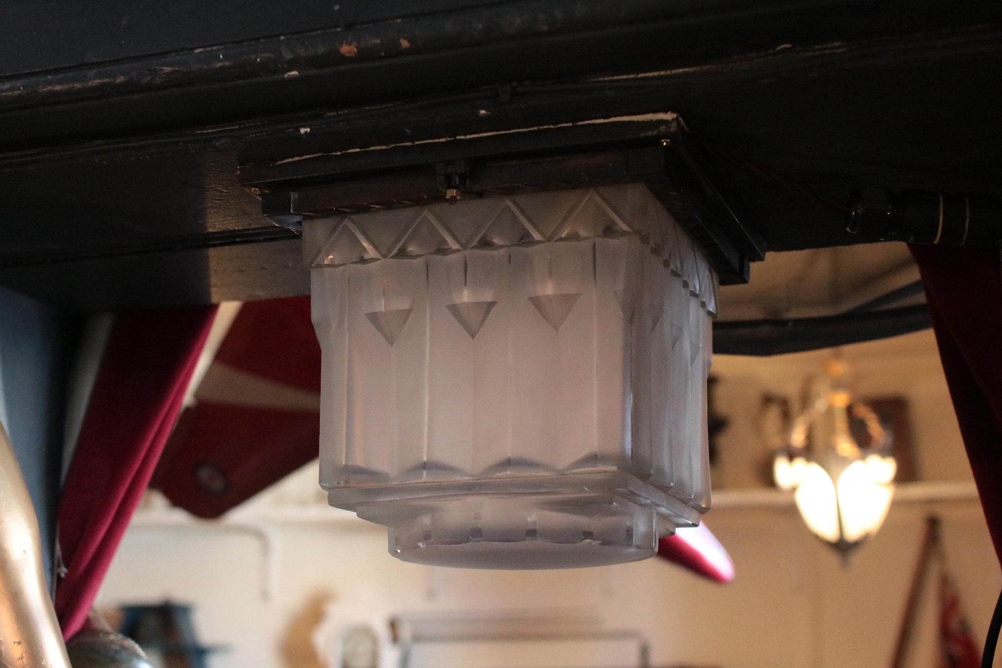This striking Art Deco ceiling light features a bold geometric frosted glass shade with a distinctive stepped skyscraper form. Measuring 26.5 x 26.5 x 21 cm, it exudes the glamour and architectural precision of the 1920s, casting a soft, diffused light through its faceted panels. The shade is mounted to a square metal canopy suspended by an aged linked chain and hook, giving it a subtle industrial edge that complements its elegant form.