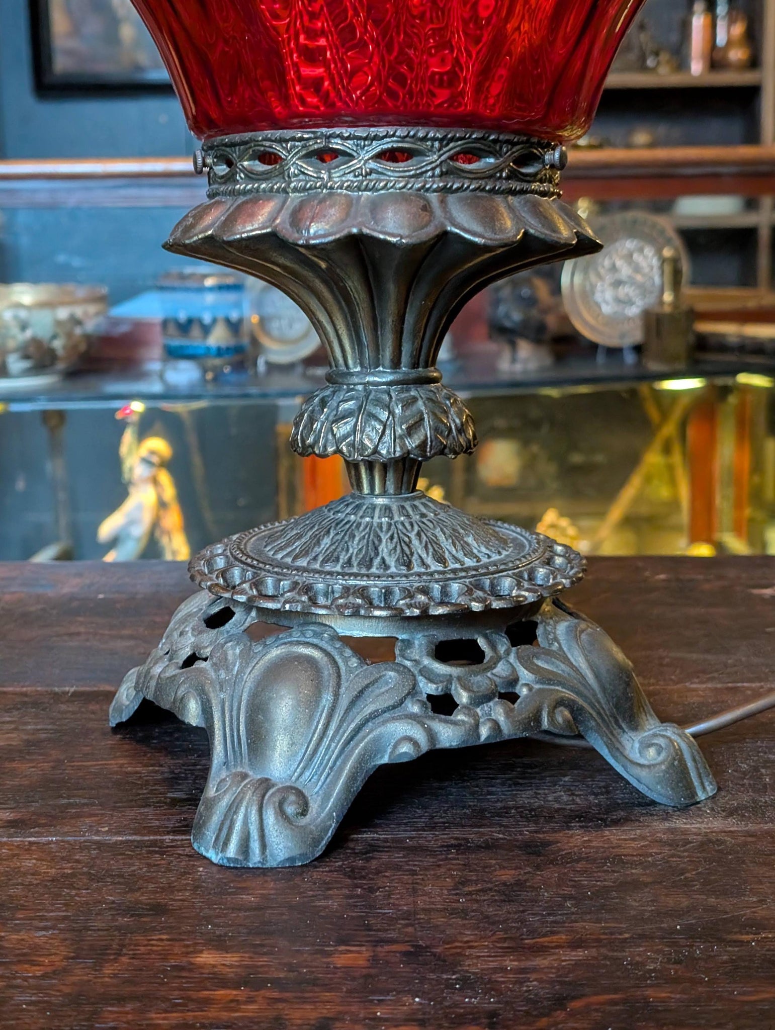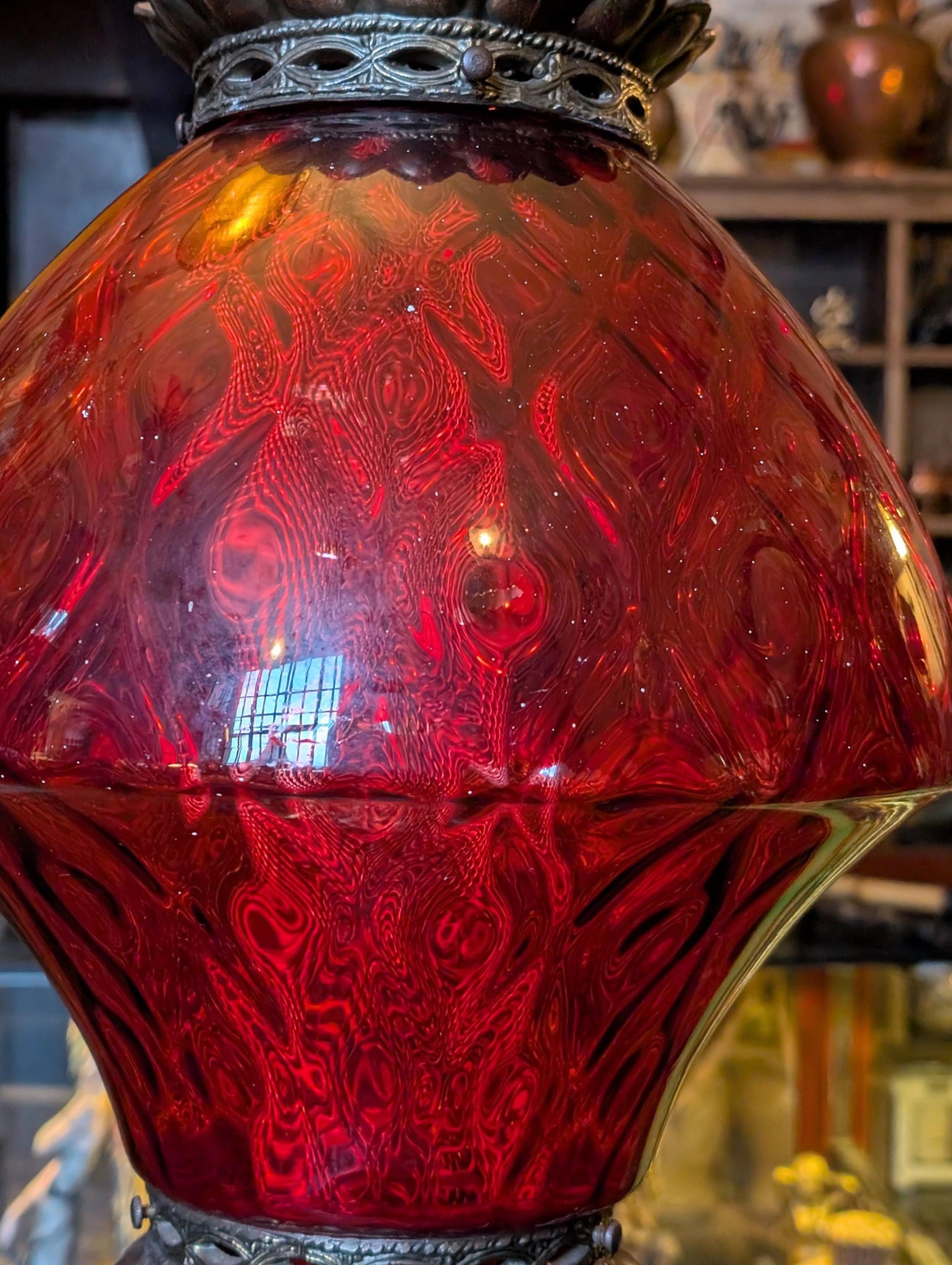 A bold, sculptural Mid-Century statement lamp by Carl Falkenstein, featuring a large ruby red embossed glass shade with gorgeous texture and glow, paired with an ornate metal base with deep relief detail and a lovely aged patina. It’s exactly the kind of piece that’s riding the “dopamine decor” lighting trend—dramatic, saturated colour, and seriously photogenic on a sideboard, bar cart, or bedside table.