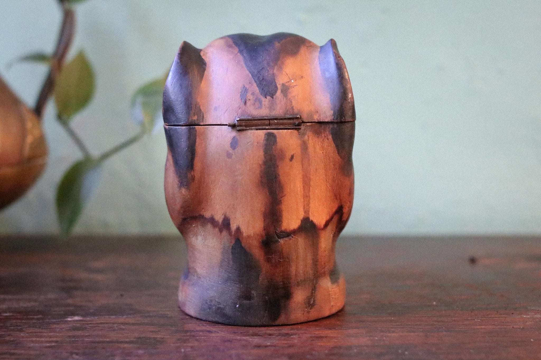 The hinged top opens to reveal a concealed metal inkwell with a second lid, still intact and functional. The wood bears a stunning variegated patina, with darkened areas adding to its dramatic presence. The back and base are smoothly finished, showing the skill of the carver and the age of the piece.