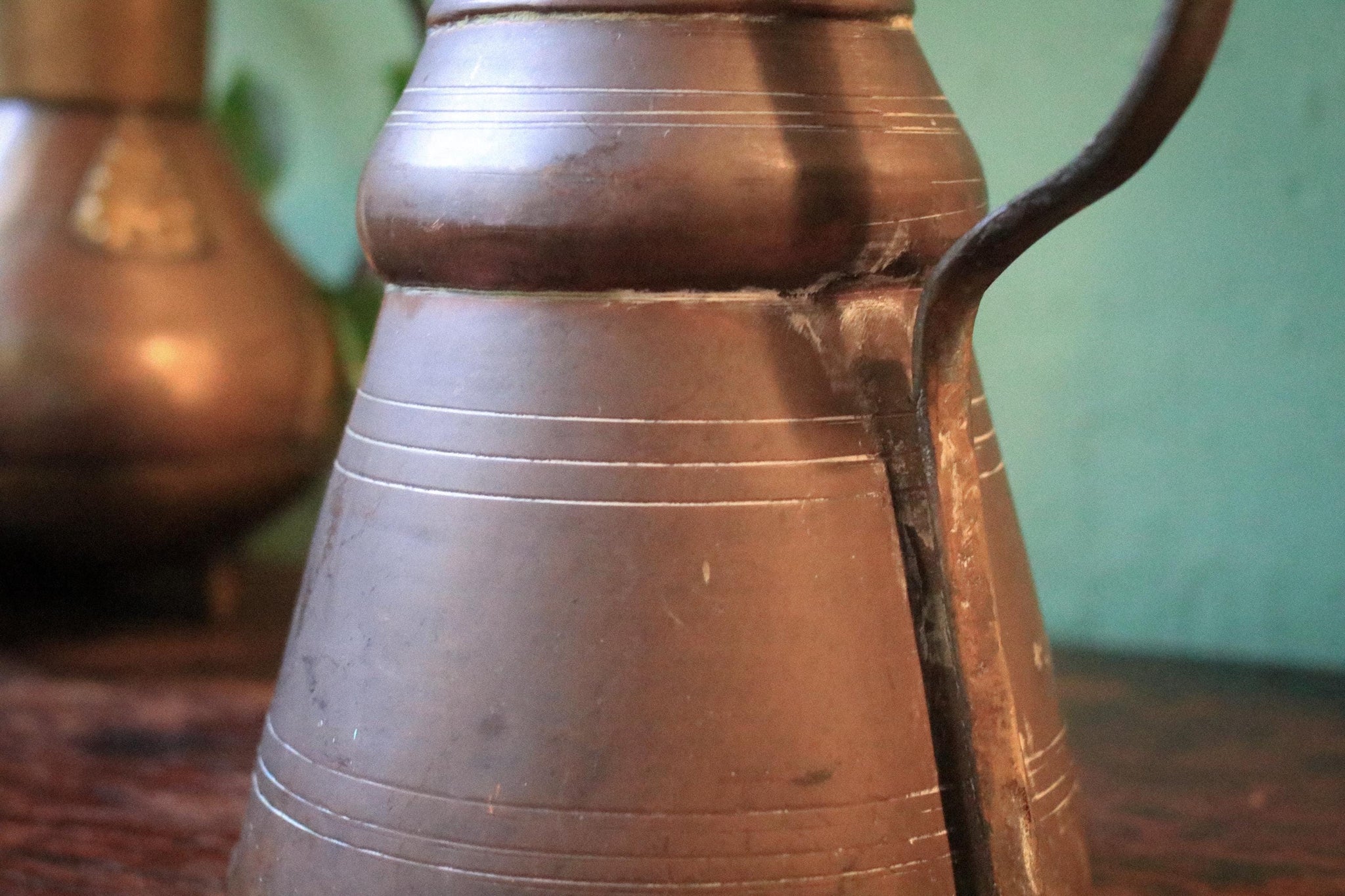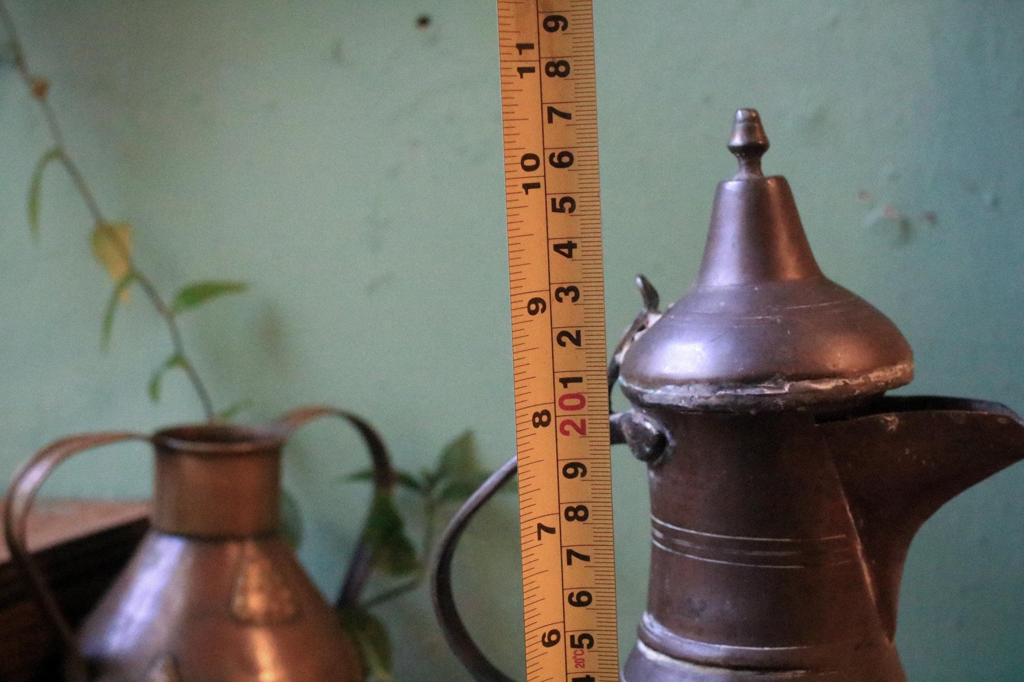This characterful 28cm antique brass dallah-style coffee pot brings a strong sense of history, craftsmanship, and old-world atmosphere. Hand-forged with decorative turned lines around the body, a graceful long spout, and an elegantly arched handle, it has that unmistakable silhouette associated with traditional serving vessels from centuries past.
