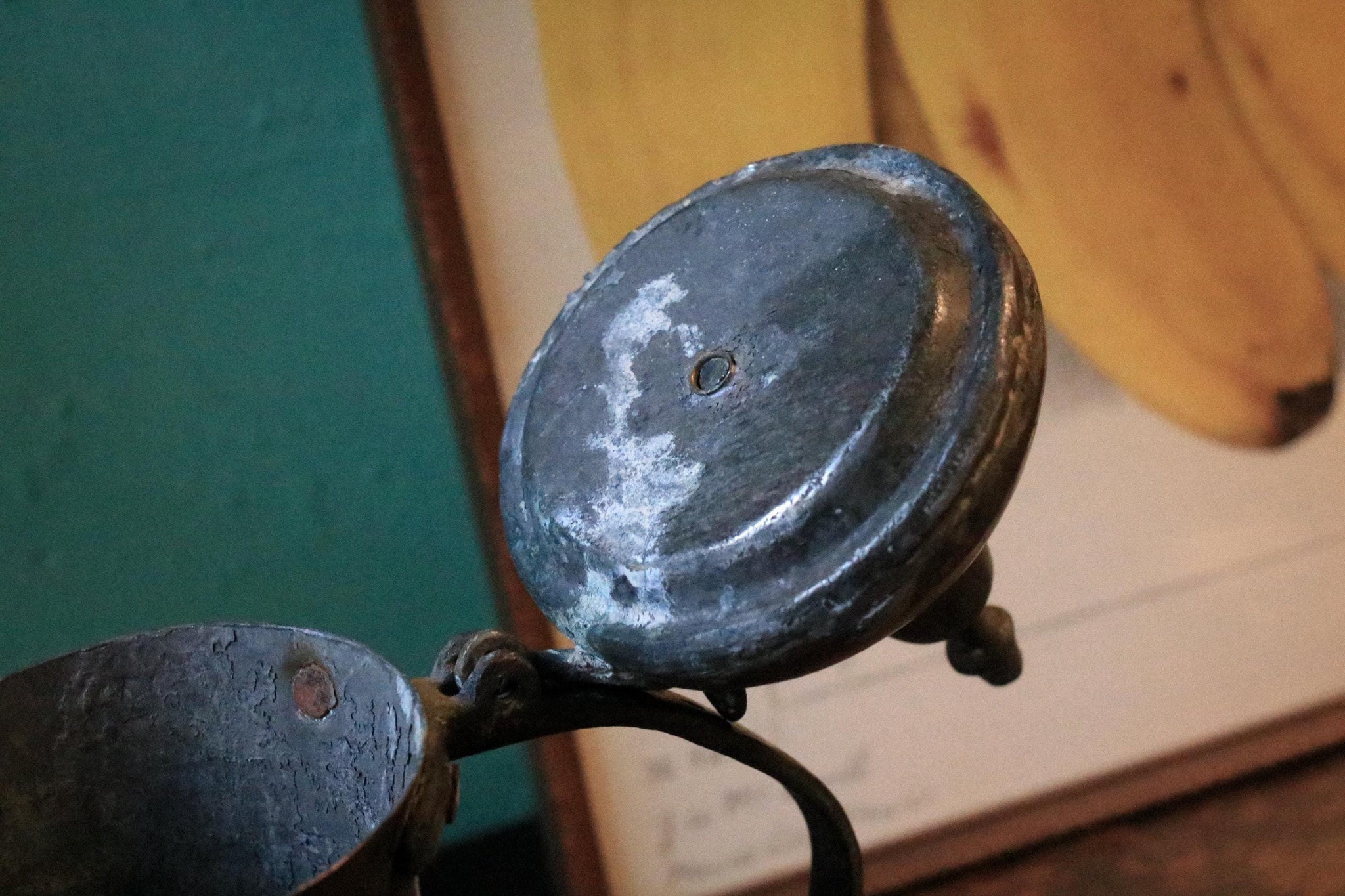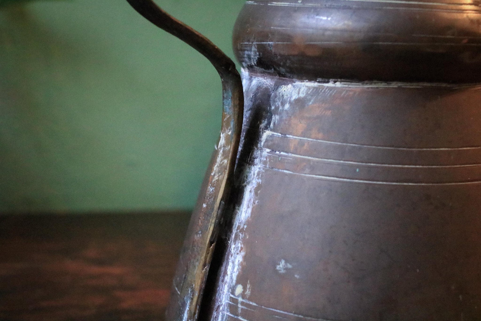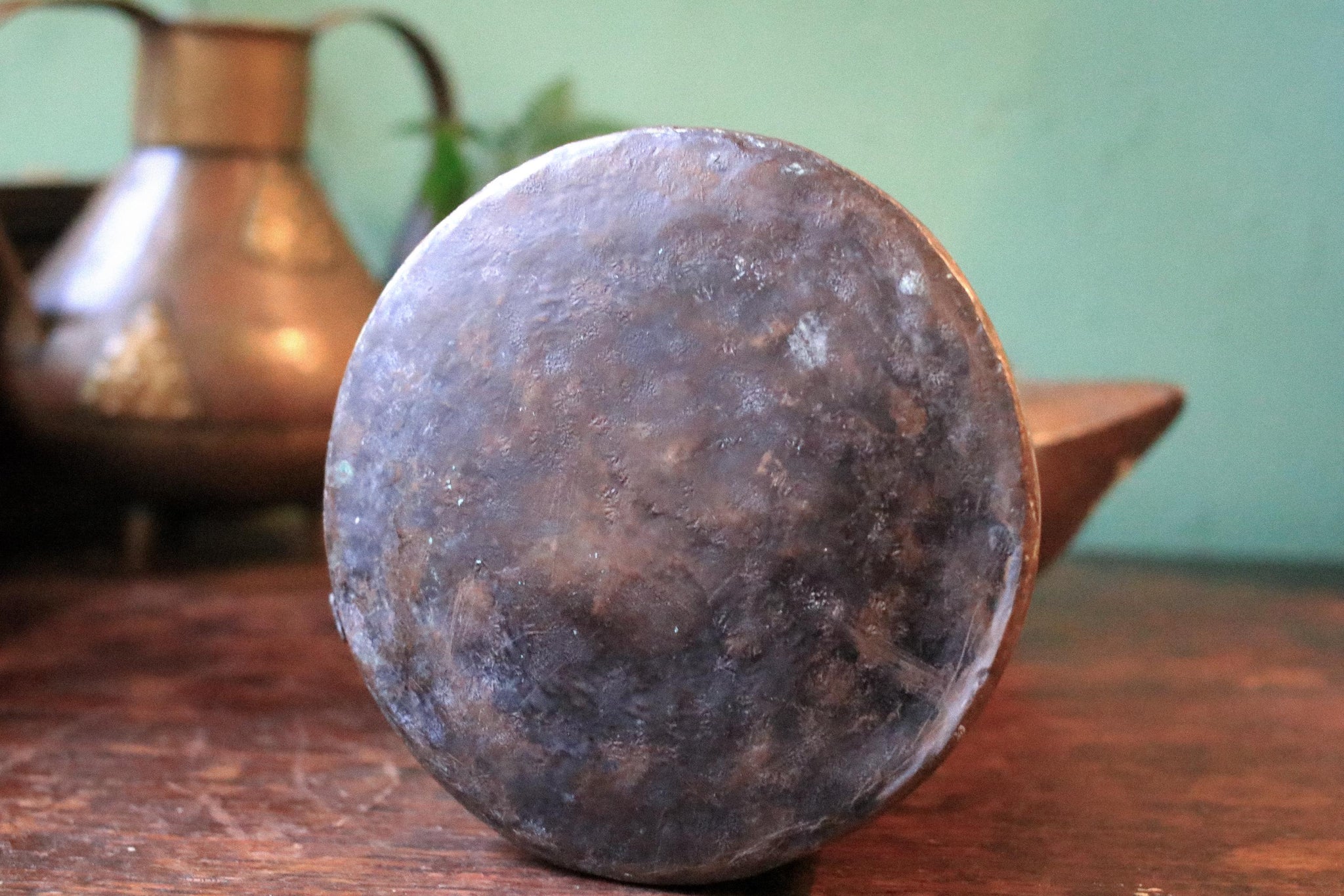 The surface shows extensive patina, oxidation, and wear throughout, including marks around the handle join, wear to the lid and hinge area, and the kind of surface irregularities expected from authentic hand-made metalwork. The lid lifts smoothly, and the piece displays beautifully as a sculptural object, adding depth and texture to maximalist, desert-inspired, wabi-sabi, and curated antique interiors.