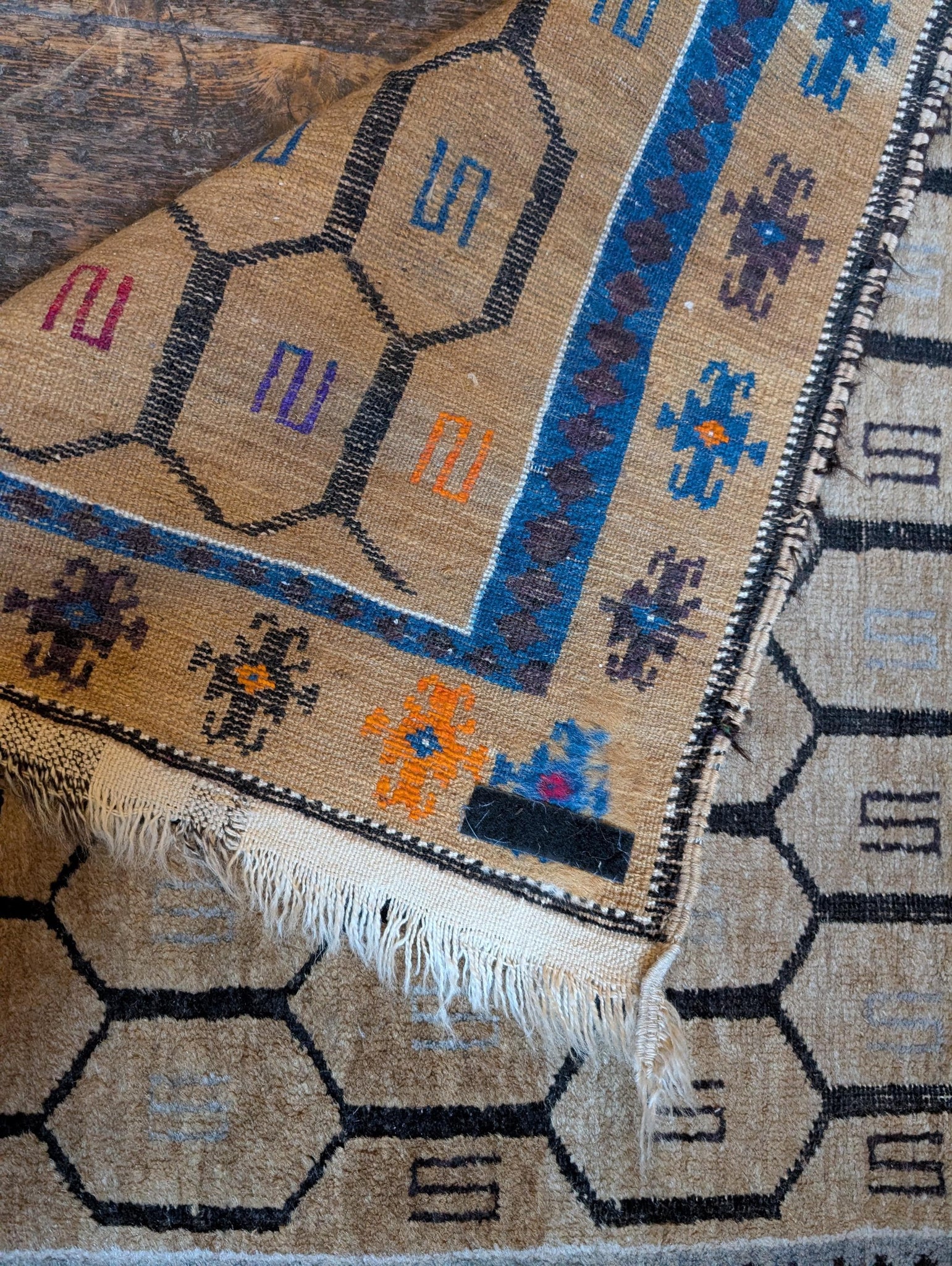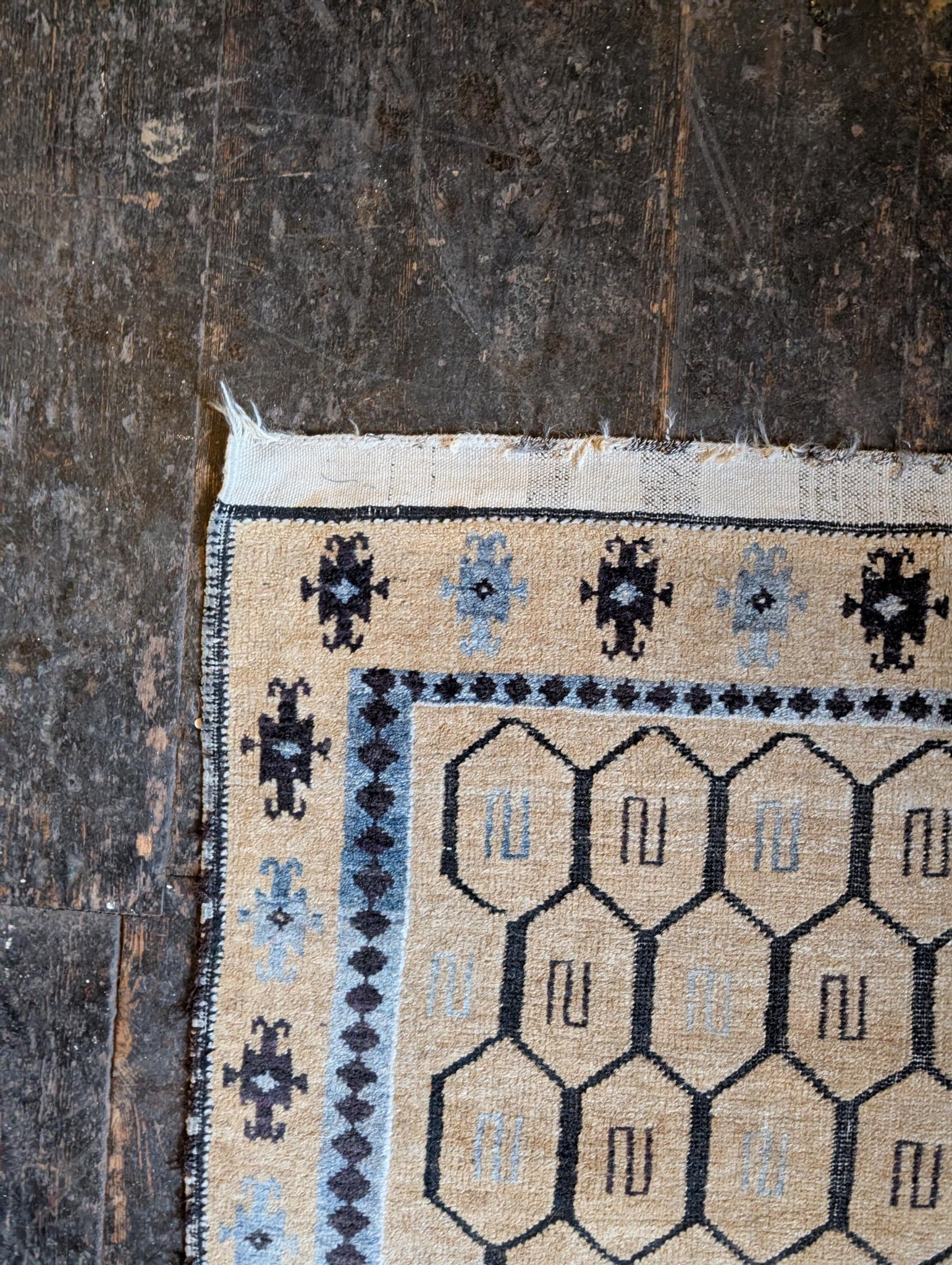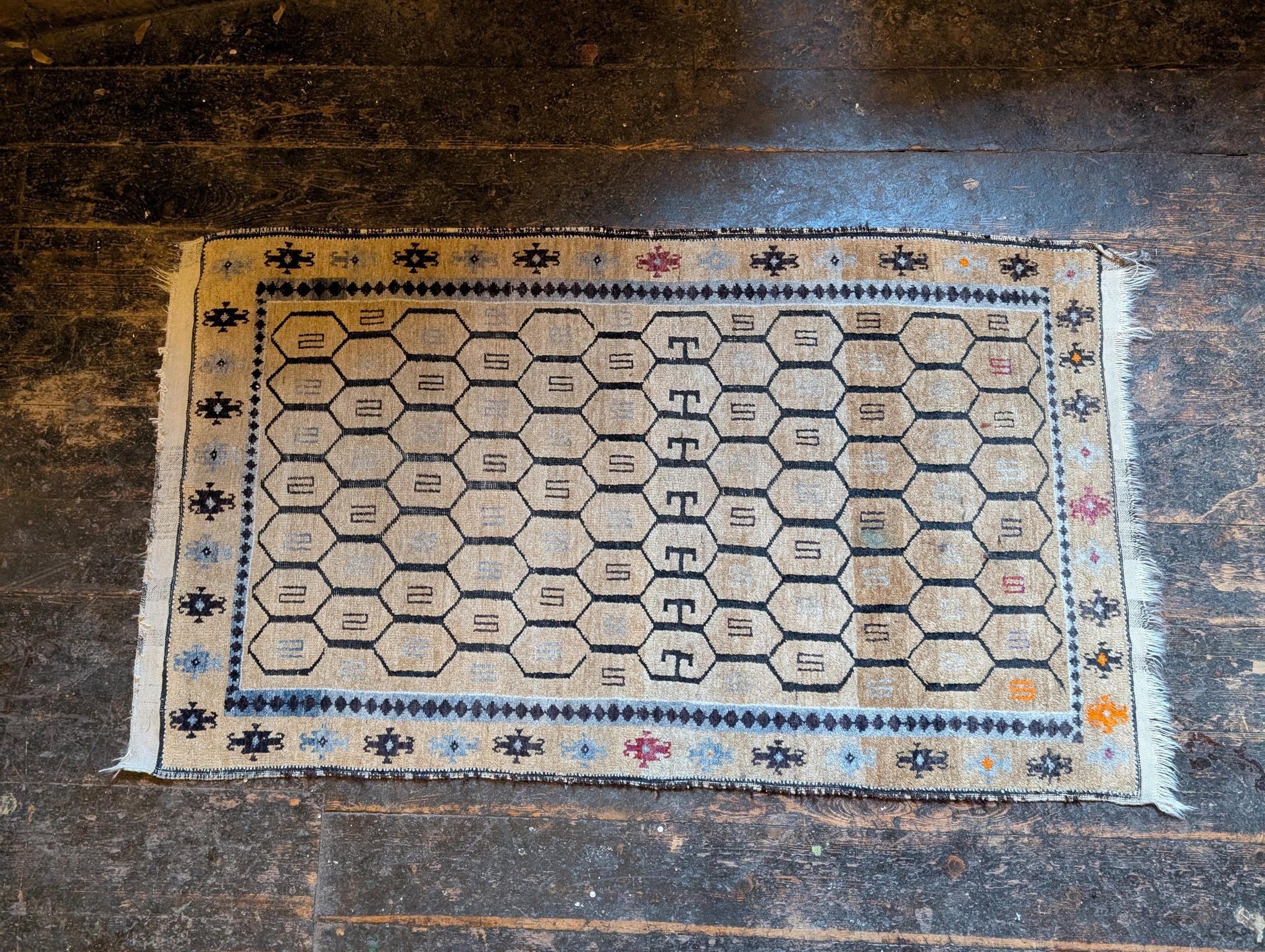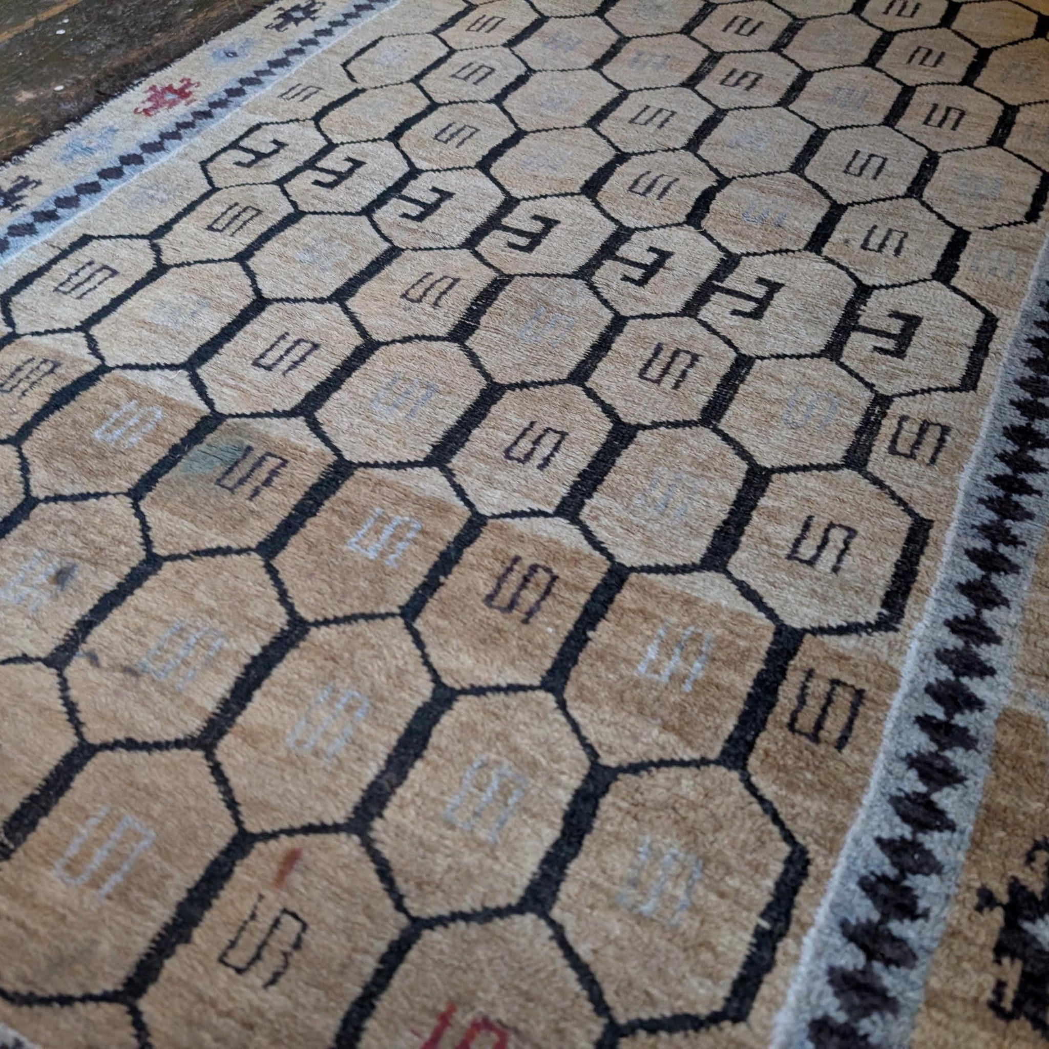 Approx 2'8" x 4'8", this vintage Afghan tribal rug is hand-knotted in wool with a soft, medium-low pile and a beautifully useable size for smaller spaces. The field is laid out in a repeating hexagonal lattice, each compartment holding simple linear motifs, all drawn in charcoal and soft grey on a warm honey-beige ground. The borders carry small tribal star and flower motifs with tiny hits of orange, blue and red, giving just enough colour without losing the calm, neutral feel. It’s a great fit for Japandi, Scandi boho and contemporary cottage interiors where you want pattern and texture but a quieter palette.