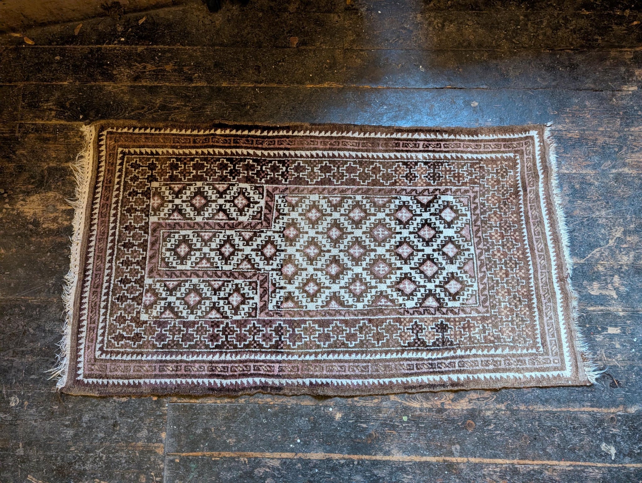 Measures approximately 83 x 151 cm. This is a vintage Afghan Baluch (Baluchi) tribal wool rug with a panelled geometric design.
