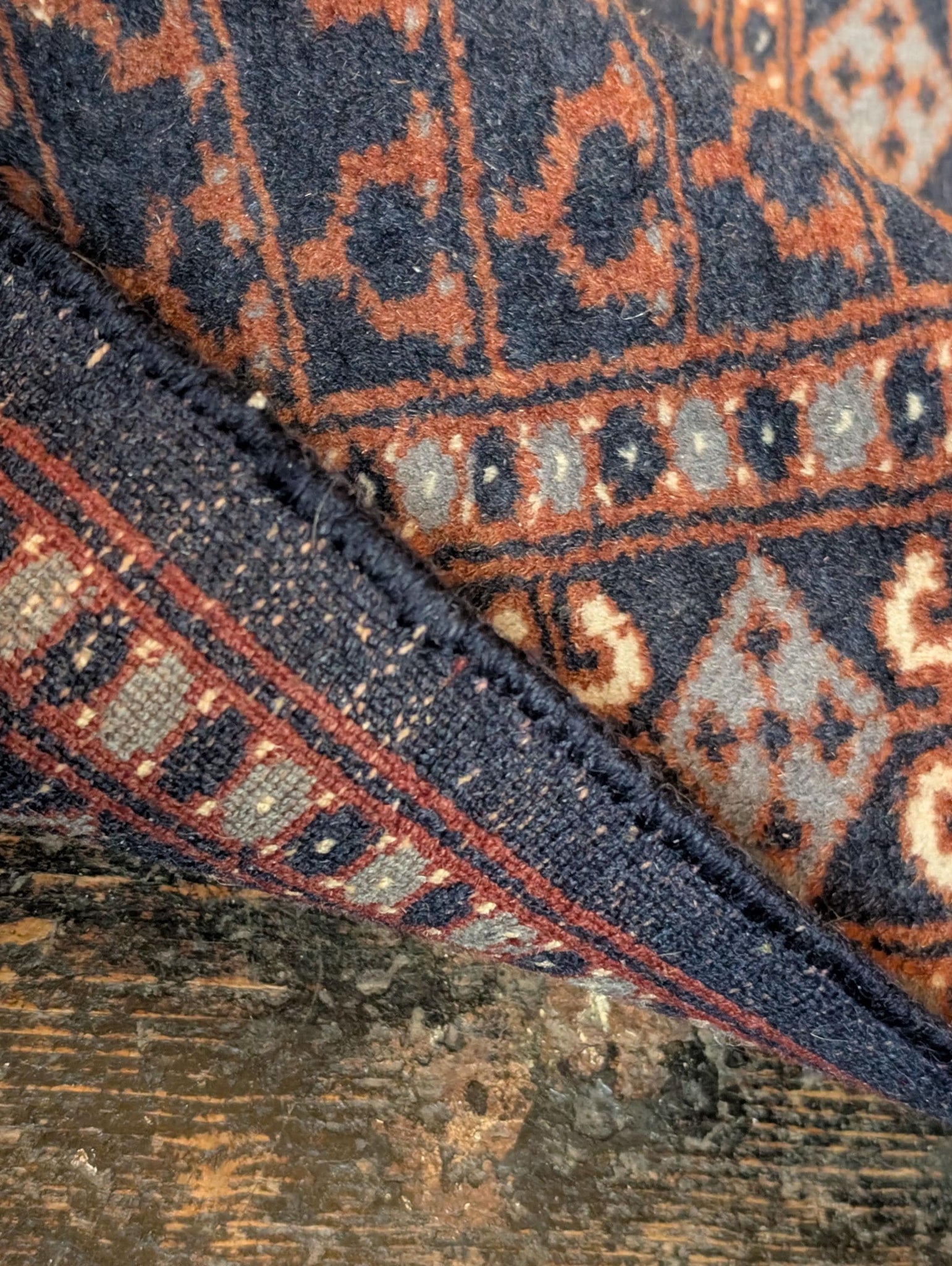 Condition shows honest age wear, including some fringe loss/unevenness to one end and minor edge wear (please see photos). Size: 96 x 65 cm.