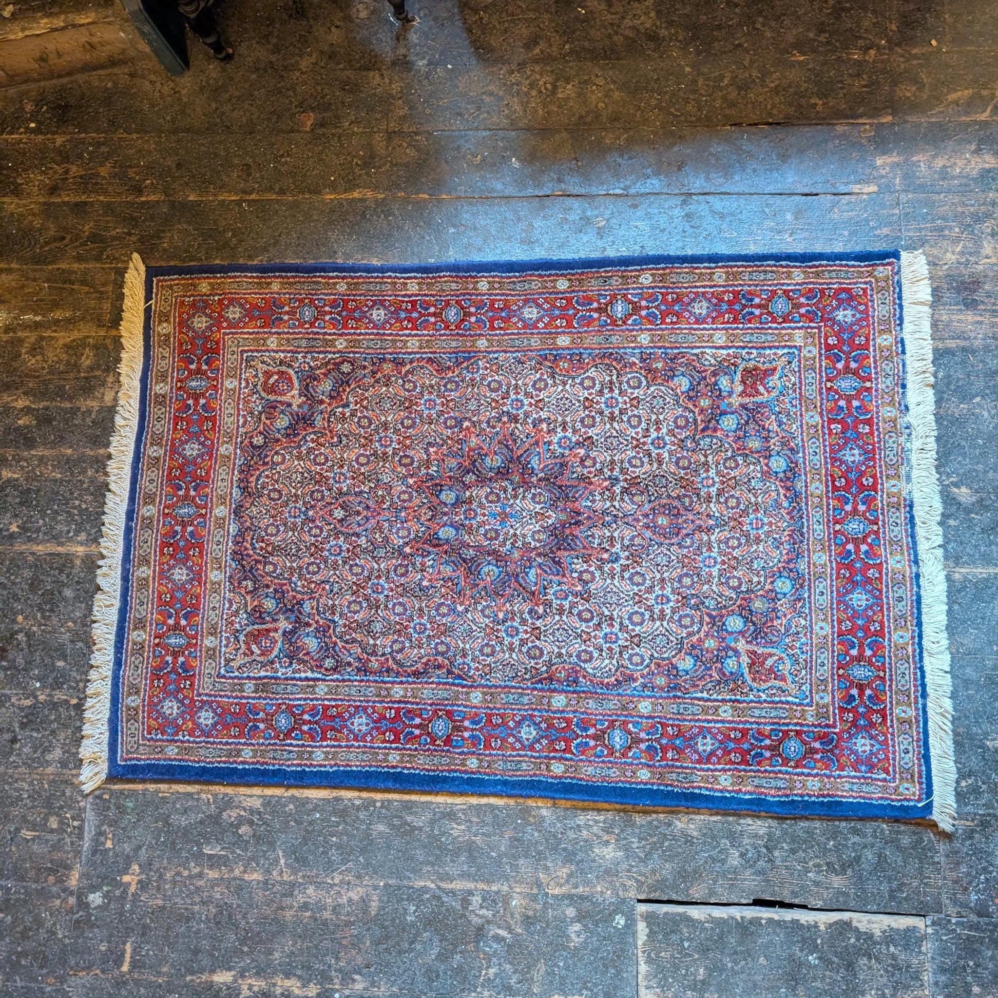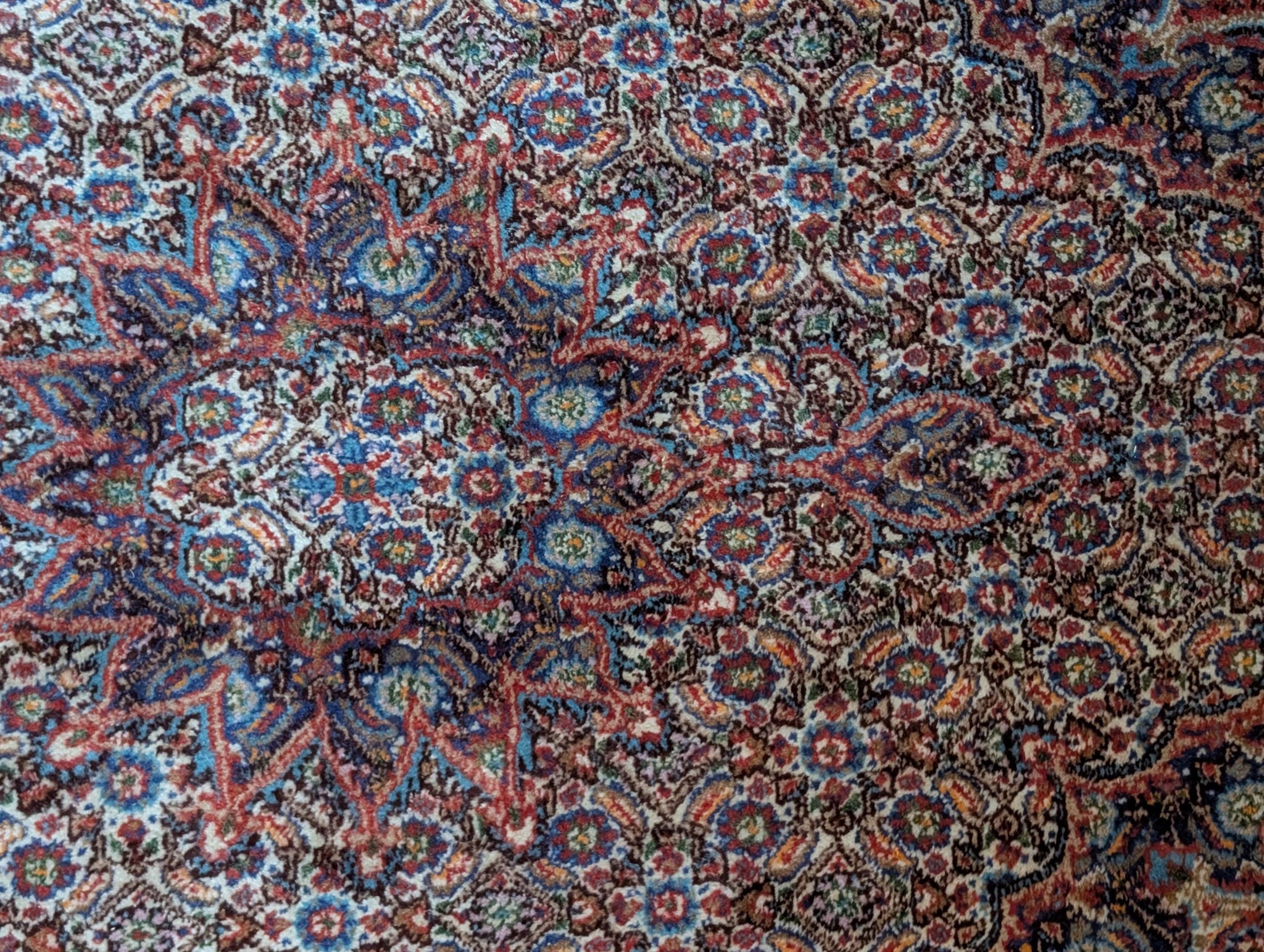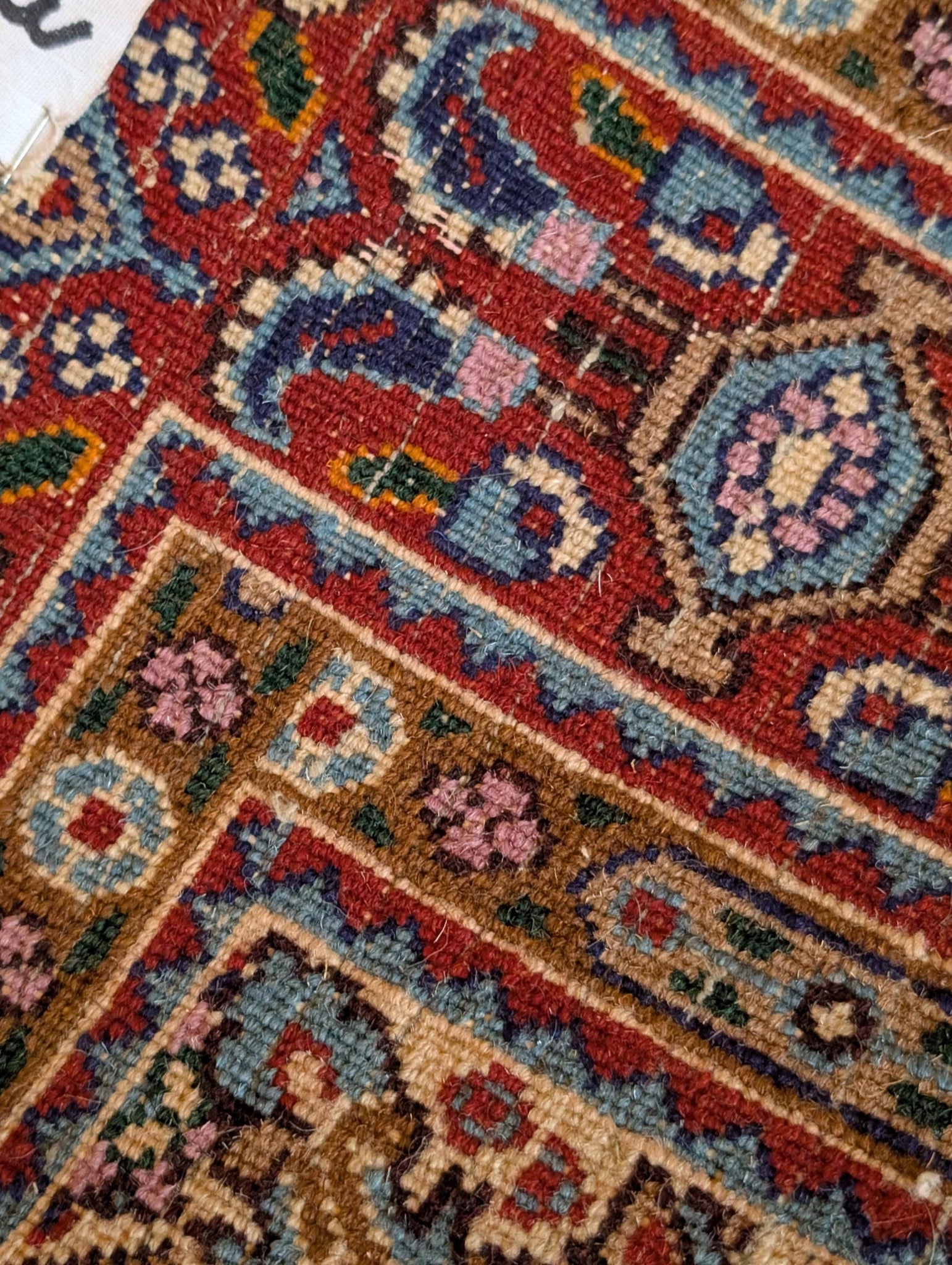 Likely Indo-workshop production (India/Pakistan), late 20th century. Condition appears good overall in the photos with light, even wear consistent with age and use; fringes present, and any minor signs of handling/age are as photographed. The rug is hand-knotted.