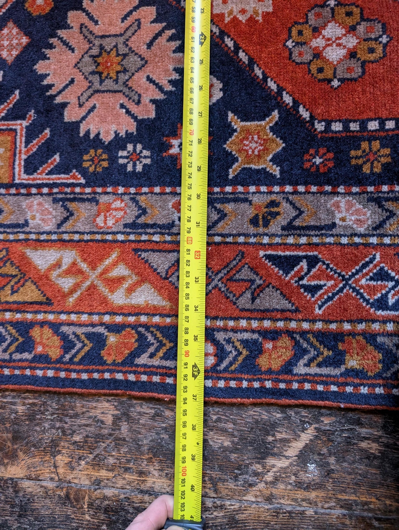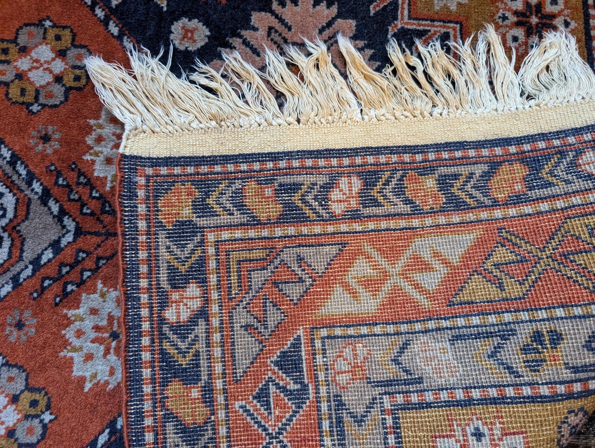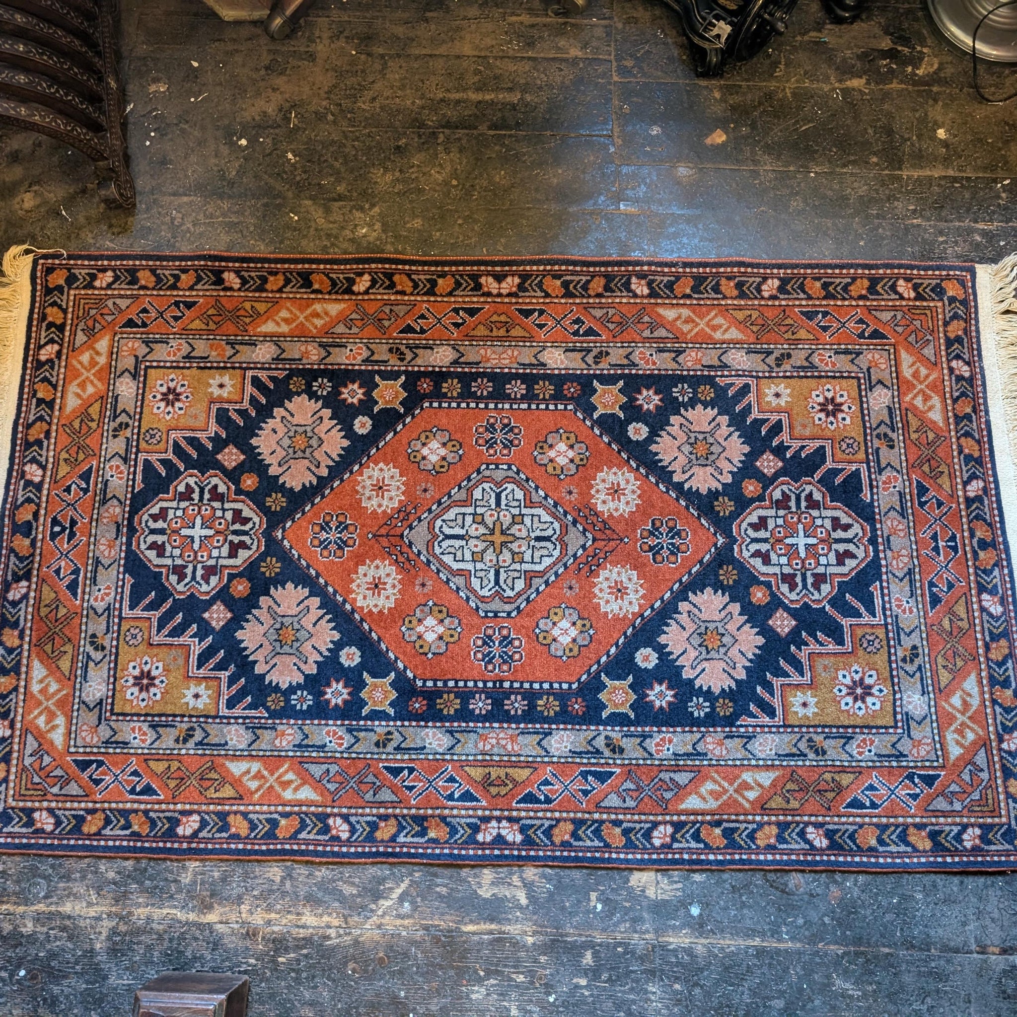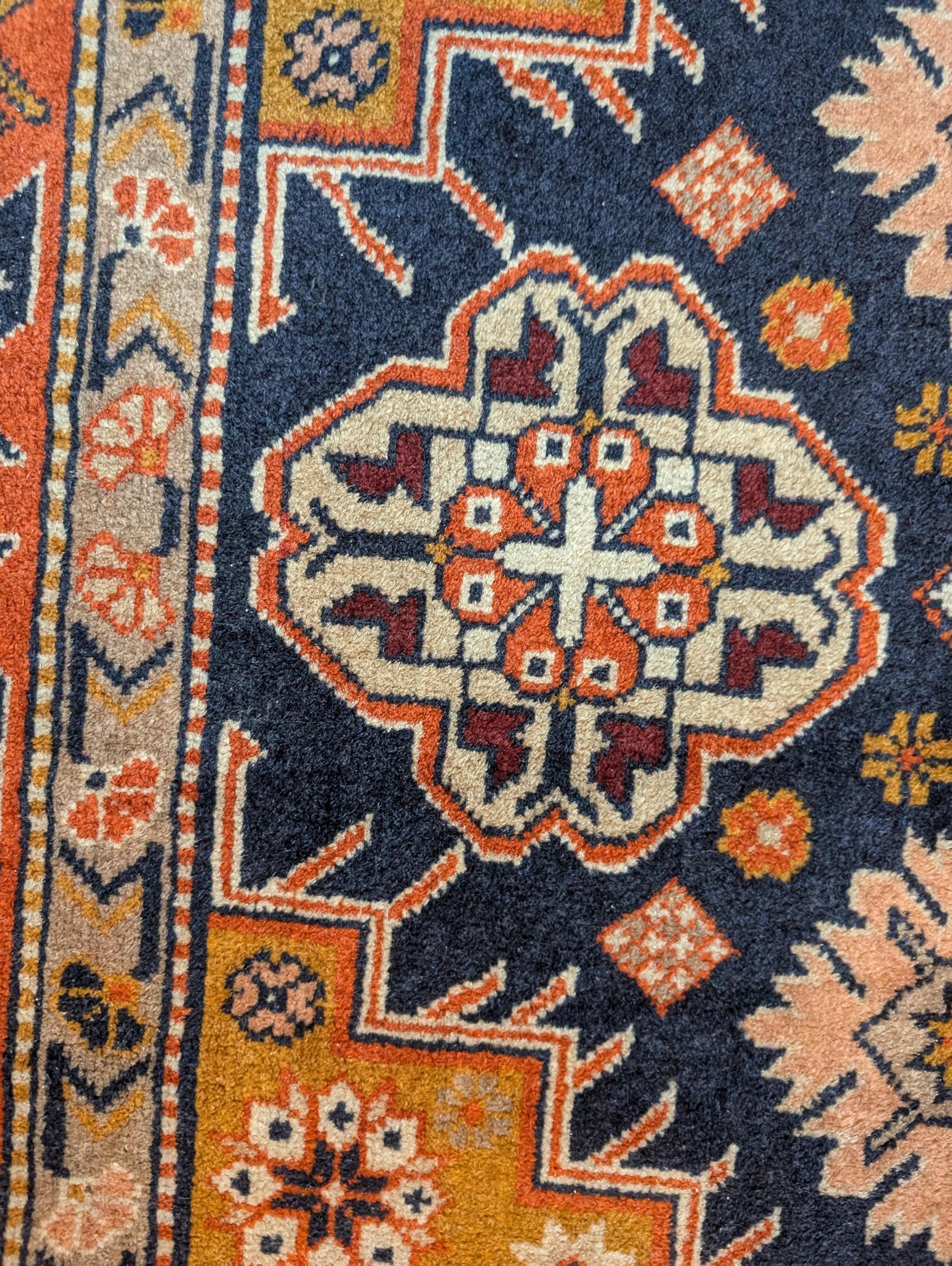 A richly coloured vintage wool rug featuring bold geometric motifs and floral accents. The deep navy blue and brick red tones are beautifully offset by softer cream, mustard and blush elements, arranged around a central medallion. Strong tribal border work completes the look. Hand-knotted and made with natural wool.