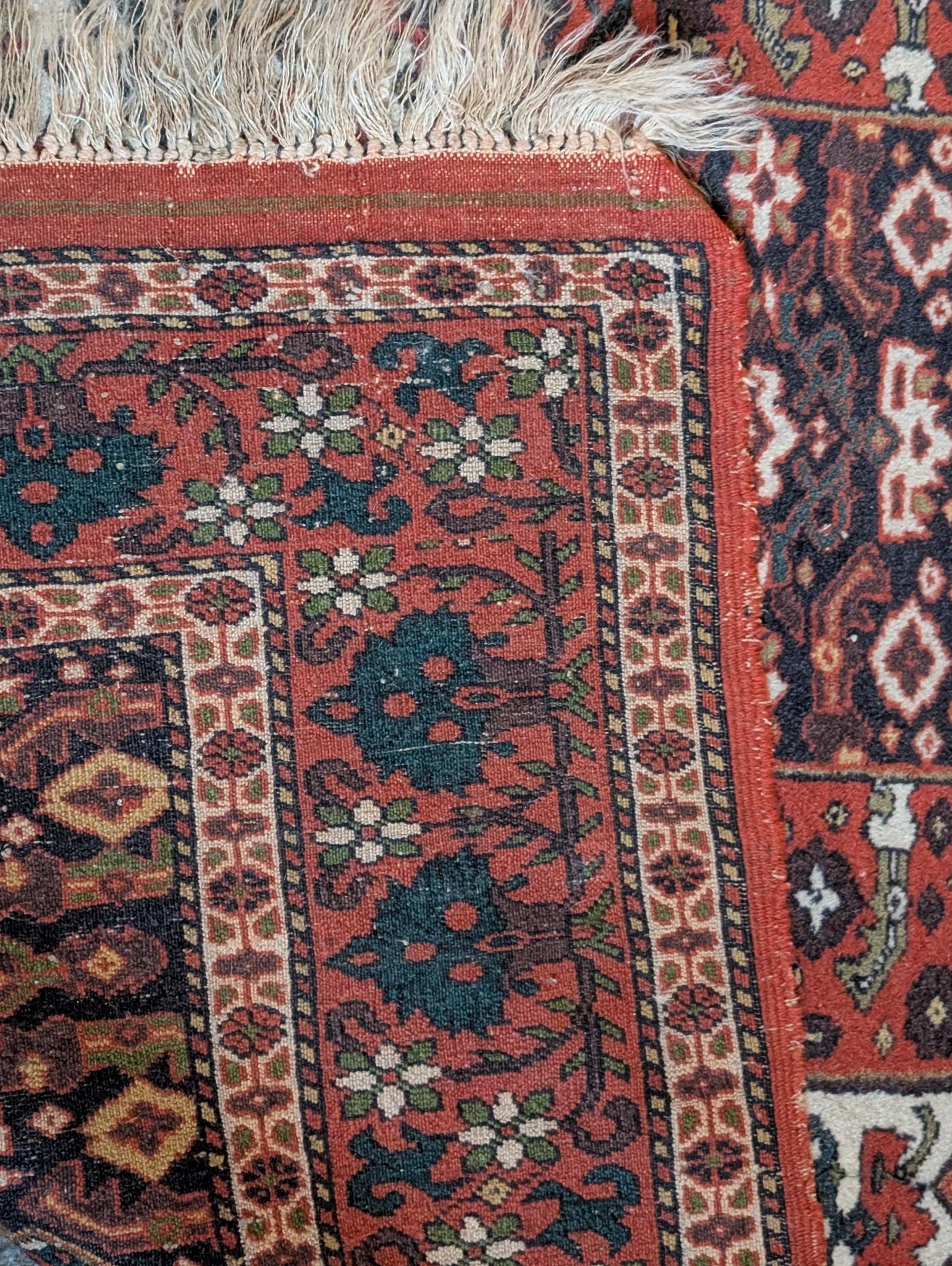 Likely woven in the northwest Middle Eastern highlands in the mid 20th century, this piece has a wool pile on a cotton foundation with a good, dense handle. Condition is very nice, honest vintage: pile is generally even with only light age-related wear, there is some minor fraying and unevenness to the fringes at both ends and a touch of wear along one selvedge plus the usual small marks and colour variation from use, all shown in the photos. No holes or major repairs.