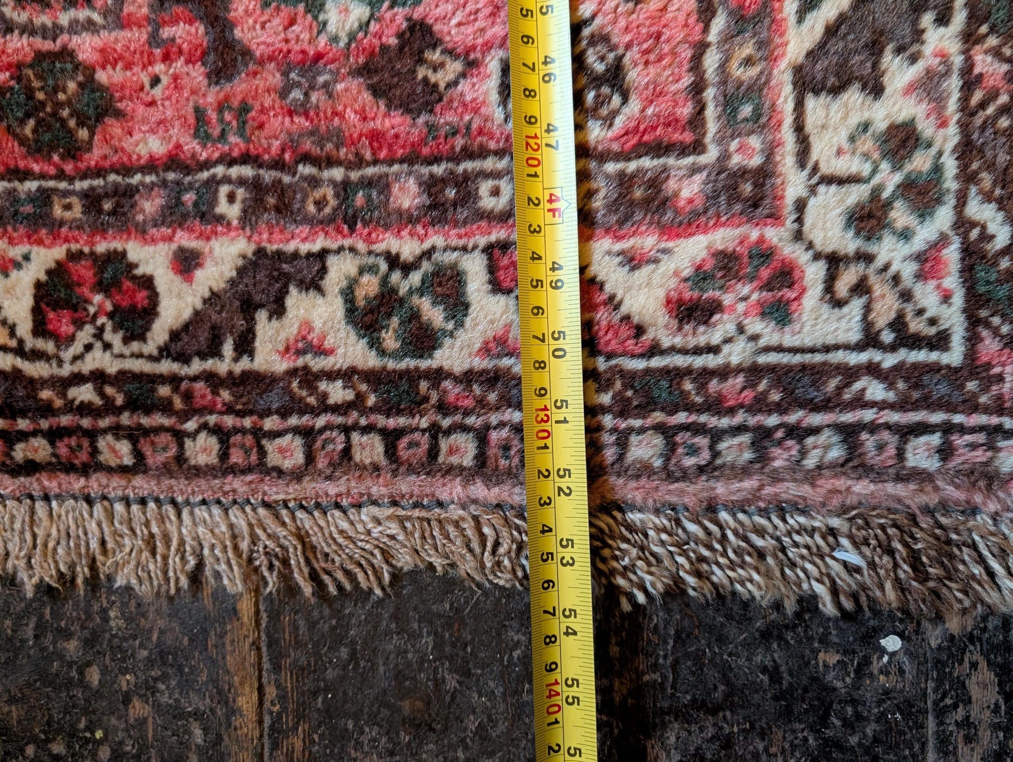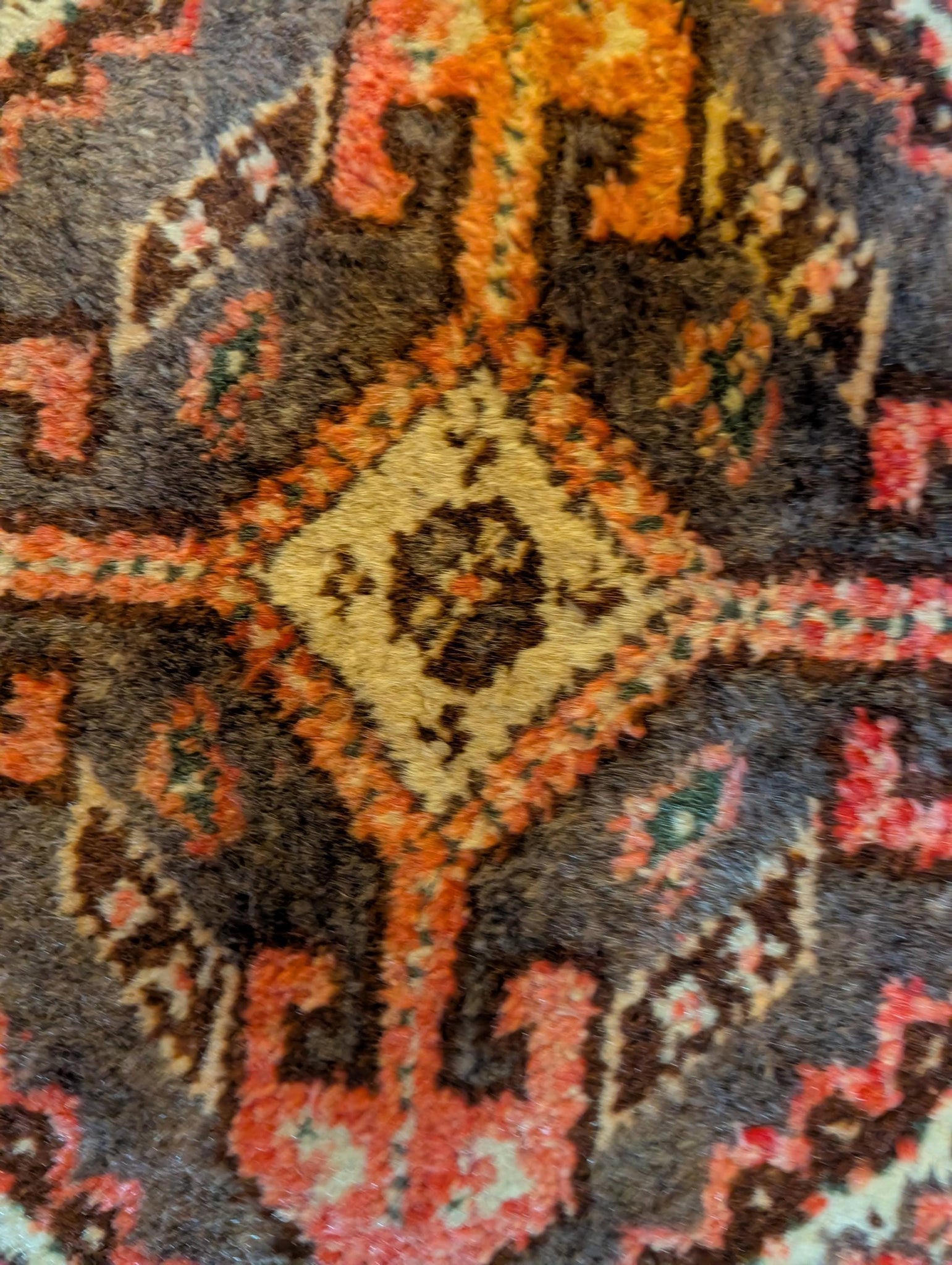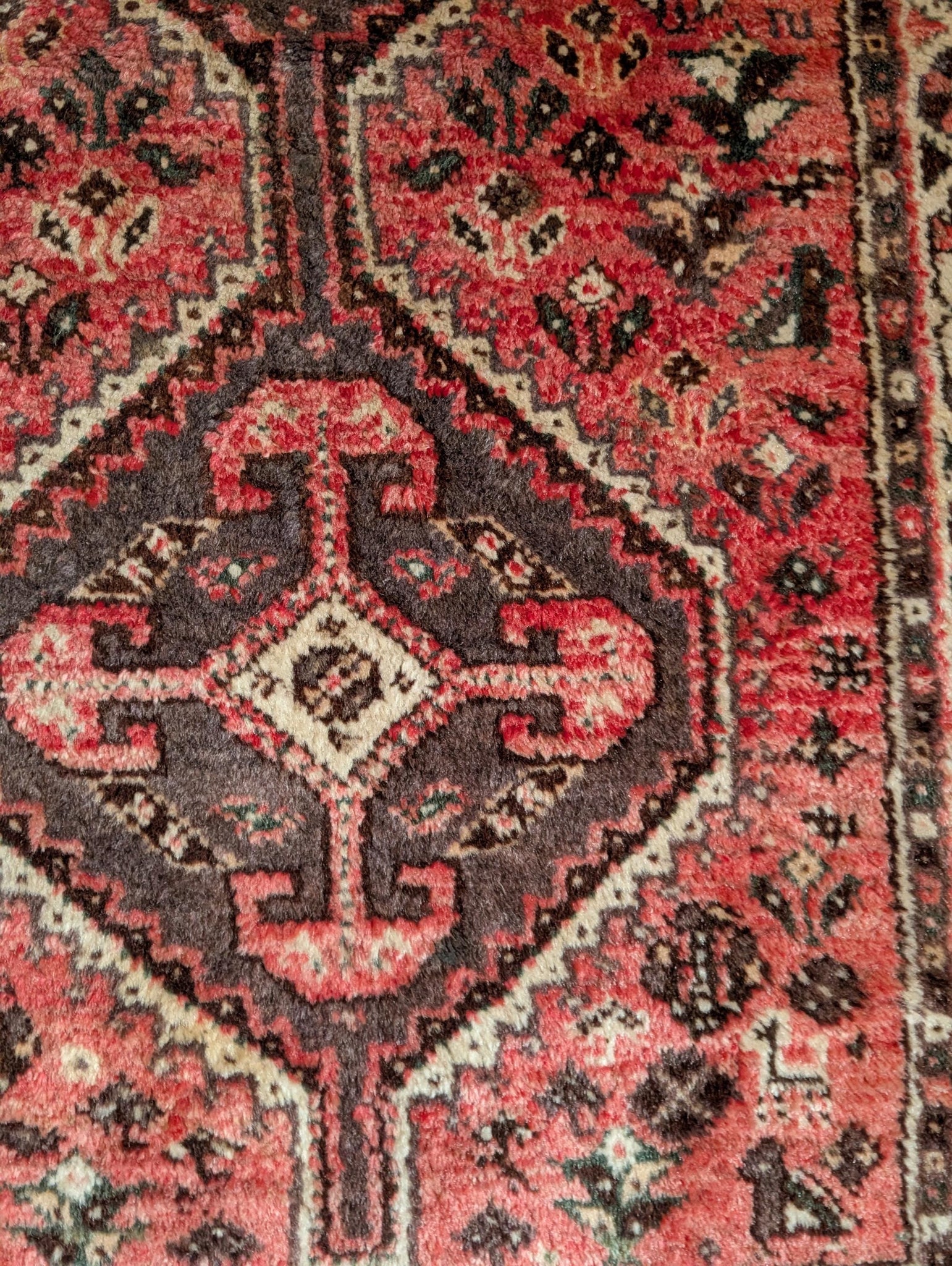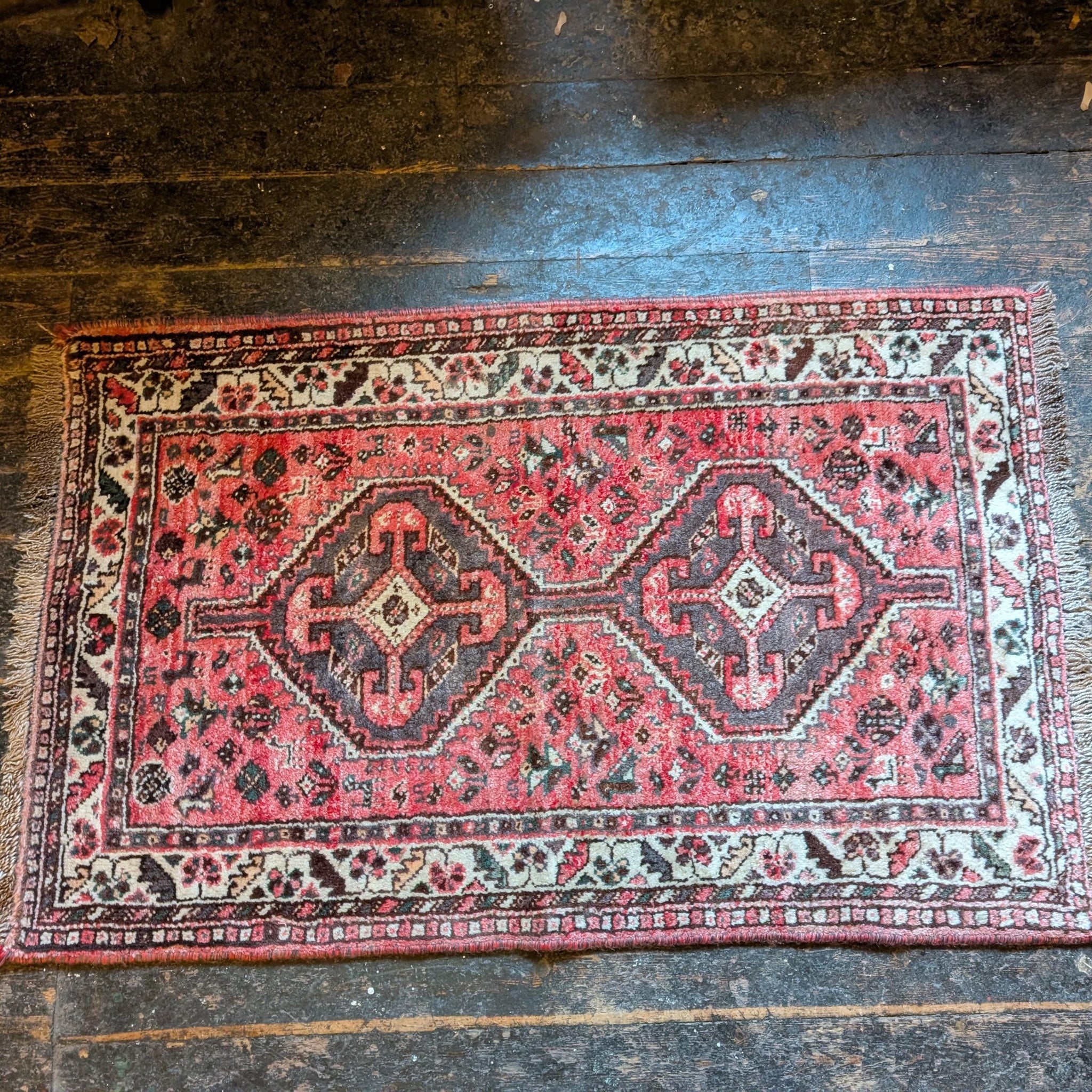 Likely woven in the mid 20th century in the Northwest Middle Eastern highlands, this rug has a wool pile on a cotton foundation with a soft, dense handle. Condition is good, lived-in vintage: age-related wear to the pile with some lower areas, a little abrash in the reds, slight fraying and unevenness to fringes and selvedges and the usual small marks you’d expect from an older handmade piece, but no big holes or structural issues.