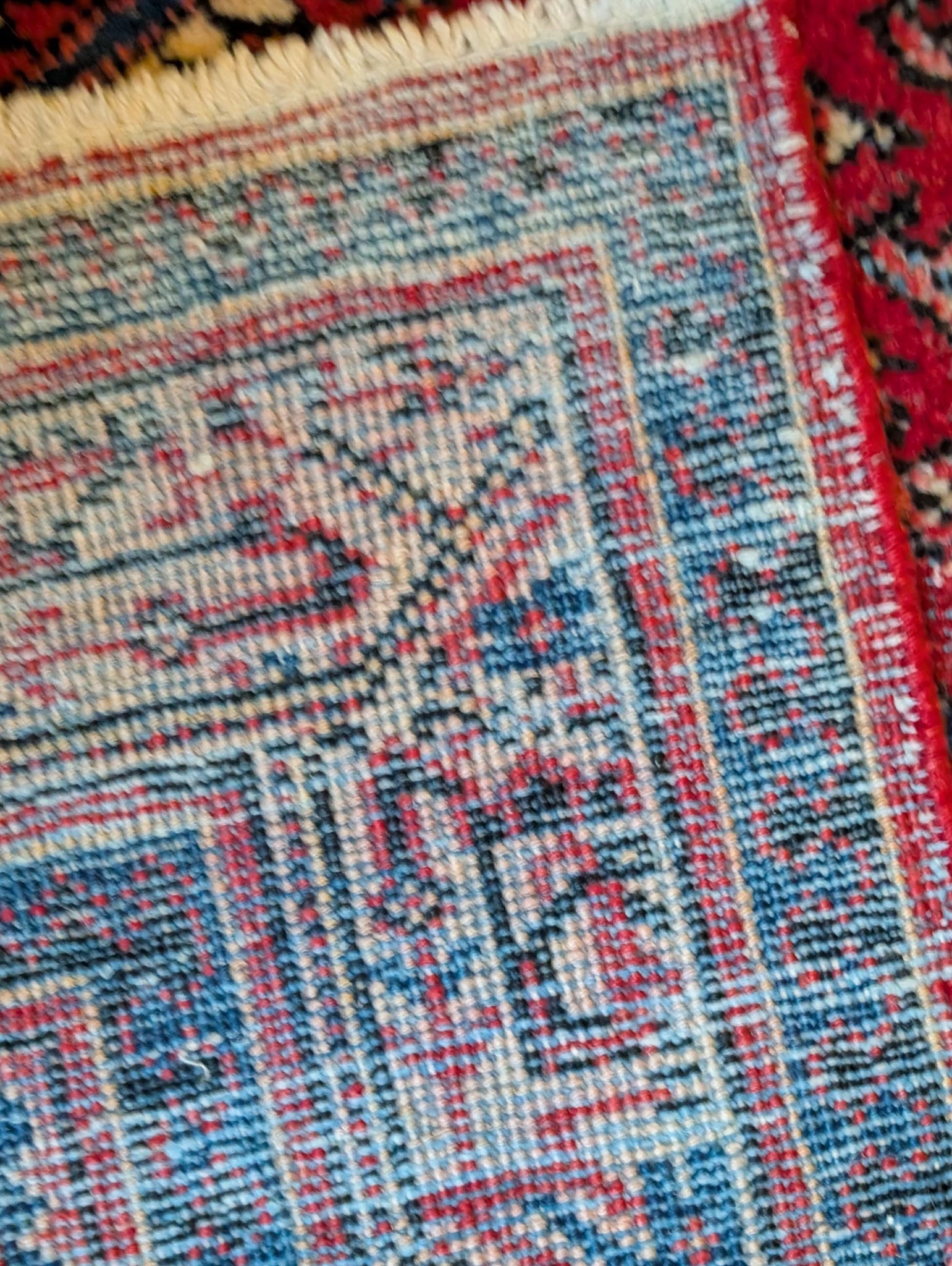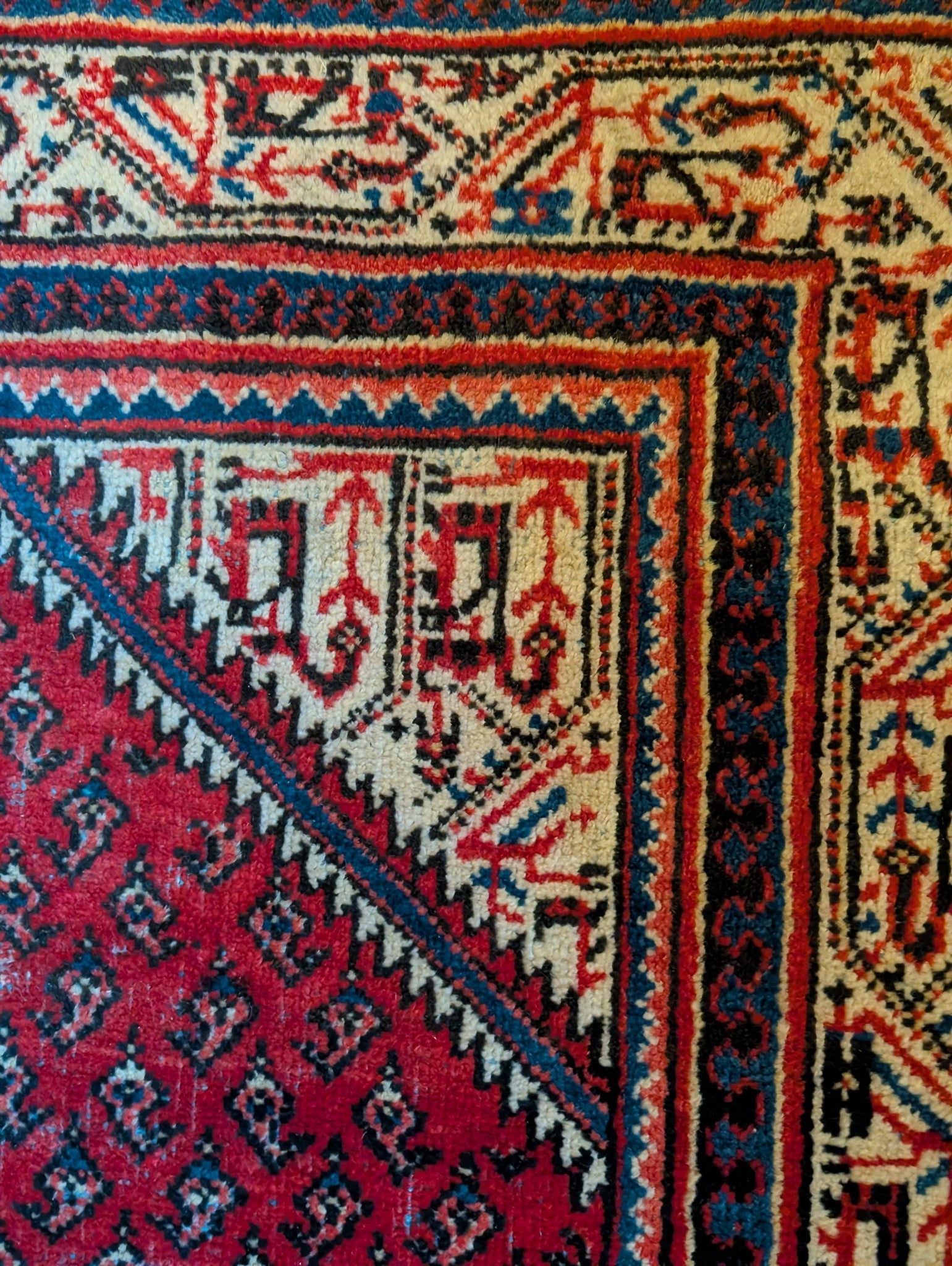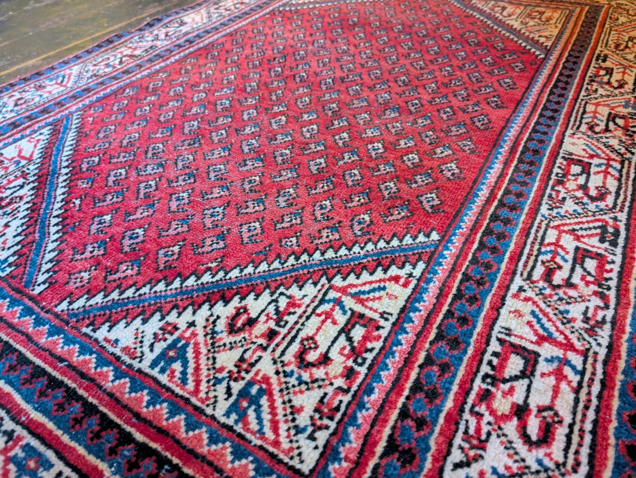 Hand-knotted wool on a sturdy cotton foundation, likely mid 20th century work from the wider Hamadan / Shiraz weaving region. The pile is medium-low and even with some gentle age-softening to the colours, a little abrash (natural colour variation) and small areas of surface wear in the field. Fringes are slightly frayed and uneven and there is minor rubbing to the selvedges, all shown in the photos and reflected in the price. Recently surface-cleaned and ready to use; as with all vintage rugs, a deeper professional clean is always an option if preferred.