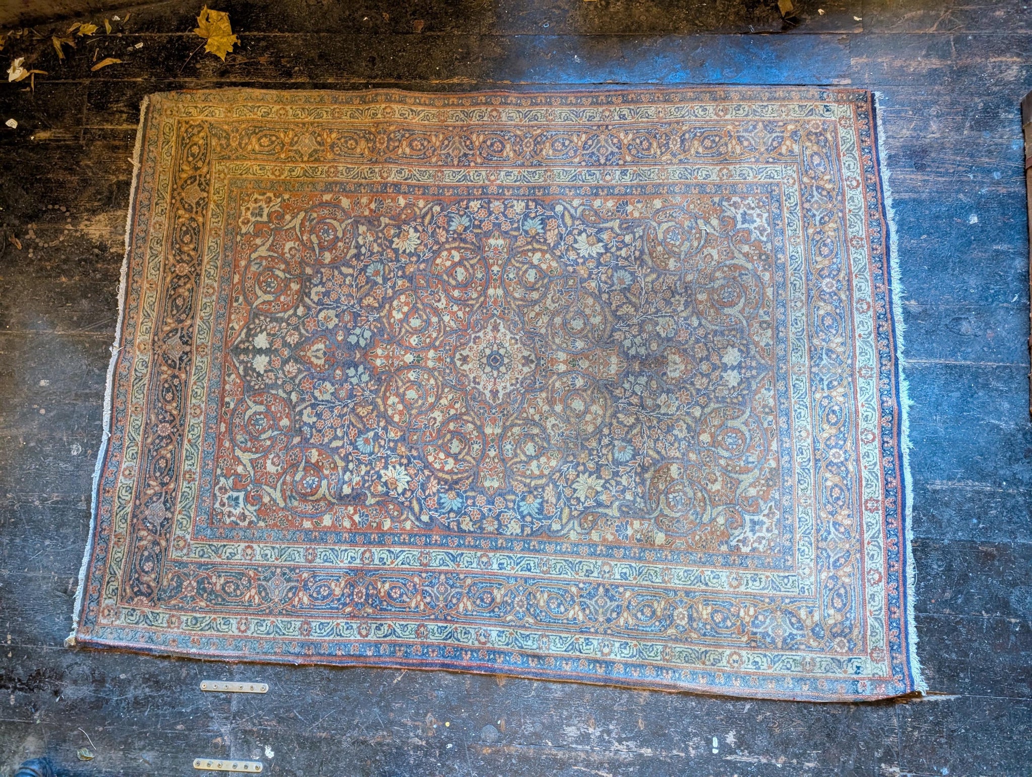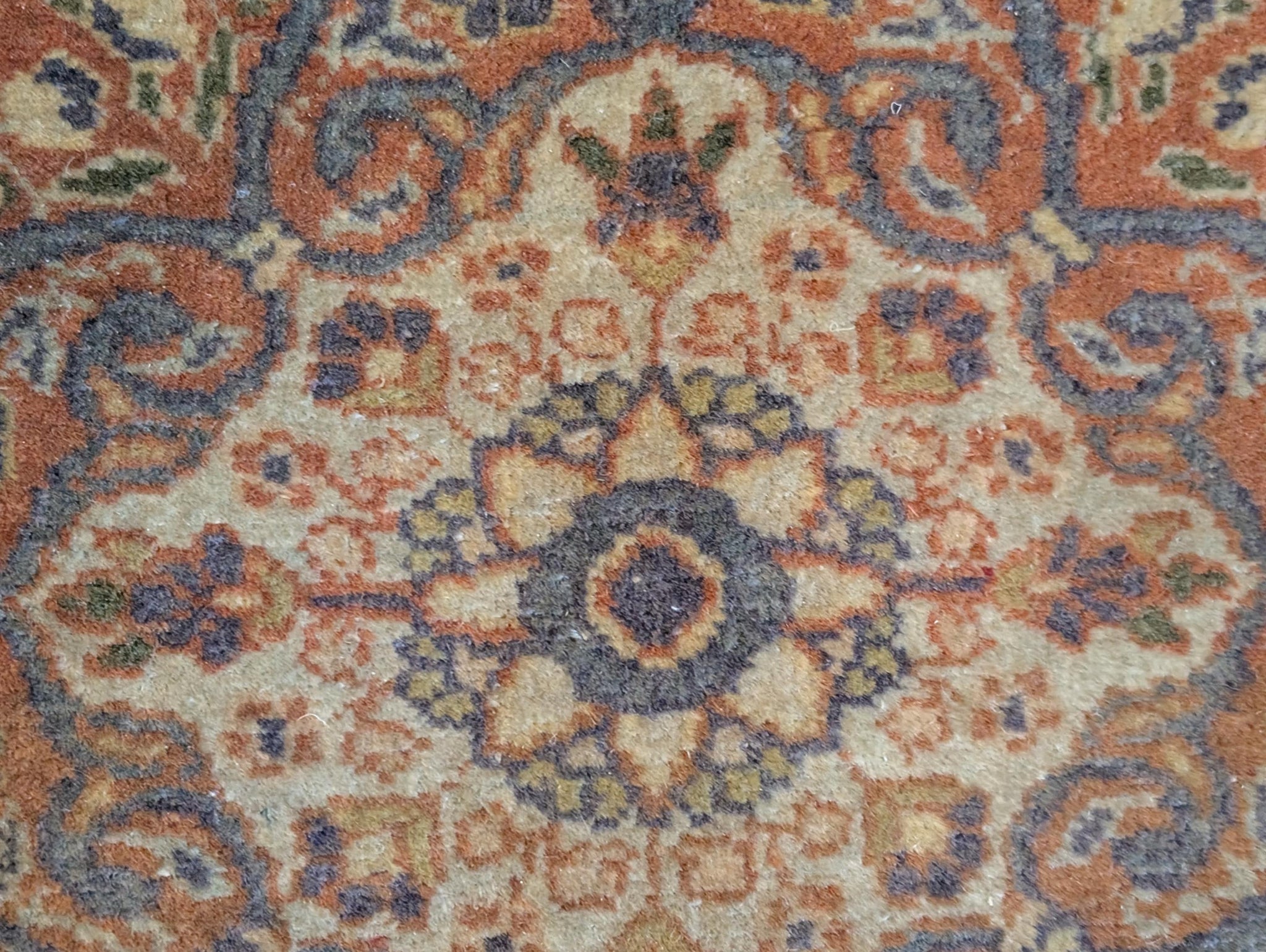This measures 6'1" x 4'8". A beautifully detailed city-weave, Kashan-style floral medallion with scrolling palmettes and rosettes across a soft indigo field framed by terracotta and cream guard borders. The palette has mellowed into that sought-after, old-money look—perfect for a library, dressing room, or layered maximalist scheme. Hand-knotted wool, mid–late 20th century, with refined, curvilinear drawing and multiple rosette borders that read effortlessly elegant.