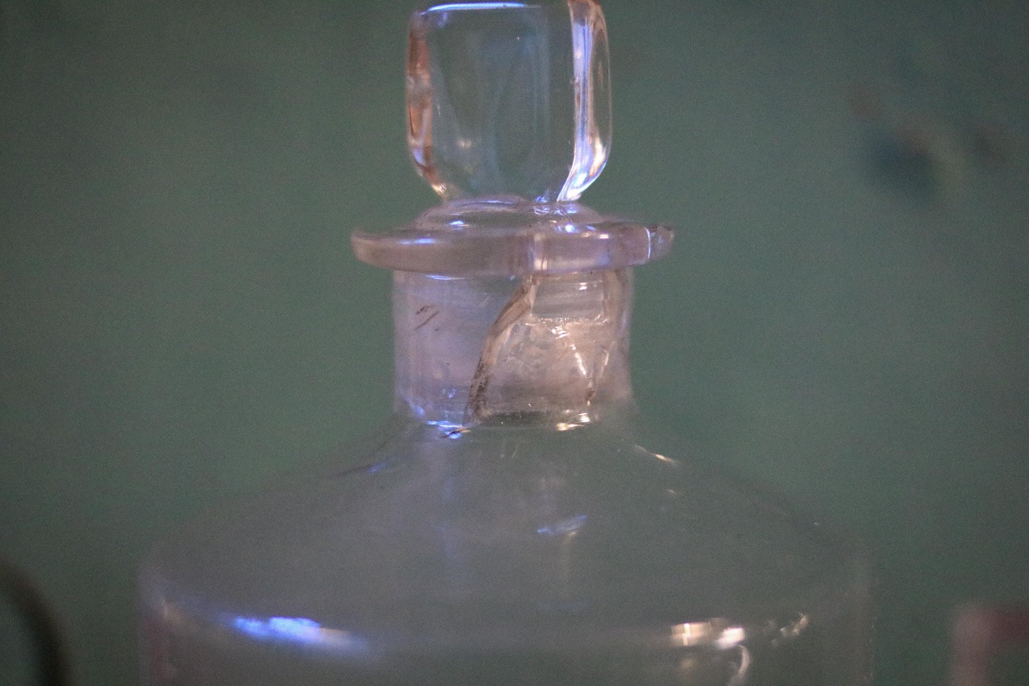 A handsome set of three antique apothecary/pharmacy bottles in clear glass, each with its original fitted stopper and remnants of old printed labels with Latin abbreviations. They’ve got that instantly convincing “old world laboratory” feel that’s everywhere right now in dark academia, apothecarycore, and cabinet-of-curiosities styling—perfect on a bookshelf, in a bathroom vignette, on a bar cart, or staged with dried botanicals and antique books.