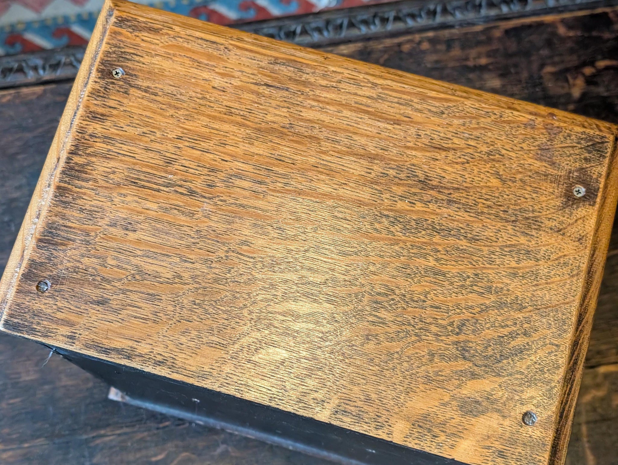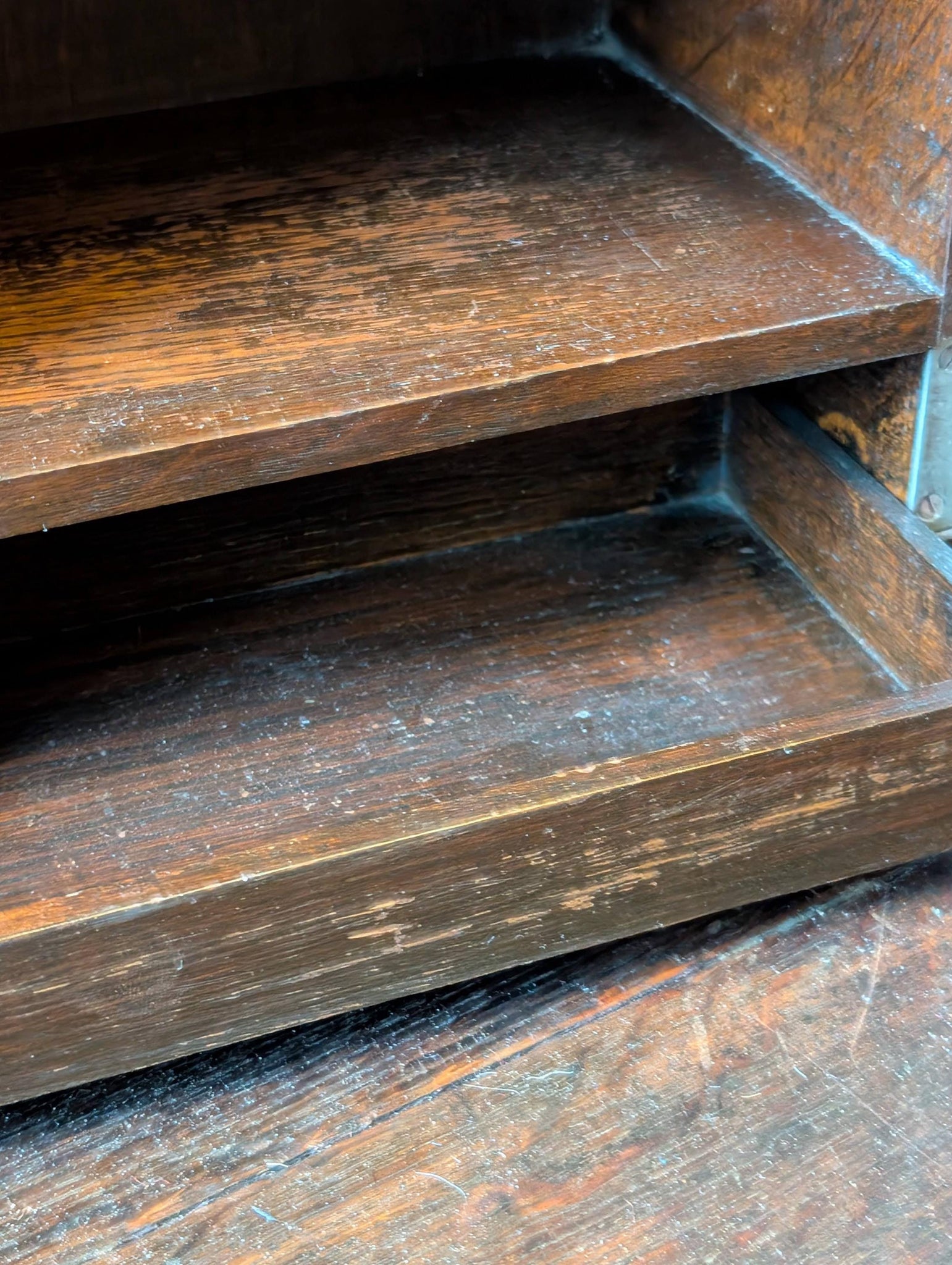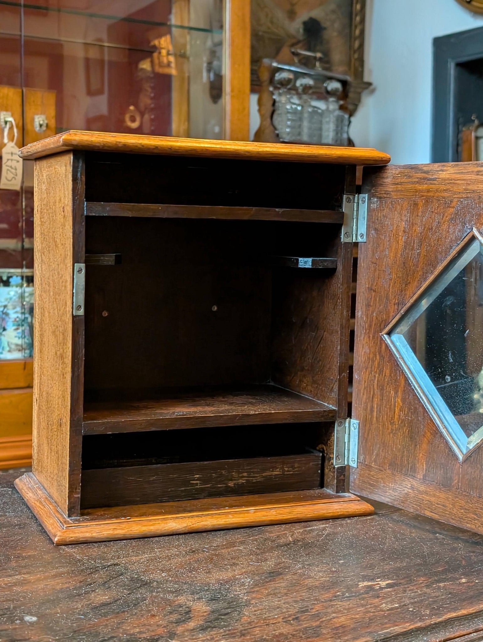 Inside is a fixed shelf creating two compartments for tins, jars or small bottles, with a narrow base ledge below. The cabinet stands at around 30cm tall (approximately 11.8"), compact enough for a desk or sideboard but substantial enough to make a statement on its own or as part of a bar set-up. The oak has a warm, honeyed tone and visible grain that sits well alongside other antique and vintage pieces.