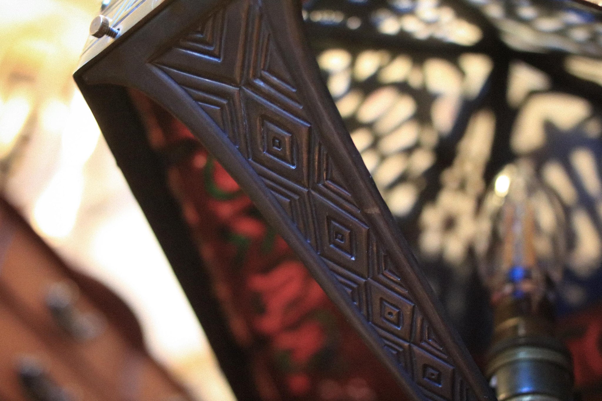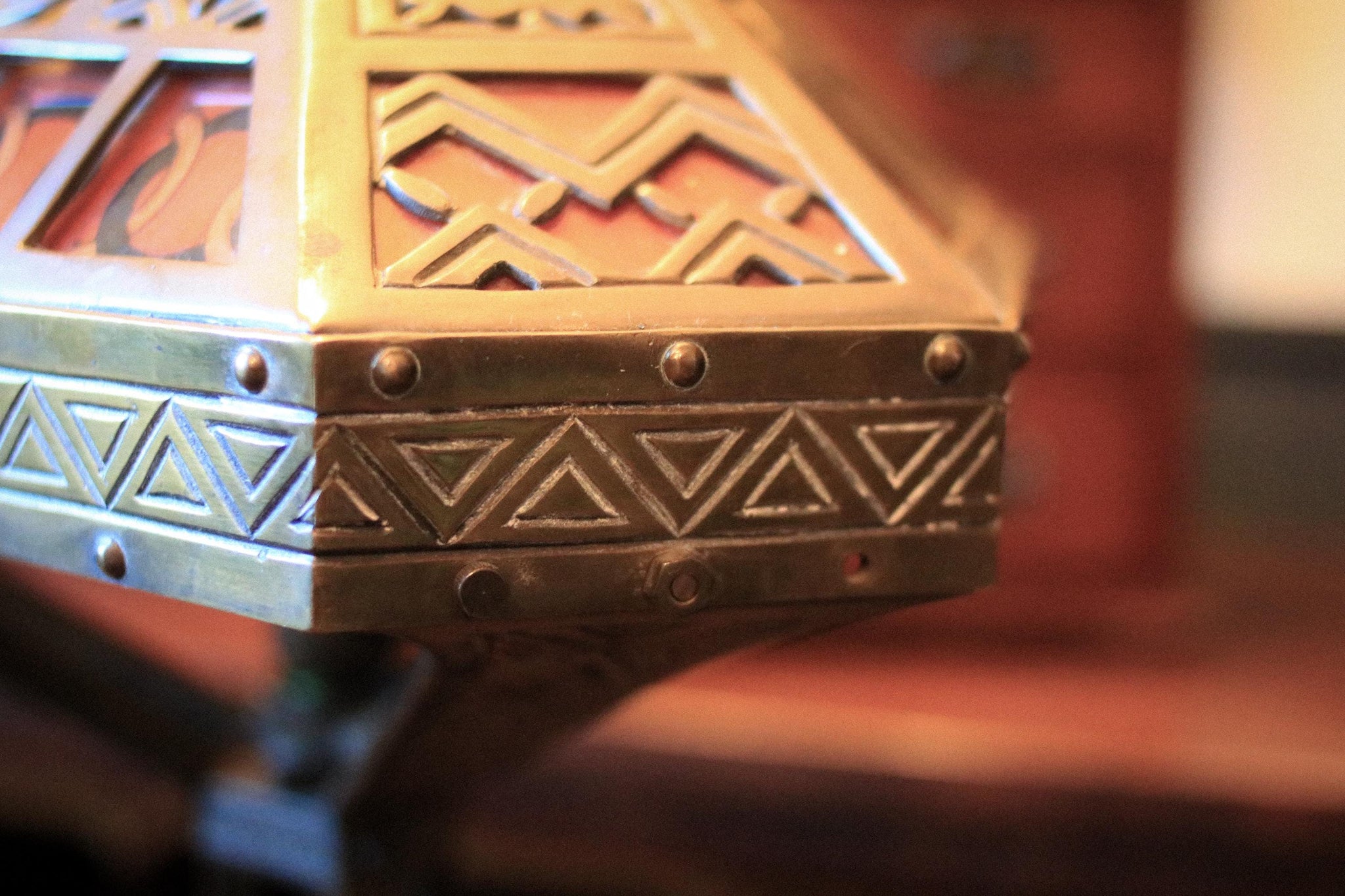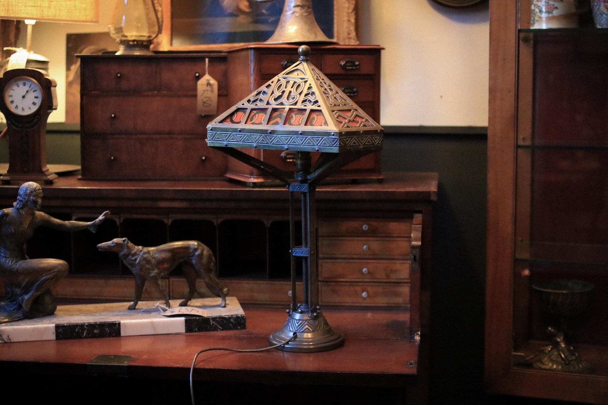 A striking antique Arts & Crafts table lamp with a tall architectural stand and a dramatic pyramidal shade in pierced metalwork with coloured glass panels in rich red and green, finished with bold geometric borders and a stylised monogram motif. When lit it throws a beautifully warm, moody glow that’s perfect for the current Arts & Crafts revival and dark academia interiors—ideal on a desk, sideboard, or reading corner where you want something sculptural and characterful rather than generic.