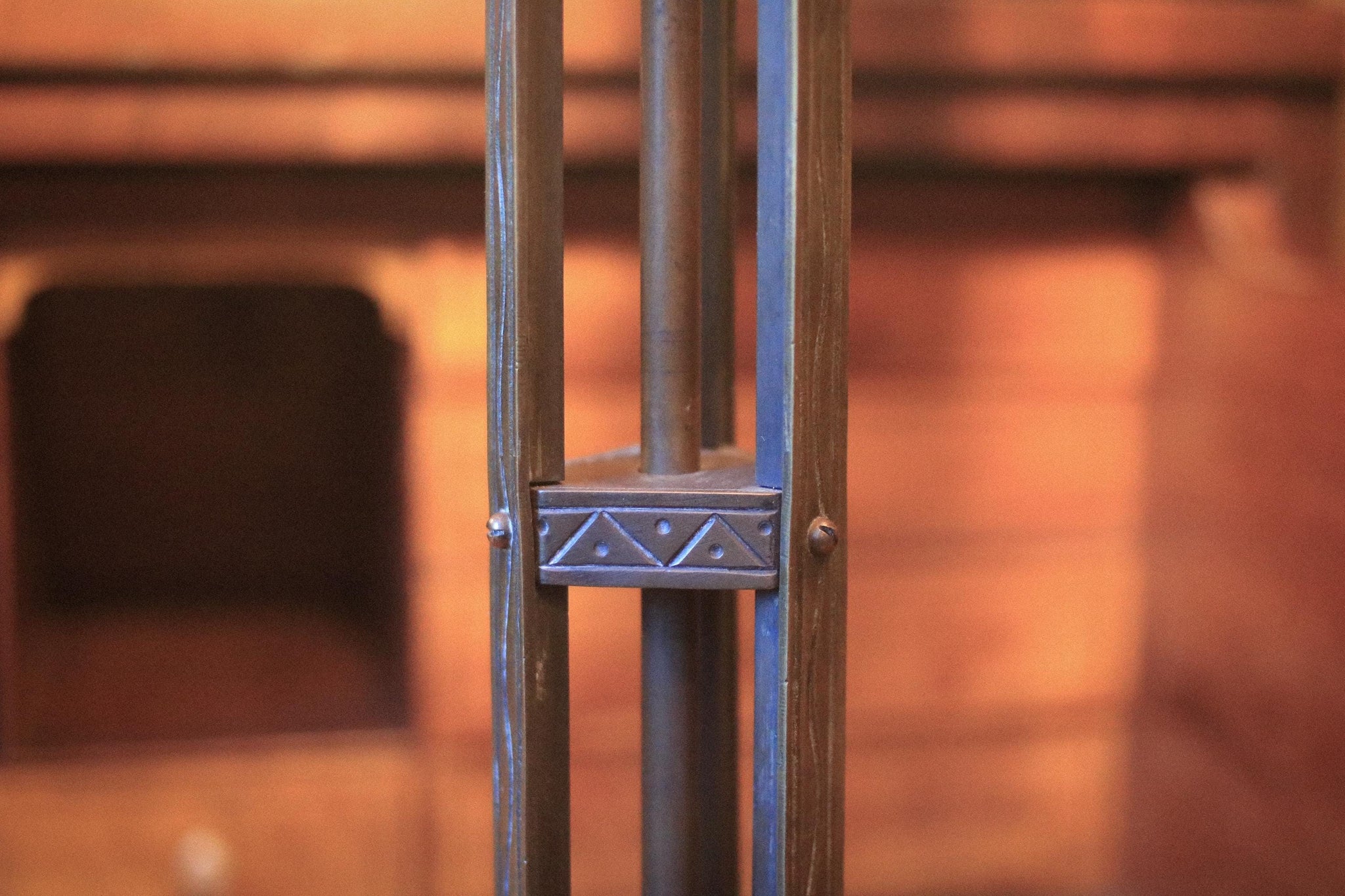 The design and construction feel very much in the Prairie/Mission tradition and are reminiscent of early 20th century makers such as Bradley & Hubbard (B&H) and Handel.