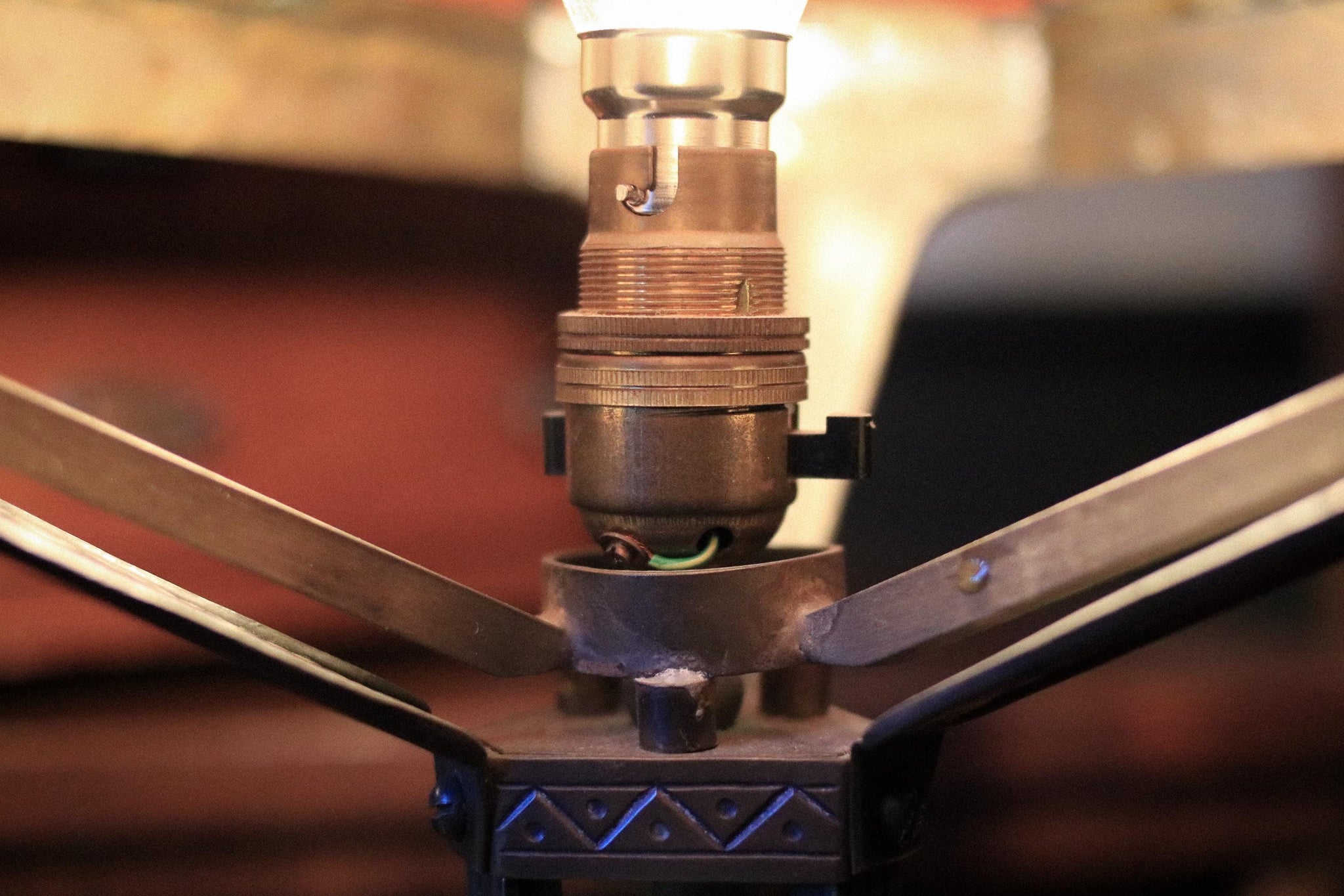 Condition is good antique overall with age-related patina and surface marks to the metal, plus light wear around edges and fixing points consistent with age and use. Rewired to modern safety standards and in good working order.