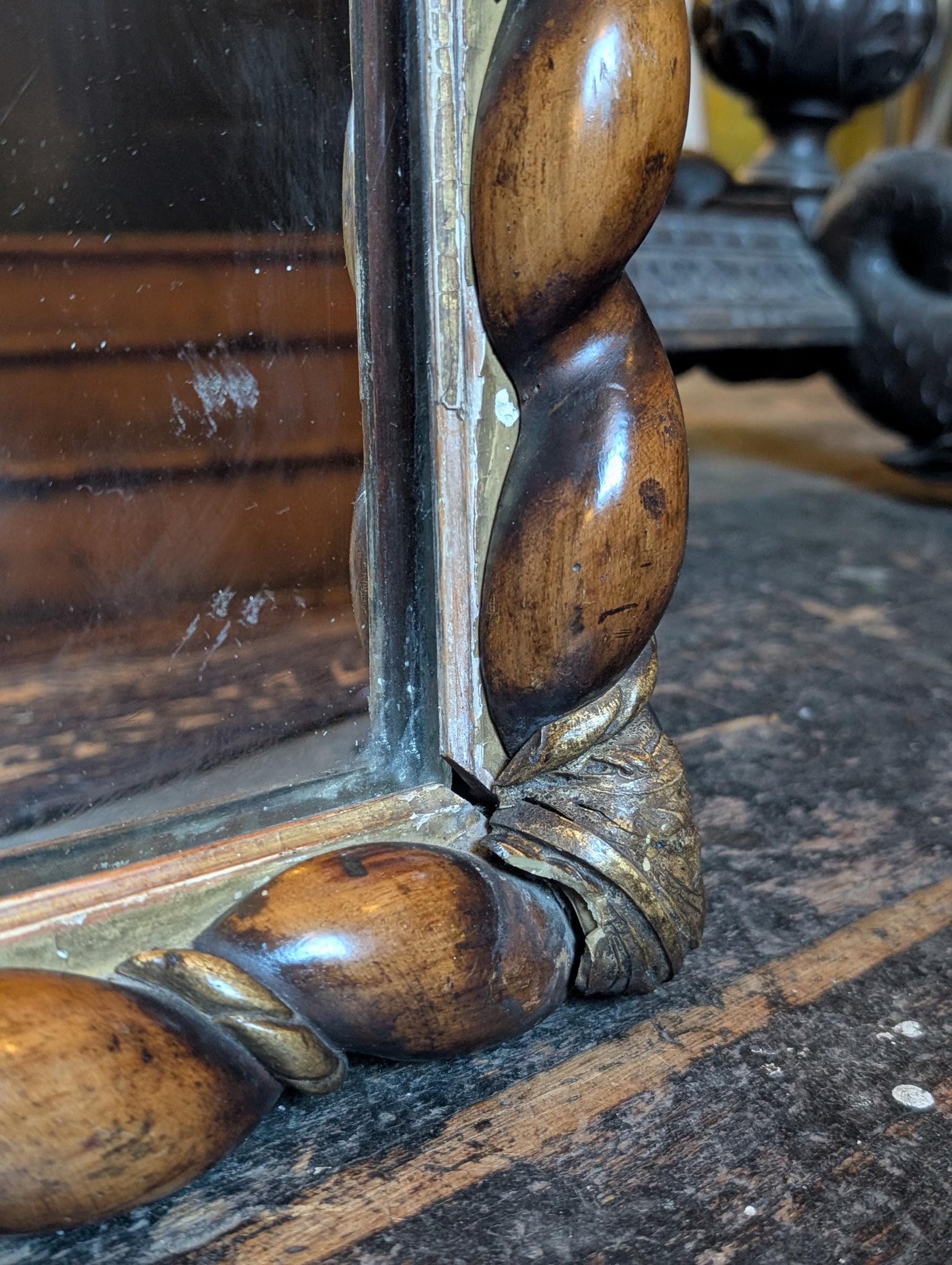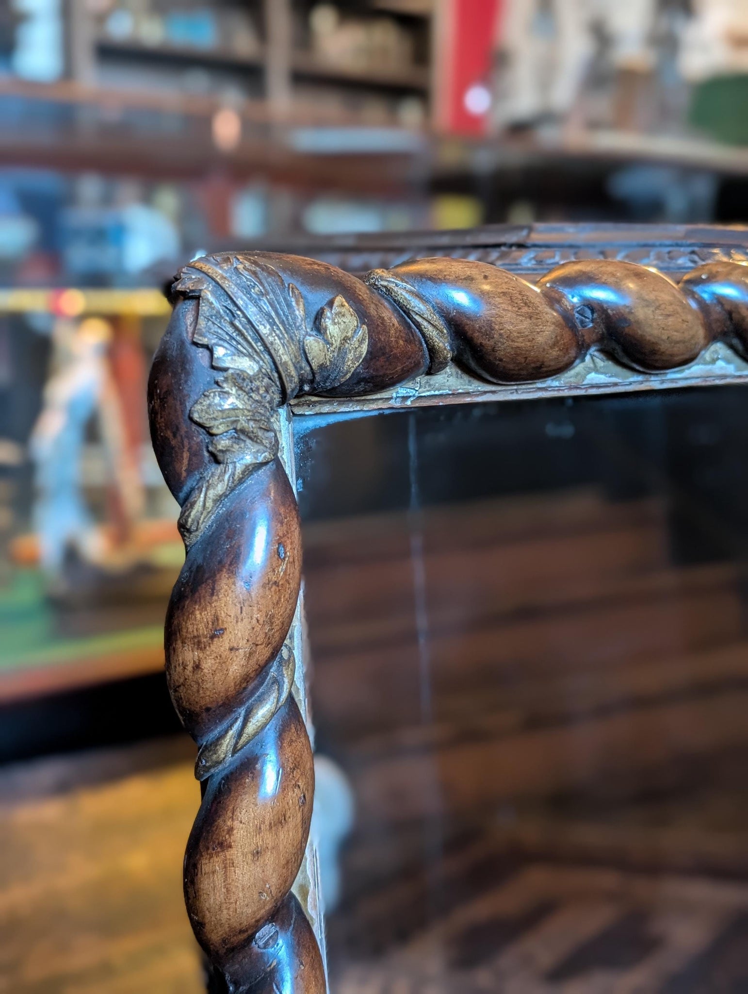 A handsome antique wall mirror with a richly decorative barley twist frame and gilt corner detailing, giving it a warm, characterful look that works beautifully in traditional interiors as well as more layered castlecore and old money spaces. The bold twisted surround gives it real presence without feeling overly heavy, and it is an easy piece to use above a chest, in a hallway, bedroom or cloakroom.