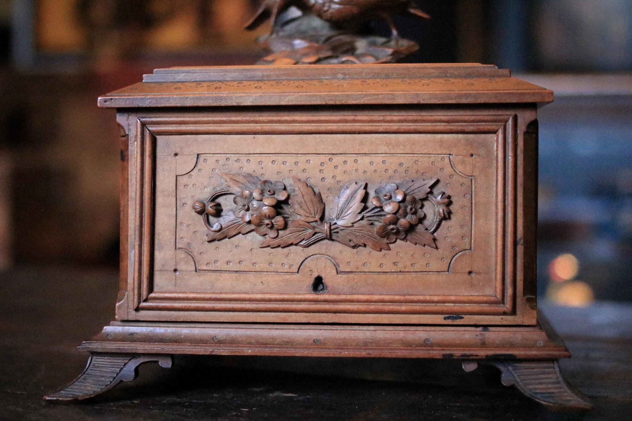 A wonderful antique Black Forest cigar cabinet / smoker’s box, beautifully carved with a pair of birds perched on a rocky outcrop to the lid and foliate floral panels to the body, all sitting on shaped feet. The front panel drops open to reveal the original tiered internal trays, made to keep cigars neatly separated and aired, and it’s exactly the kind of character piece that works right now in Lodgecore / Alpine Chalet / Heritage Cabin interiors—equal parts functional object and sculptural décor for a study, bar area, or bookshelf.