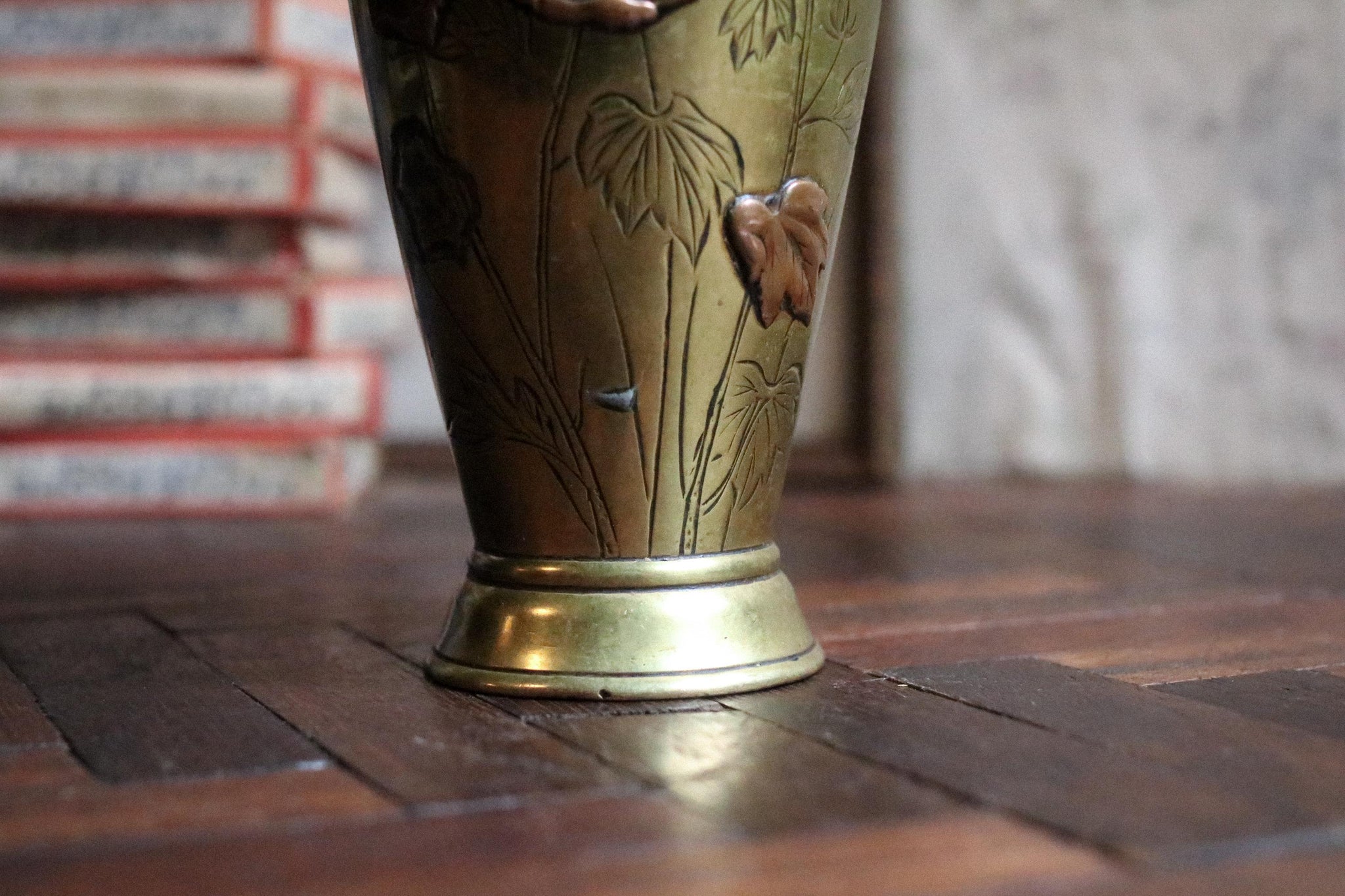 A charming small Japanese brass vase from the early 20th century, worked in high relief with a songbird among poppies and foliage. The soft olive-gold ground has been hand-finished, the flowers and bird picked out in deeper bronze tones that catch the light beautifully. Time has given it a mellow patina with scattered surface marks, a touch of oxidation to the inner rim, and minor knocks to the base—honest wear that suits the piece.