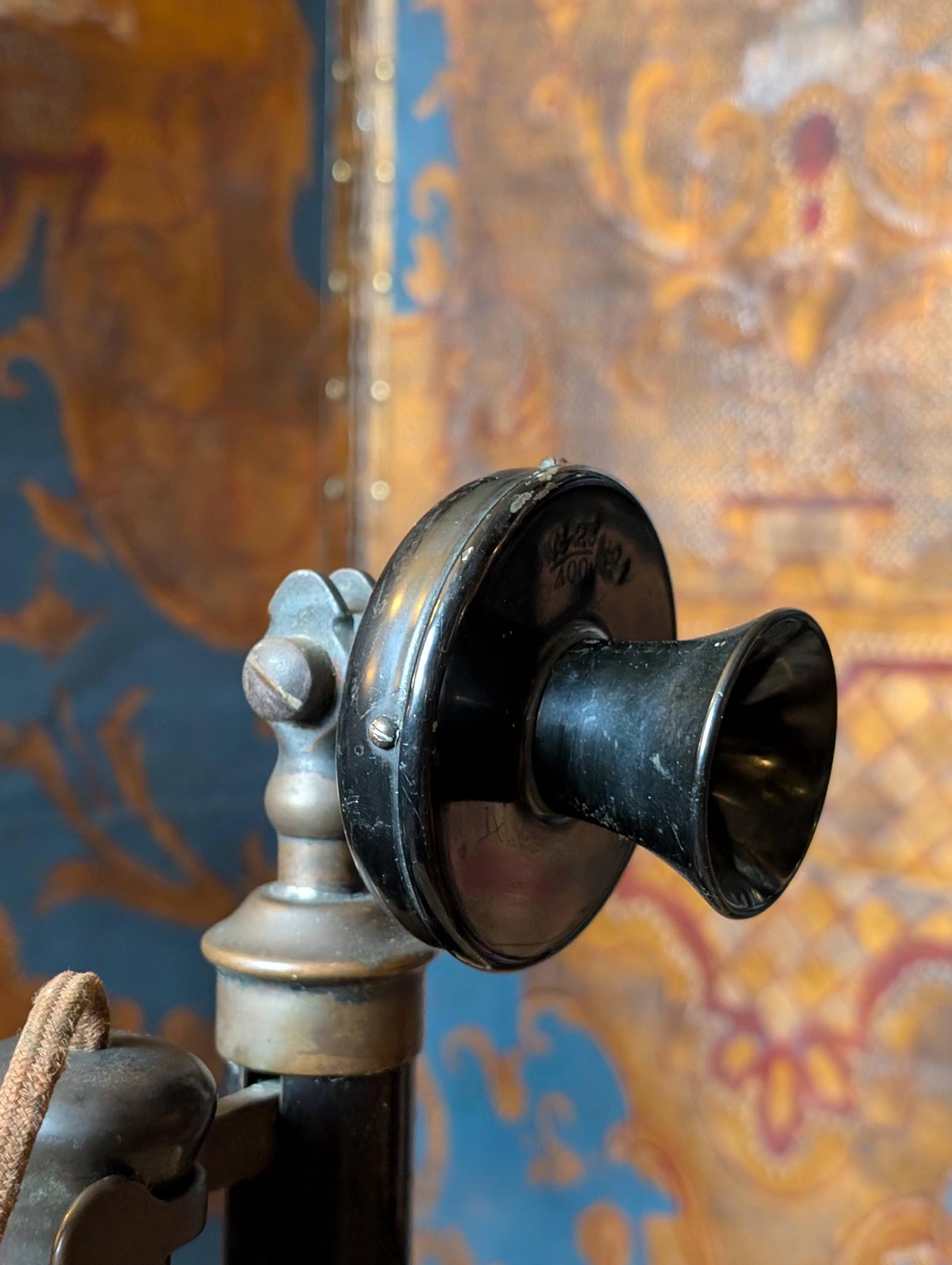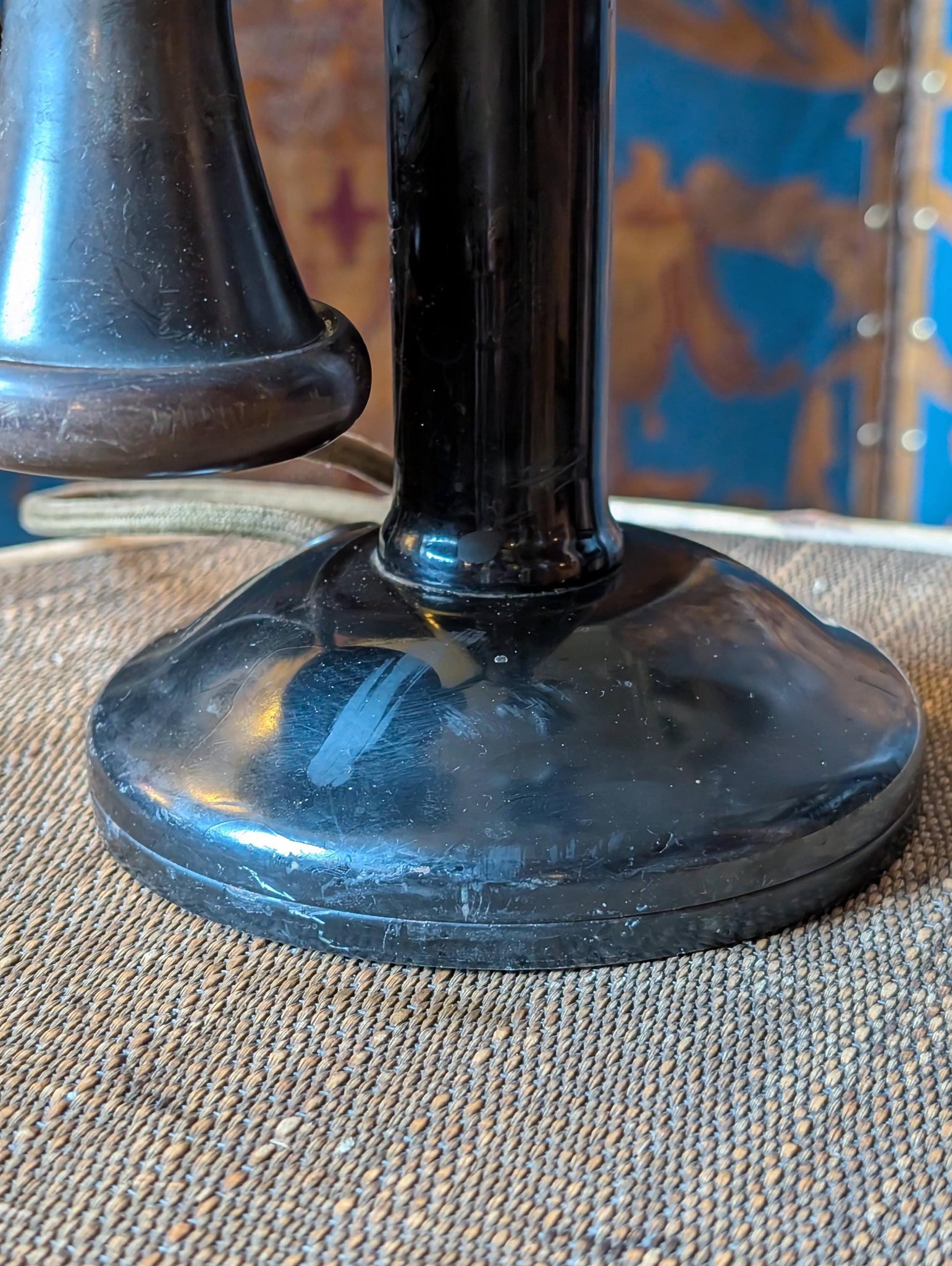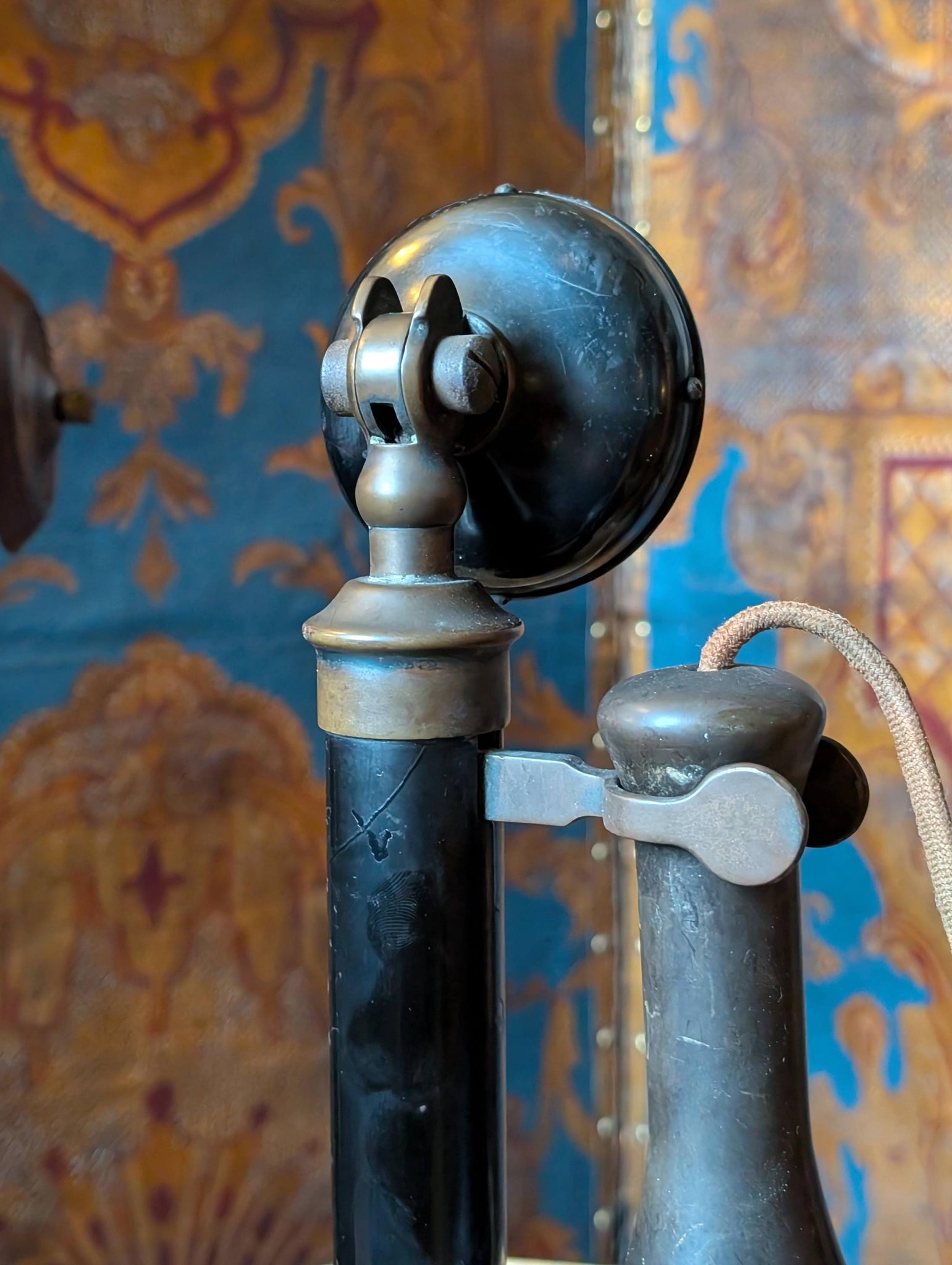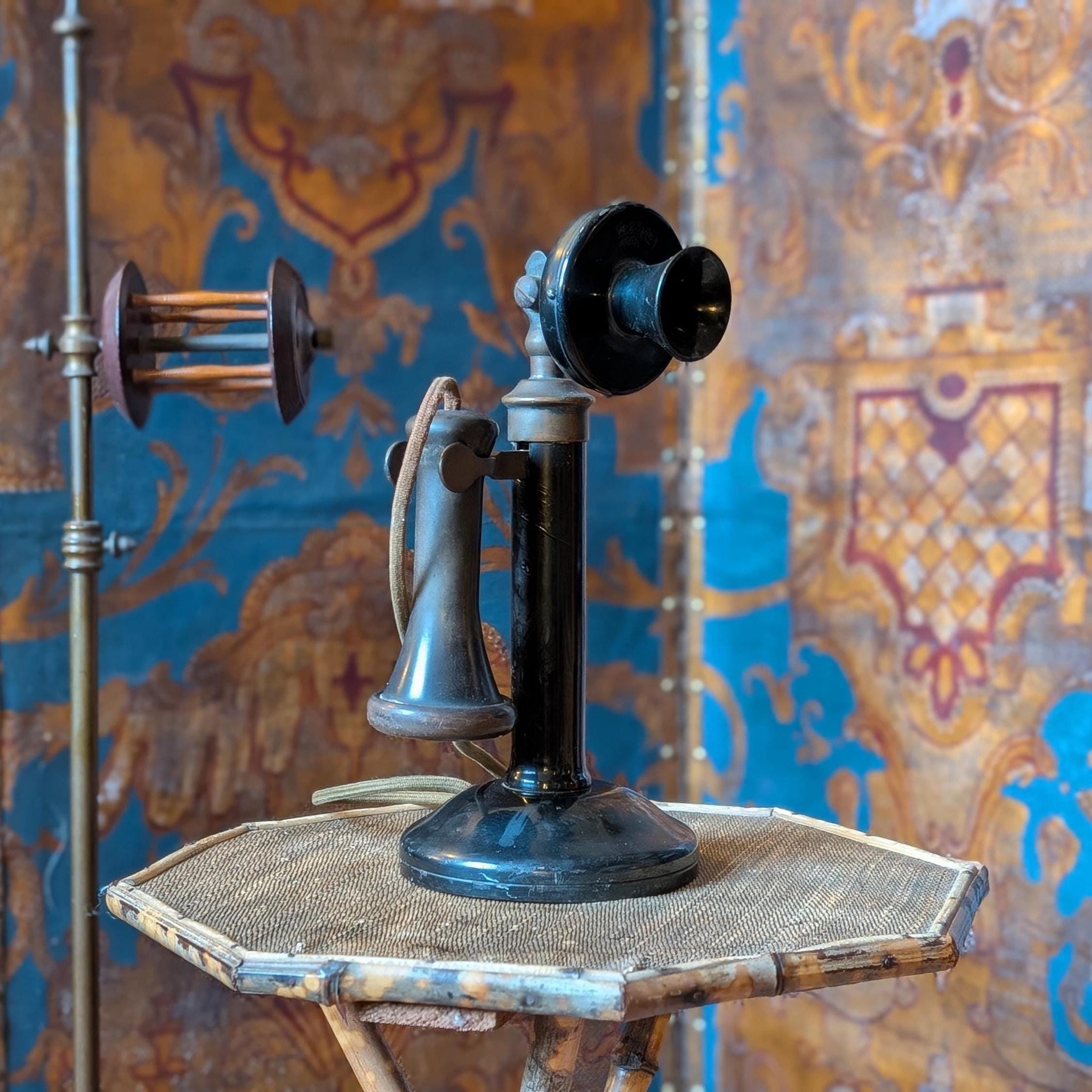 A wonderfully sculptural antique candlestick telephone in black with its original-style hanging receiver and flared speaking mouthpiece, full of honest age and that unmistakable early-telecom silhouette. It’s exactly the kind of object that instantly sells the “dark academia / steampunk study” look—perfect on a desk, in a library nook, or as a film/theatre prop with real presence.