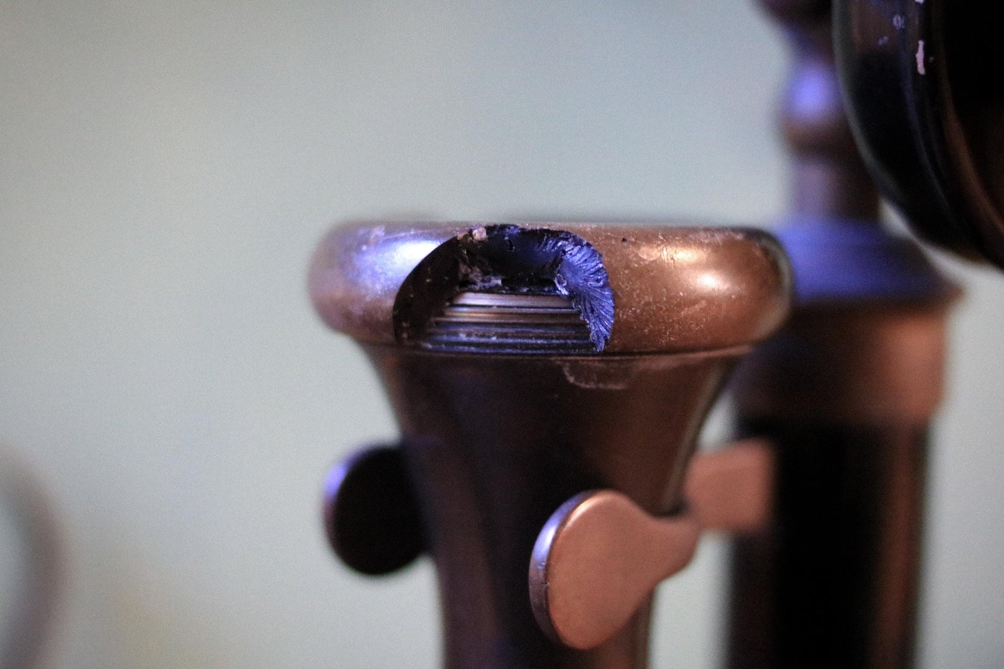 As found, with surface wear, scuffs and small marks consistent with age and use, there is a piece cracked off from the handset (please see photos), and the handset/cord shows similar timeworn character. Total height approx. 29 cm (about 11.4 in).