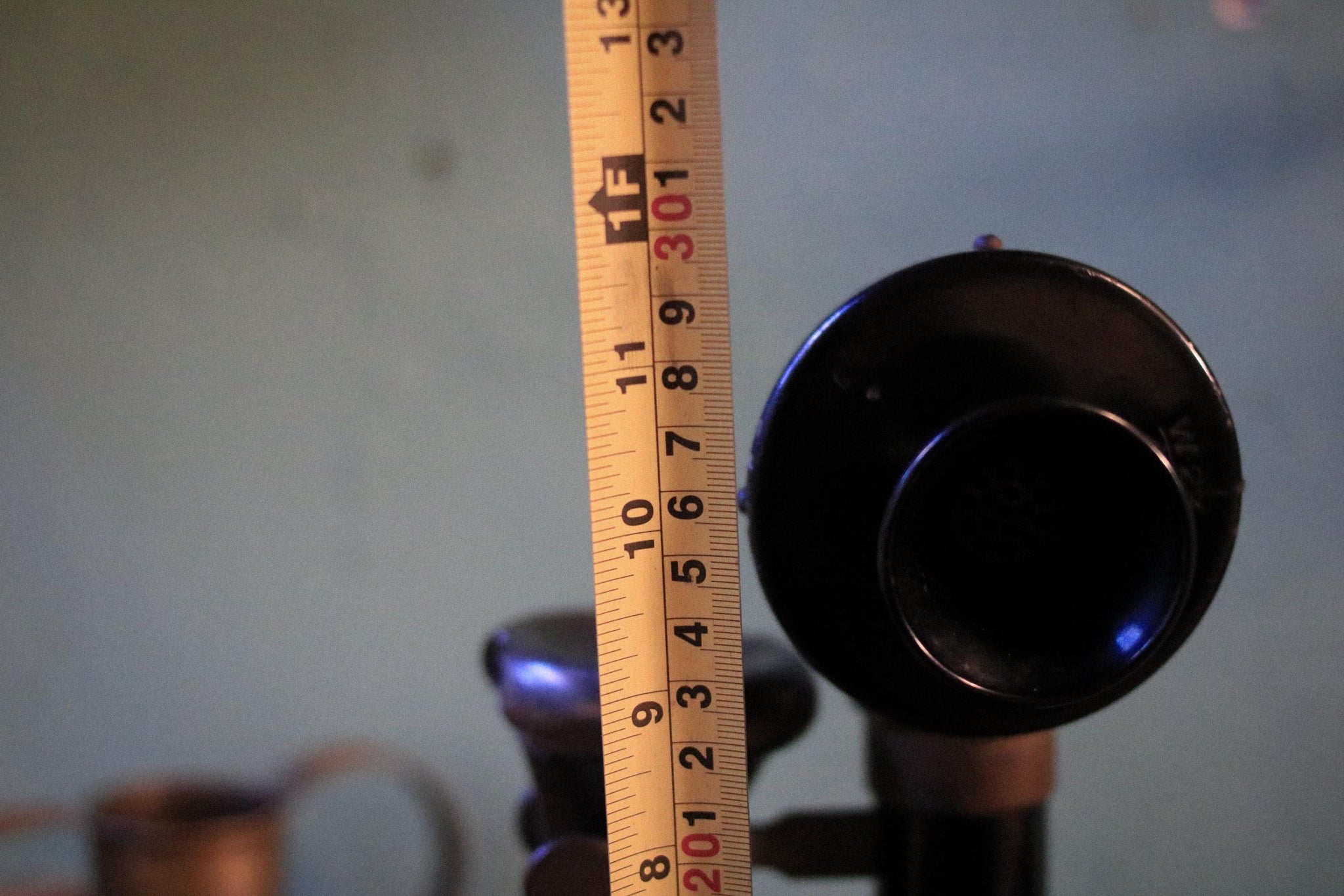 A wonderfully sculptural antique candlestick telephone in black with its original-style hanging receiver and flared speaking mouthpiece, full of honest age and that unmistakable early-telecom silhouette. It’s exactly the kind of object that instantly sells the “dark academia / steampunk study” look—perfect on a desk, in a library nook, or as a film/theatre prop with real presence.