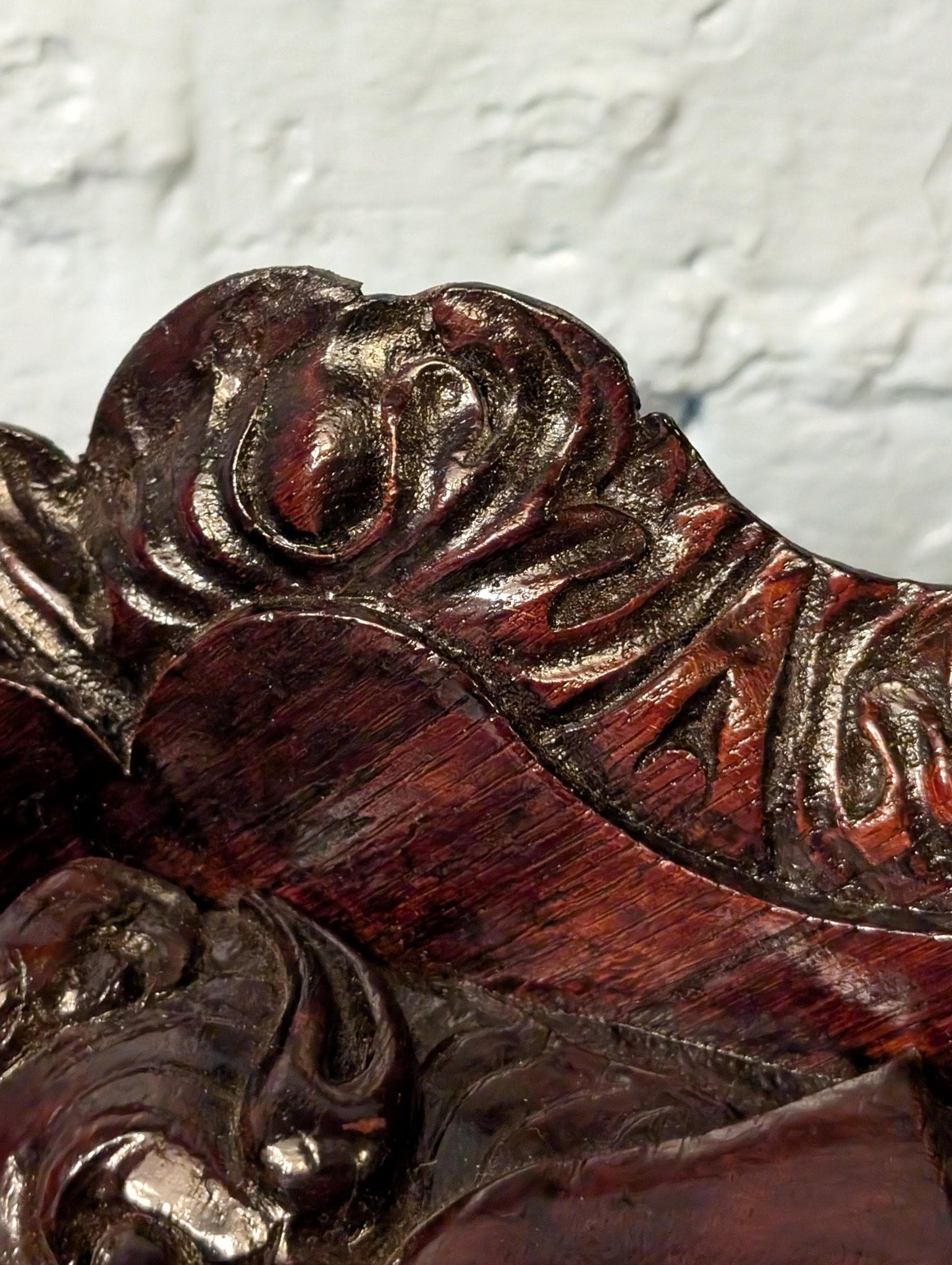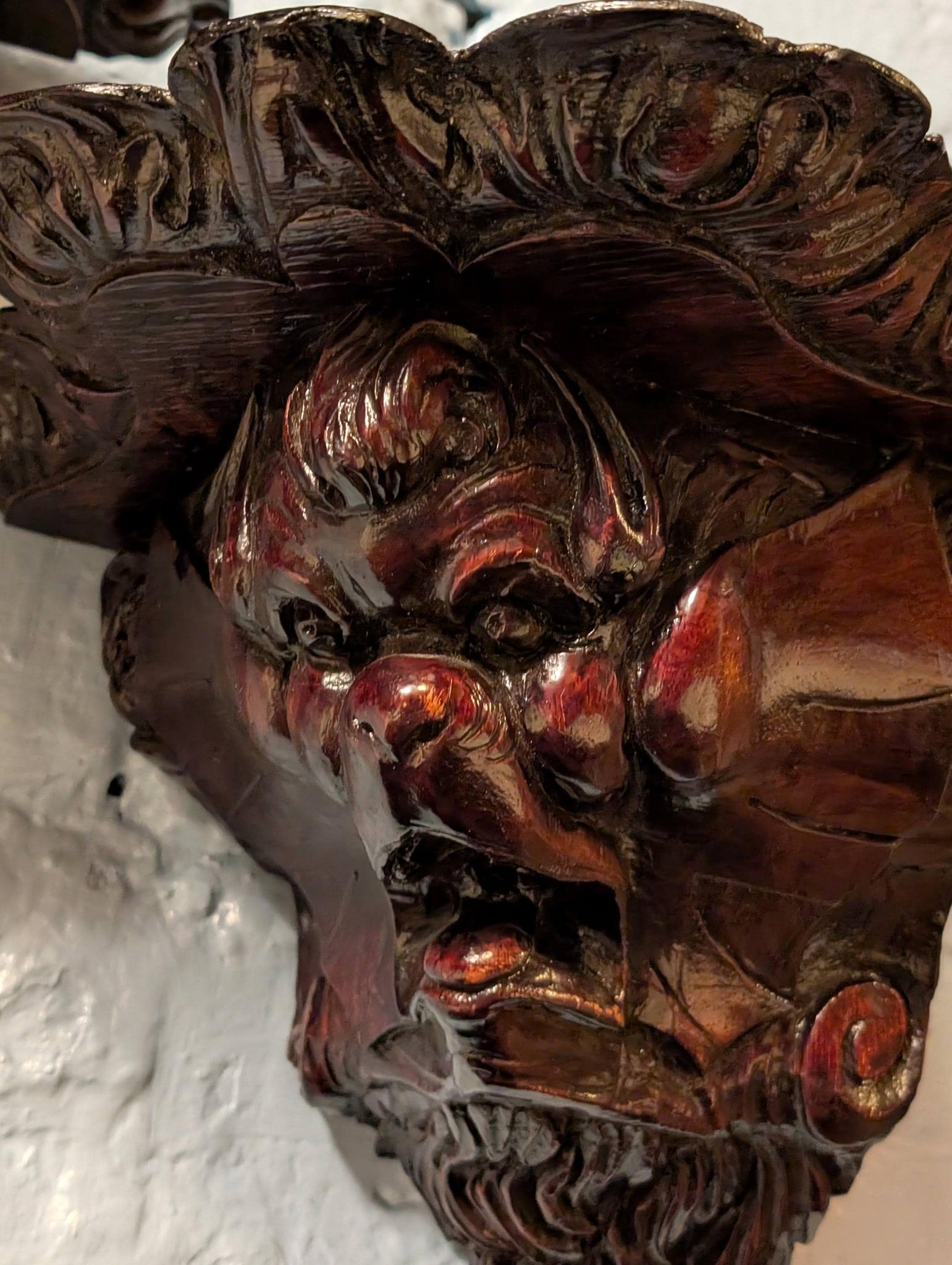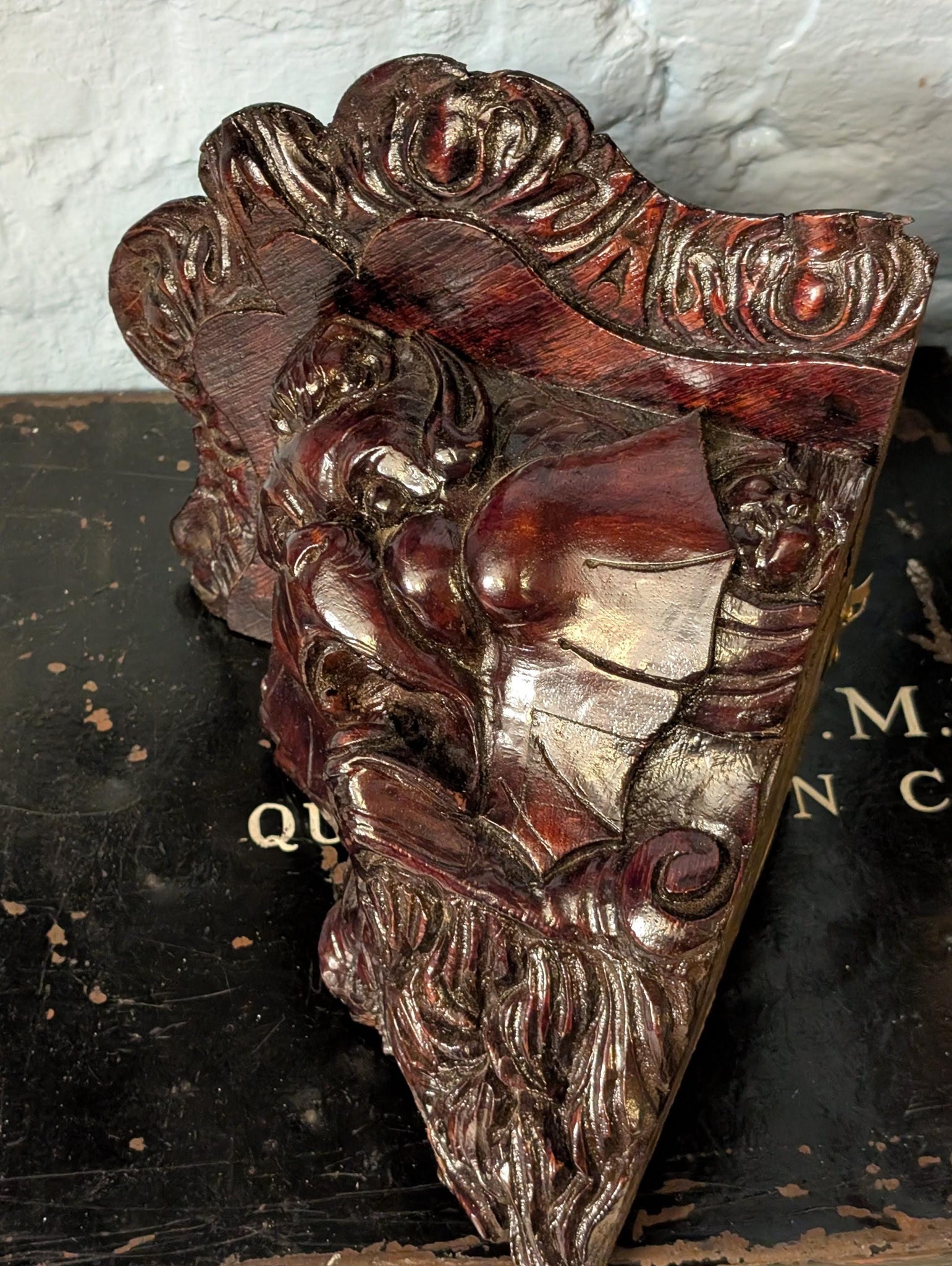 A dramatic matched pair of antique carved wooden corner wall brackets/corbels, richly detailed with leaf-and-scroll carving and expressive grotesque mask faces. They’ve got that high-drama, old-world “manor house” presence that’s right on the Castlecore and Dark Academia wave—perfect for turning a small corner into a shrine for curios, a candle, a tiny bust, or a favourite object.