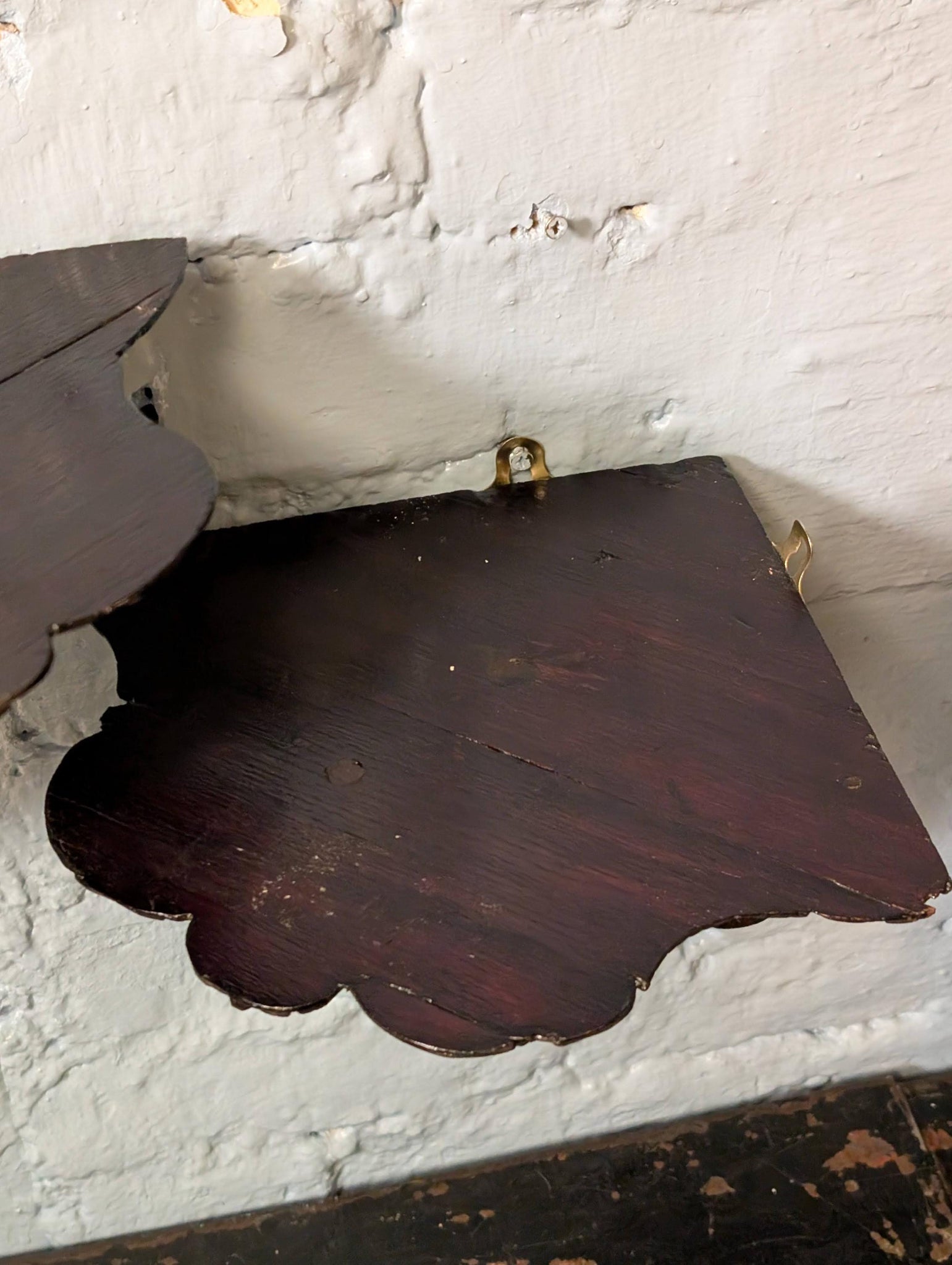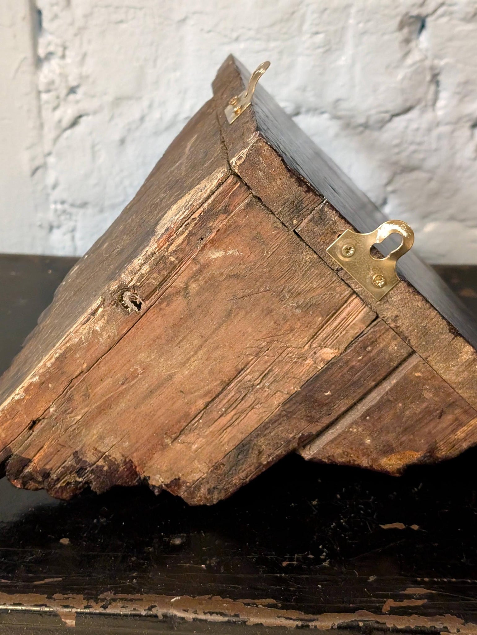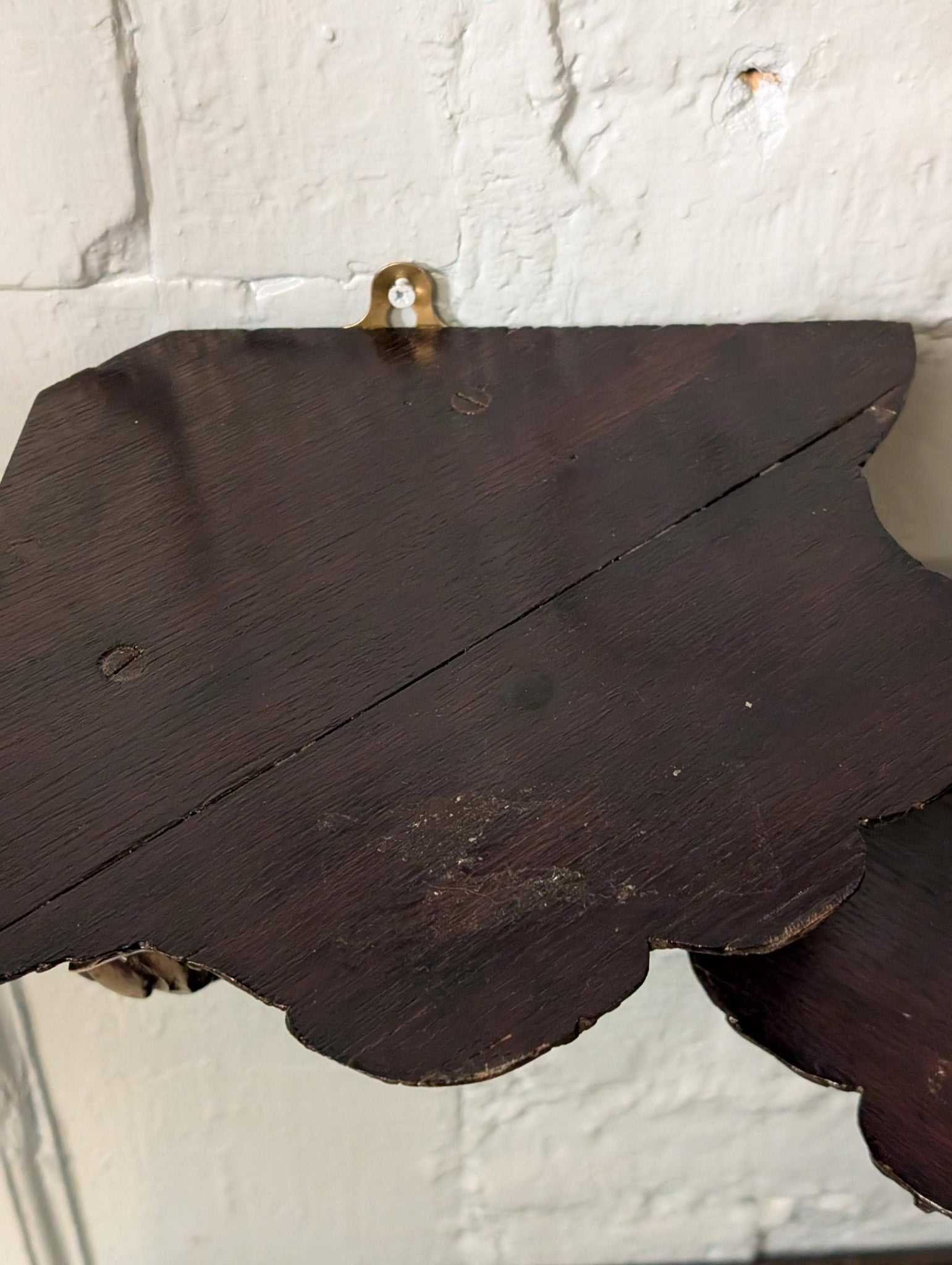 Each bracket measures approximately 21cm tall (8.3") x 23cm projection/width (9.1"). Condition is authentically aged with surface wear, scuffs, small chips/rubs to edges and some age lines/seams to the timber as shown; hanging hardware is present.