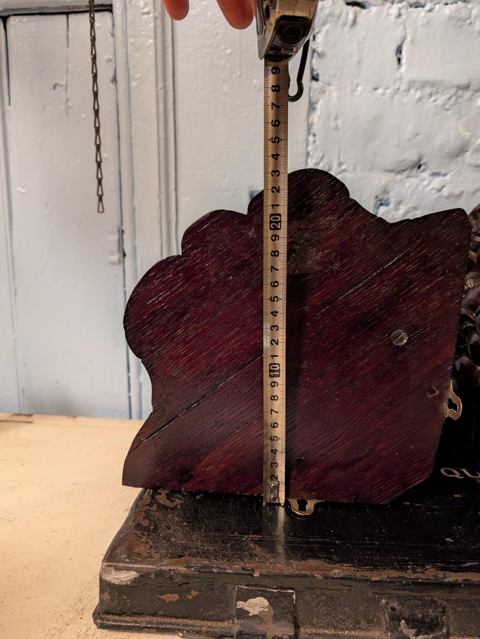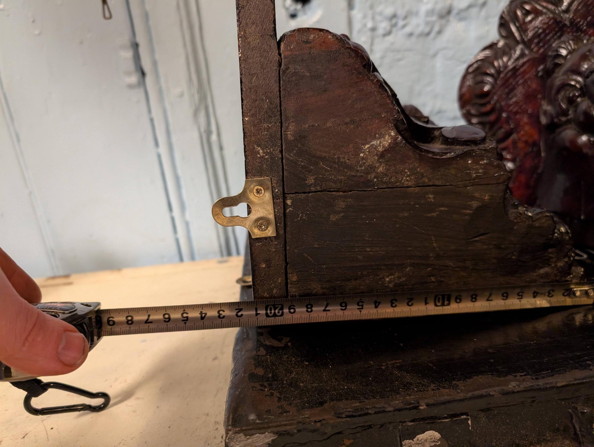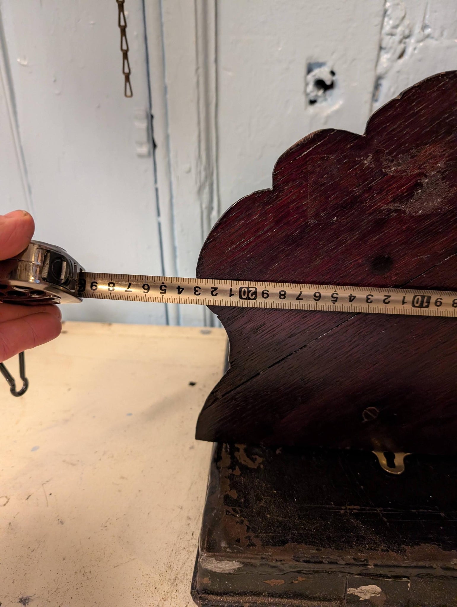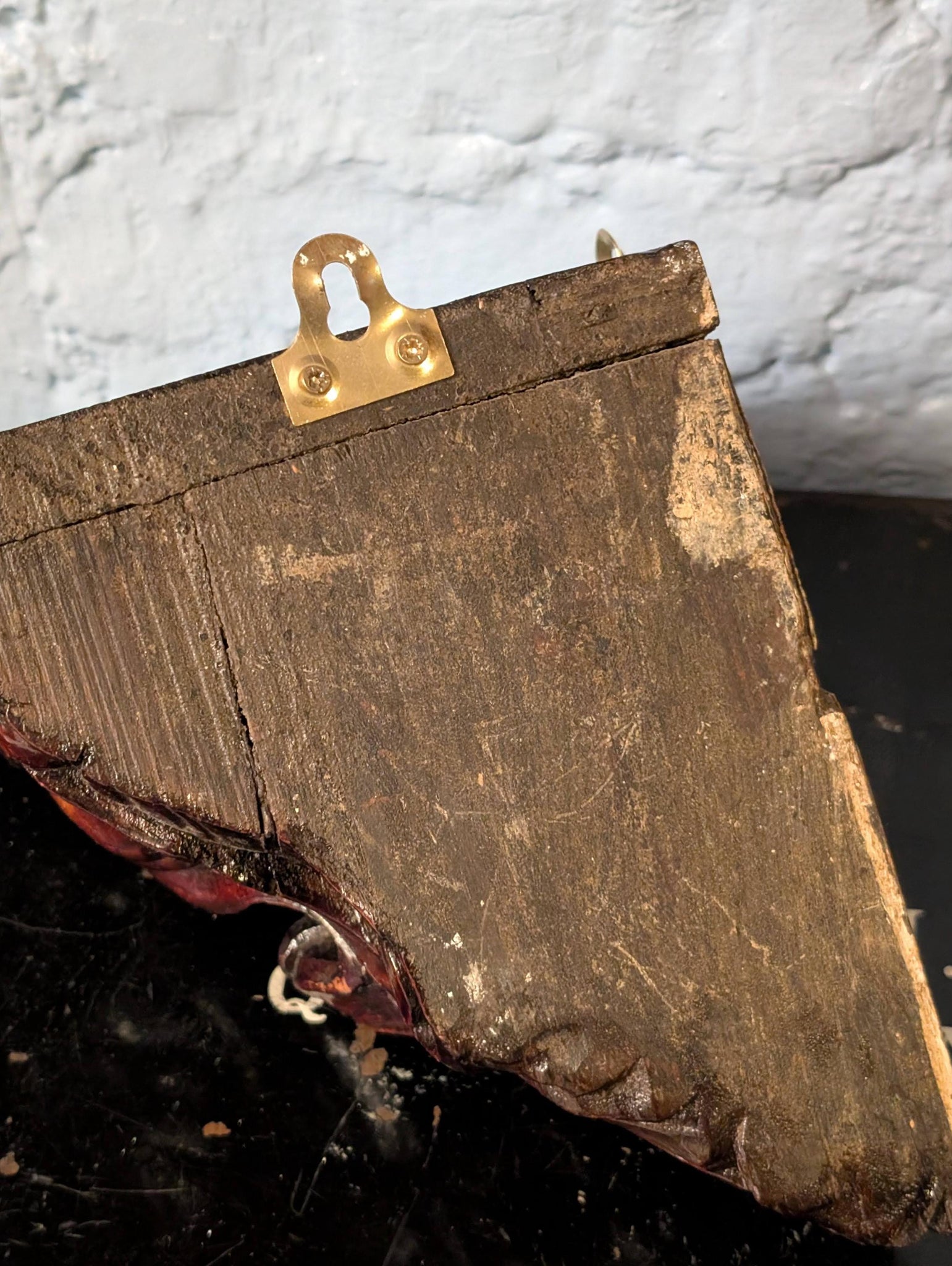 Each bracket measures approximately 21cm tall (8.3") x 23cm projection/width (9.1"). Condition is authentically aged with surface wear, scuffs, small chips/rubs to edges and some age lines/seams to the timber as shown; hanging hardware is present.