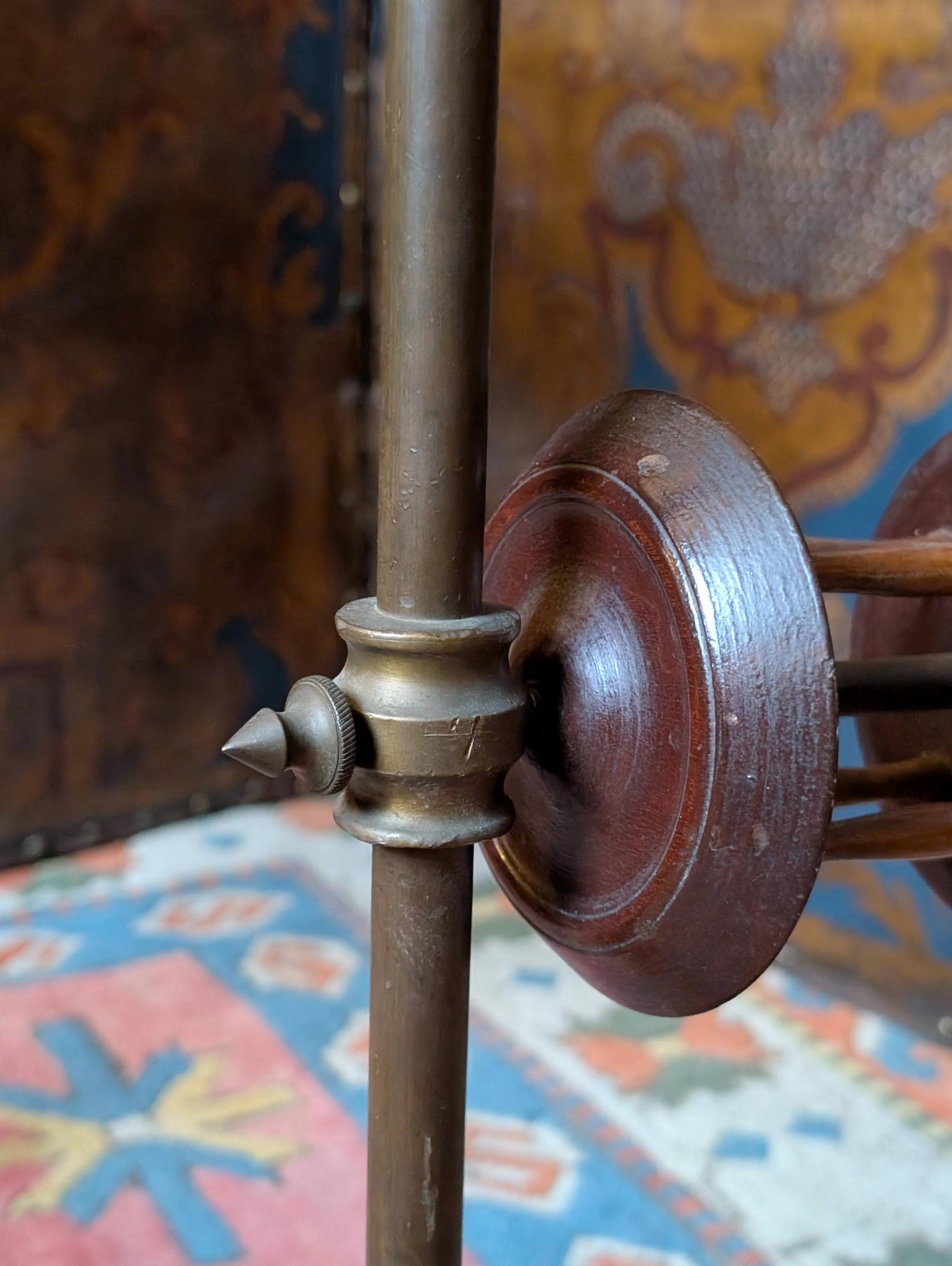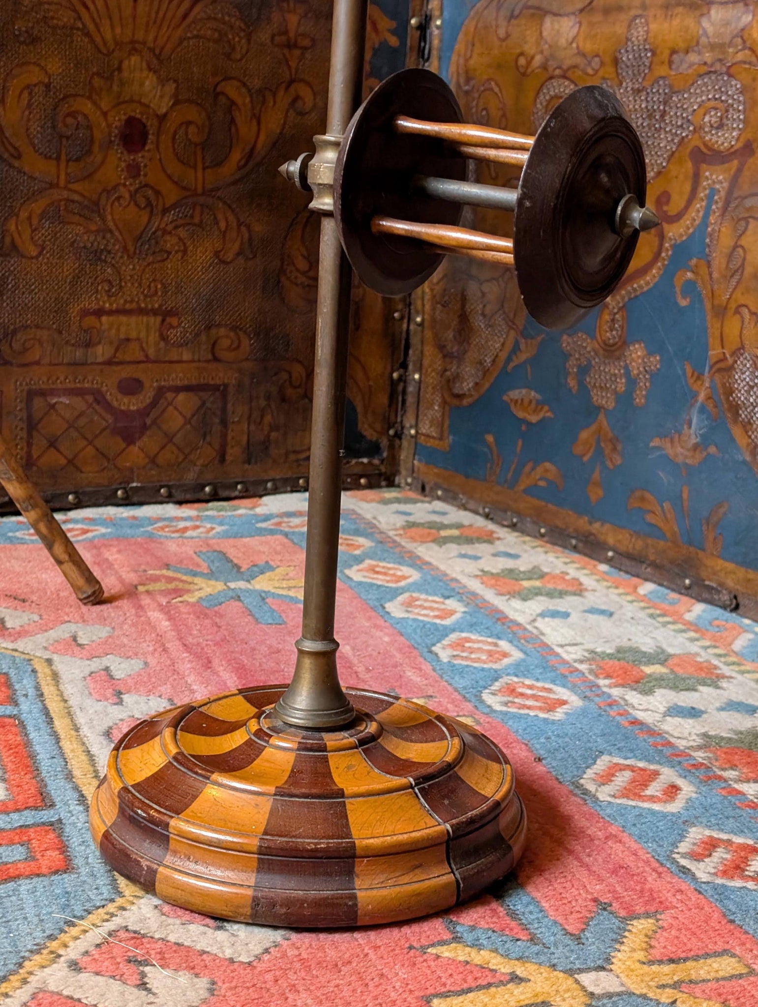 A wonderfully sculptural, floor-standing spool/reel stand with a patinated metal upright and a bold circular wooden base in a two-tone geometric pattern. It’s fitted with two turned wooden reel frames mounted to adjustable collars, giving it that unmistakable “old workshop / maker’s studio” look that’s landing hard right now with the dark academia and ateliercore interiors trend.