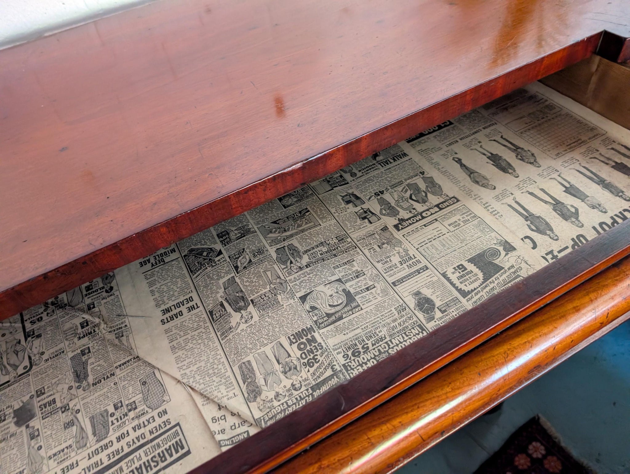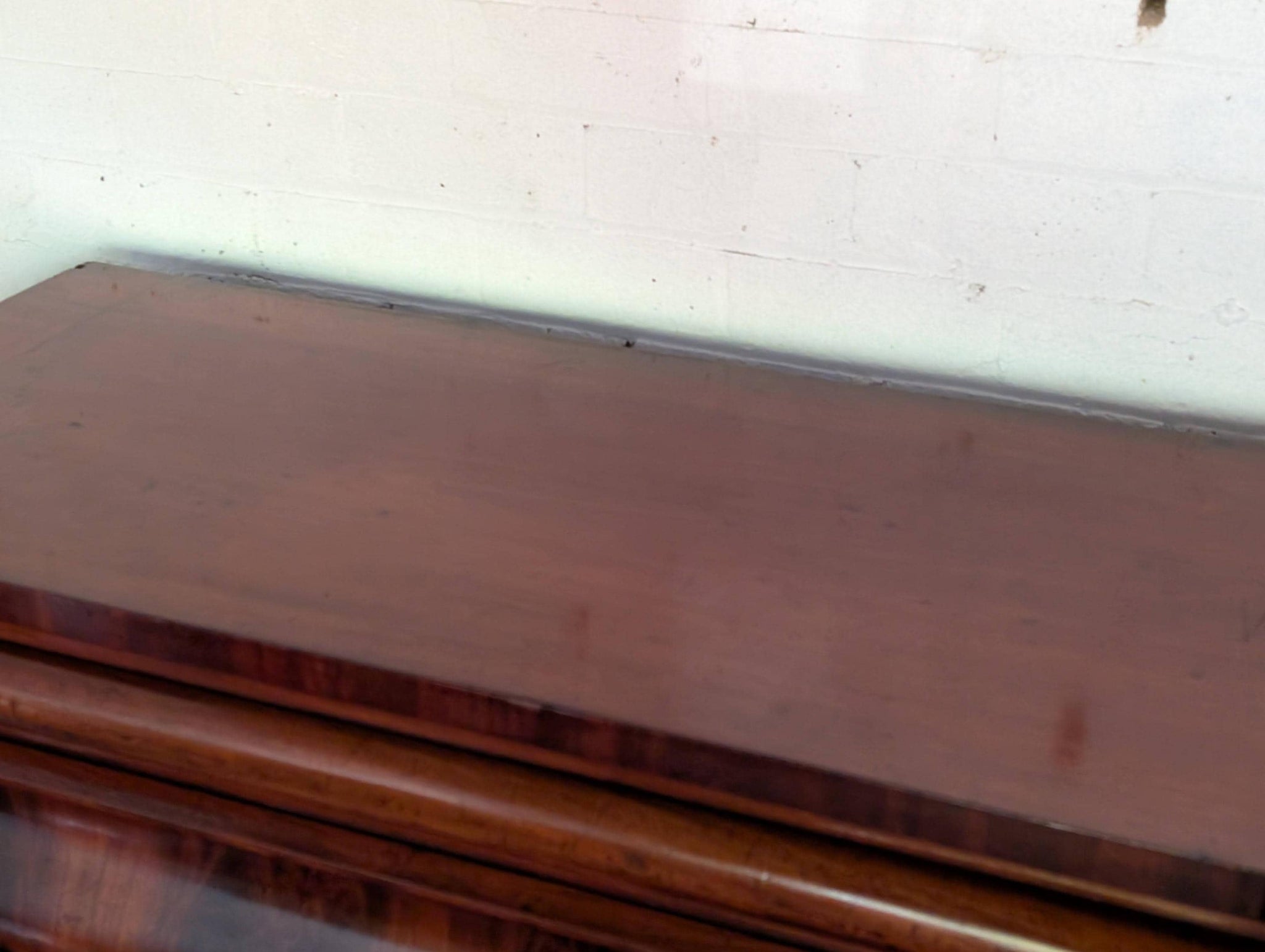 The chest shows visible age-related wear, including losses and chips to the veneer at the top front corners and some abrasions around the drawer surrounds (all shown clearly in the photographs). It is structurally solid, the drawers run well for its age, and the piece has a deep, glowing patina throughout. The original key is missing.