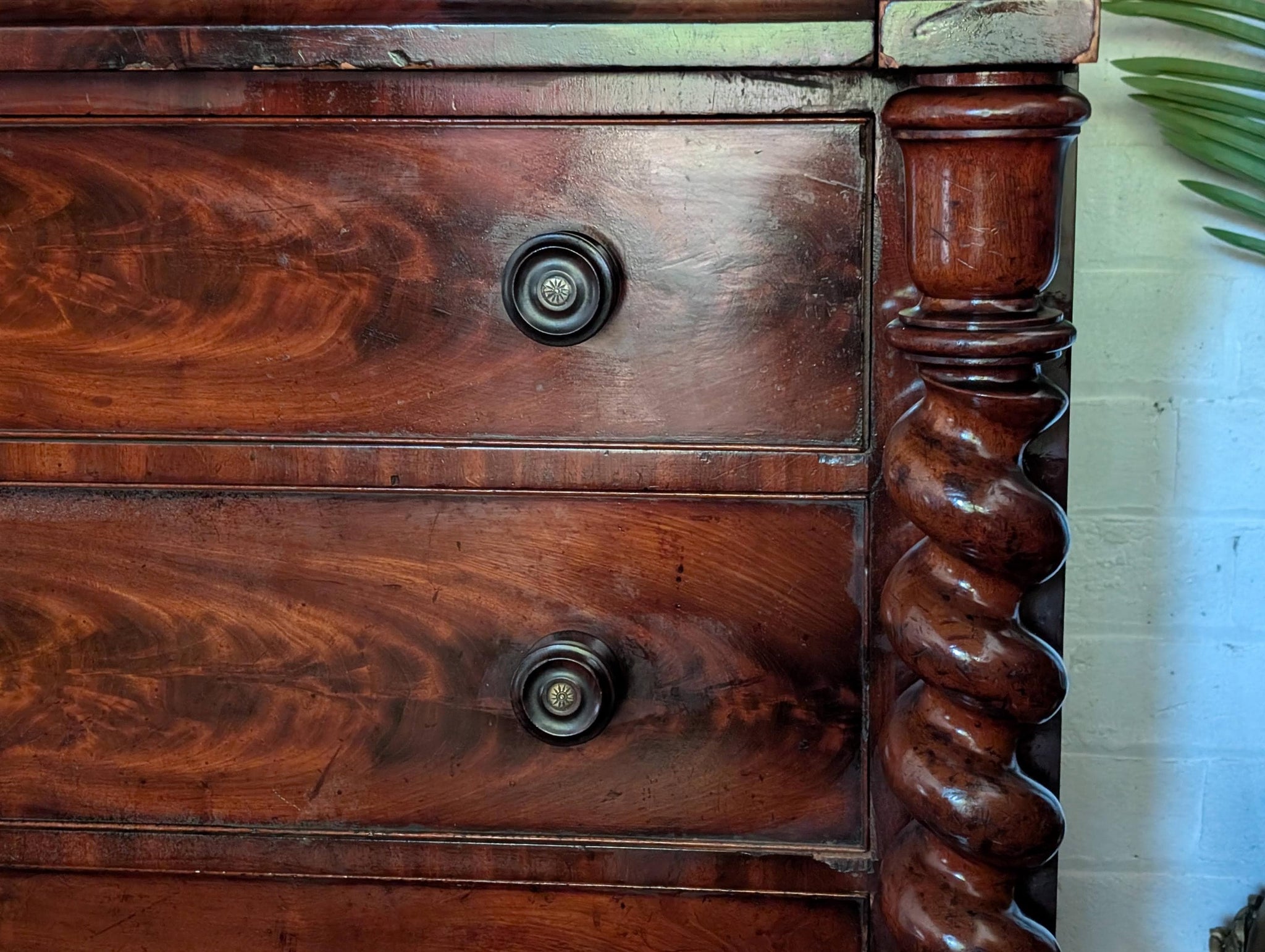This striking 19th-century flame mahogany chest of drawers is an absolute character piece, showcasing richly figured veneers, bold architectural lines, and impressive barley-twist front columns. The top drawer operates via a secret internal latch, which is accessed by opening the second drawer.