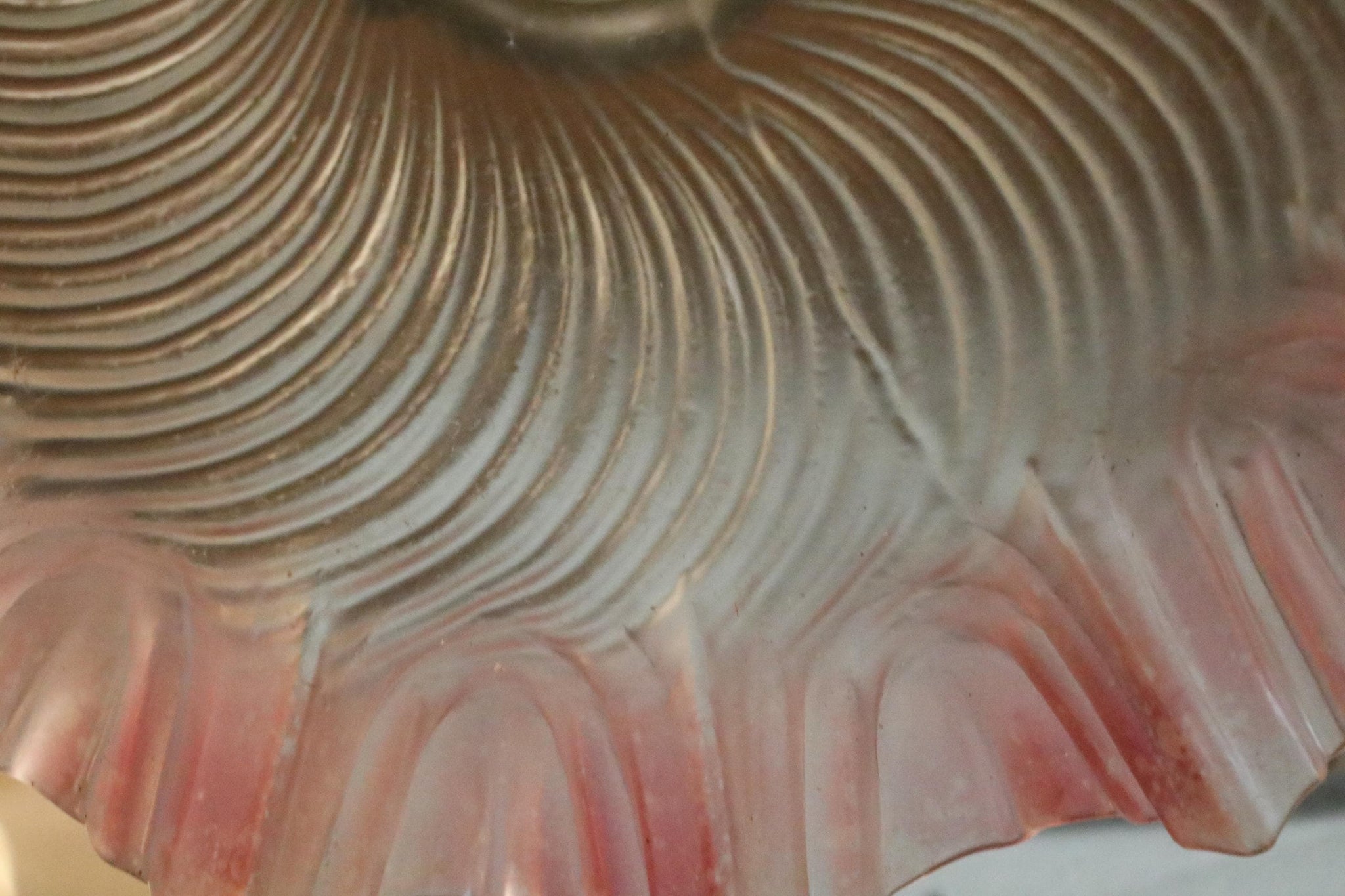 A stunning antique pendant light featuring a rippled glass shade with a frilled, ruffled edge in a delicate blush pink. The softly scalloped form and frosted, swirled texture give this piece a romantic, almost ethereal quality. It has been rewired with twisted vintage-style cord (1m) and has original brass gallery fitting, ready to add gentle vintage charm to any space.