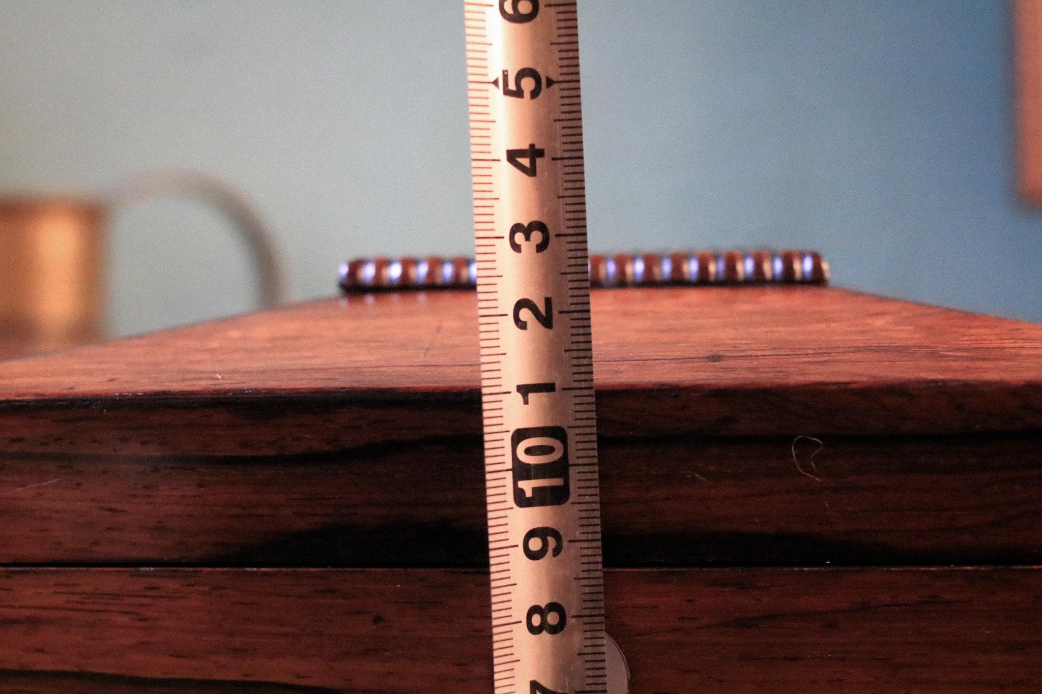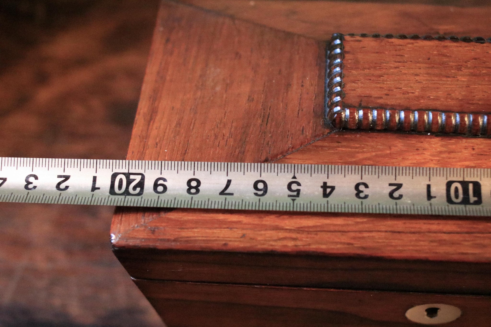 Size: 20 x 11 x 13 cm (approx 7 7/8" x 4 5/16" x 5 1/8"). Condition is good antique with age-related wear: surface marks and small knocks, some rubbing to edges and corners, and patina to the interior fittings/hinges as you’d expect.