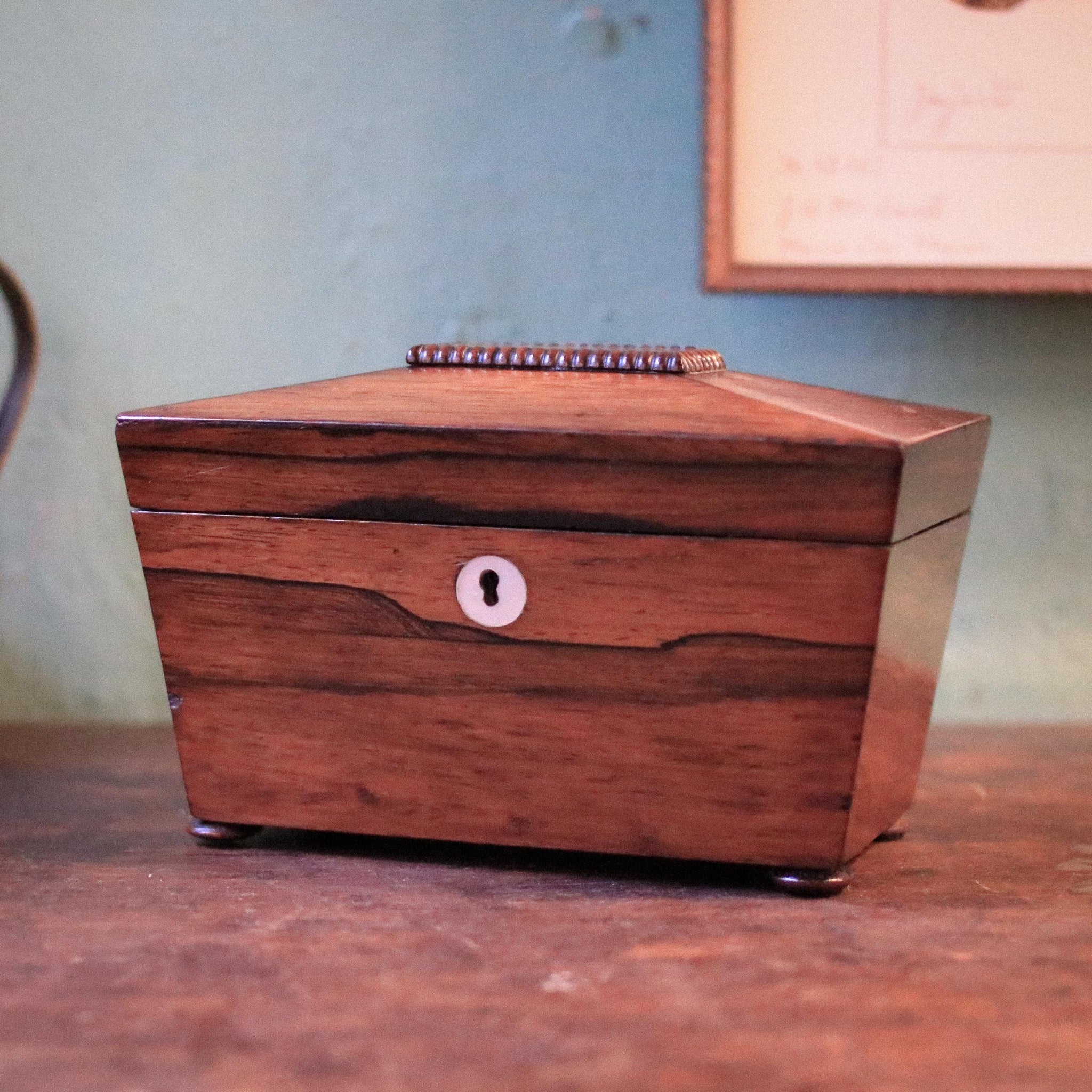 A beautifully simple antique tea caddy with rich flame-grain veneer and a gently sloped lid topped with a beaded handle, finished with a pale bone escutcheon to the front. Inside are two lidded compartments, perfect for storing loose leaf tea (or today, equally great for keepsakes, letters, or desk bits), and the clean lines make it ideal for the current Old Money / Heritage Minimalism look—quiet quality, warm wood, and understated detail.
