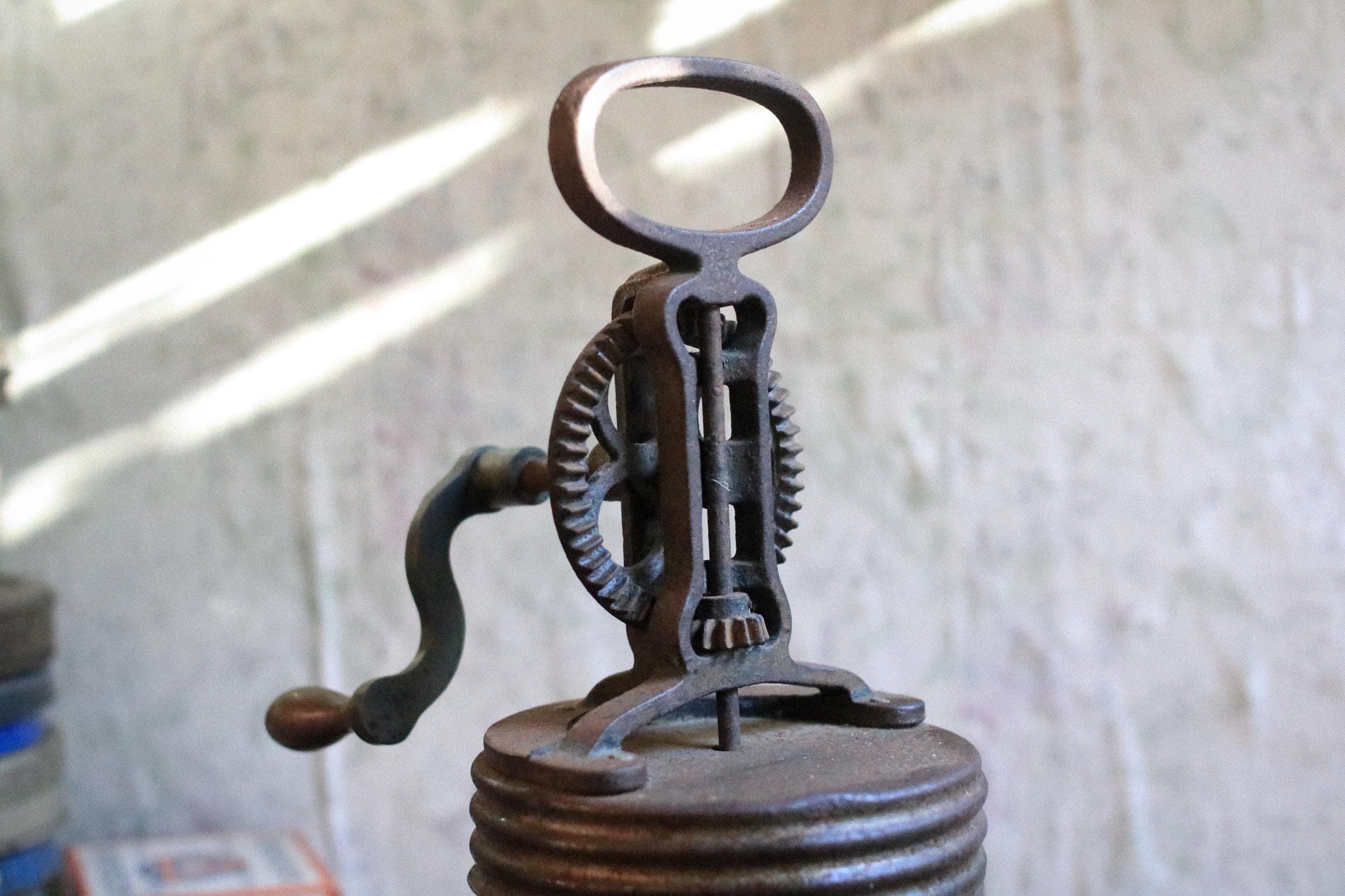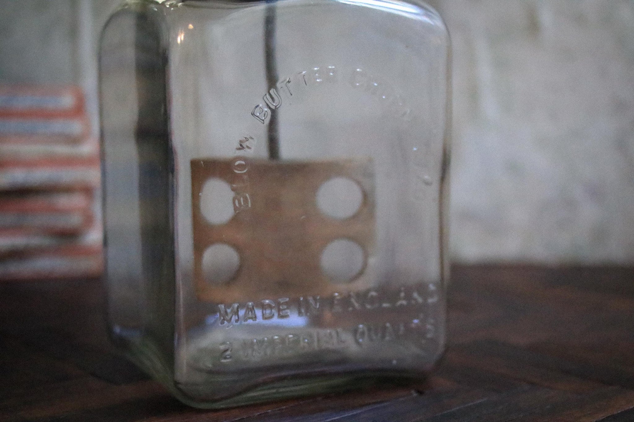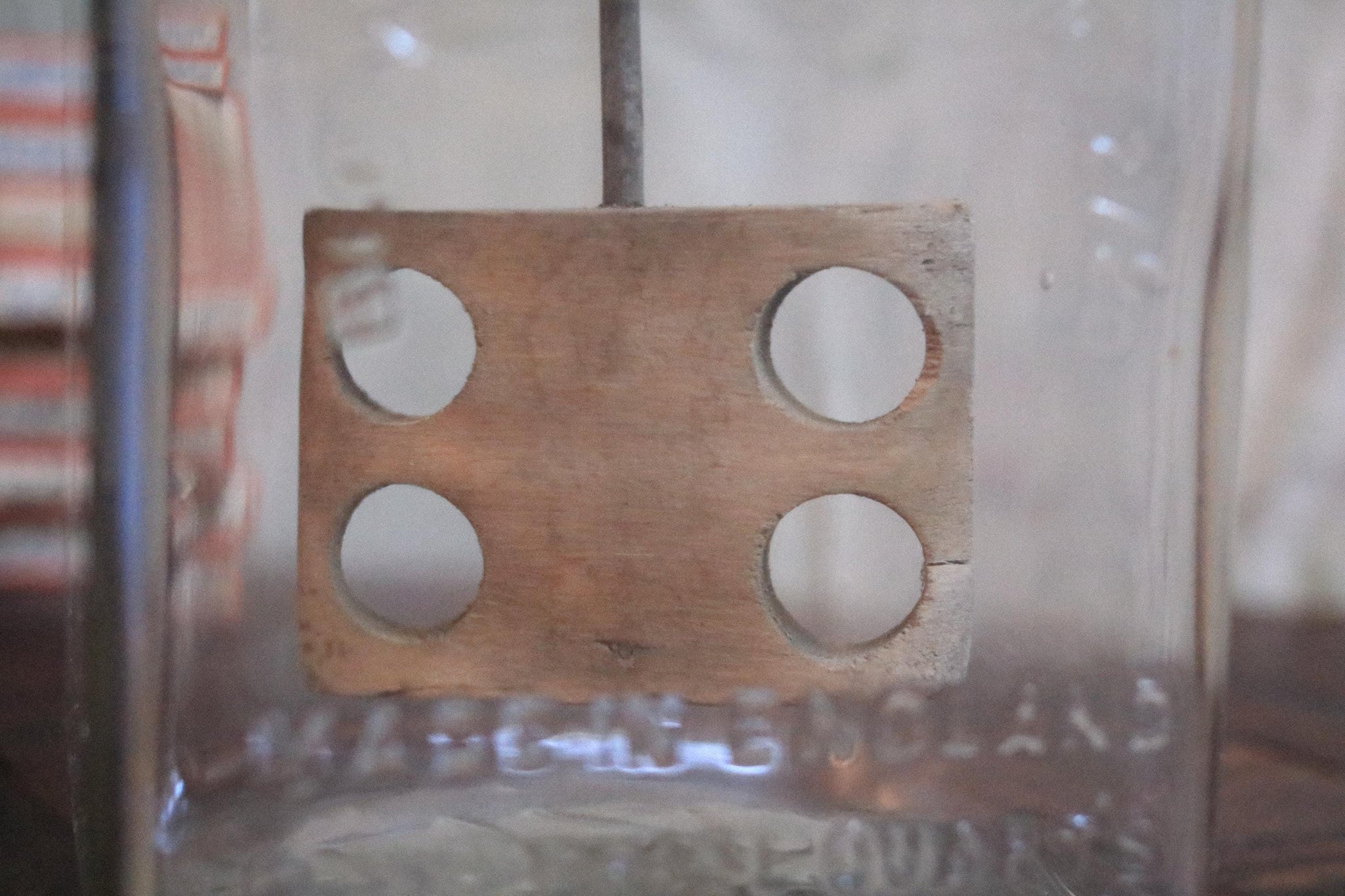Condition is good and honest: clear jar with light scuffs and expected bubbles from manufacture, no rim chips or cracks observed; ironwork with stable oxidation; paddle showing old staining from use. Handle turns and spins paddle. An evocative, functional bit of kitchen history—perfect for a farmhouse kitchen shelf, shop display or prop styling.