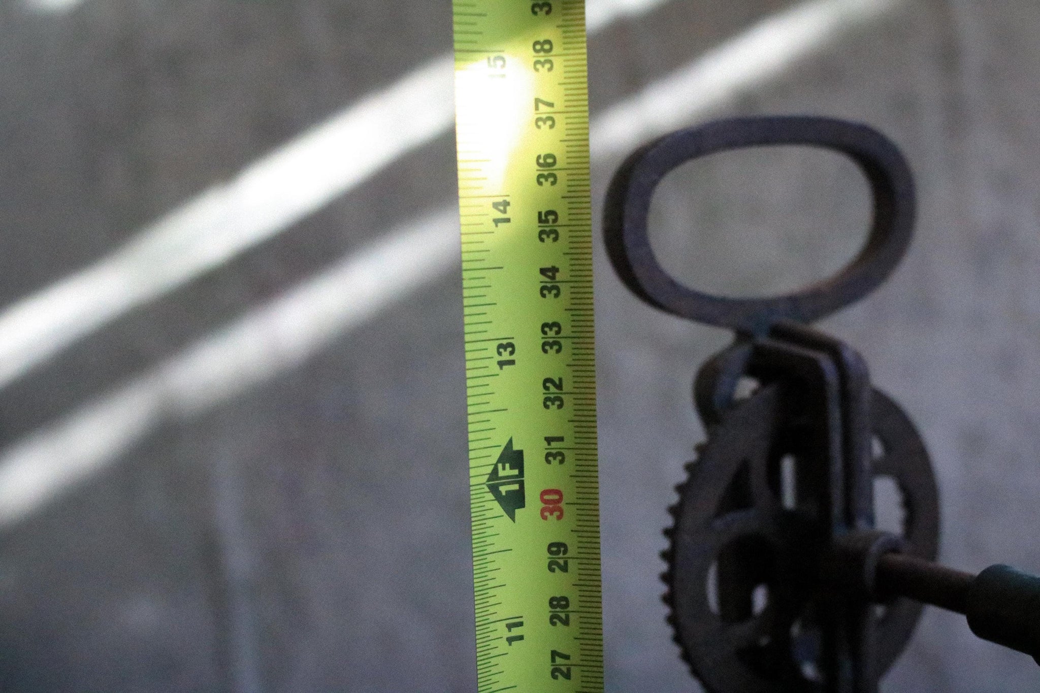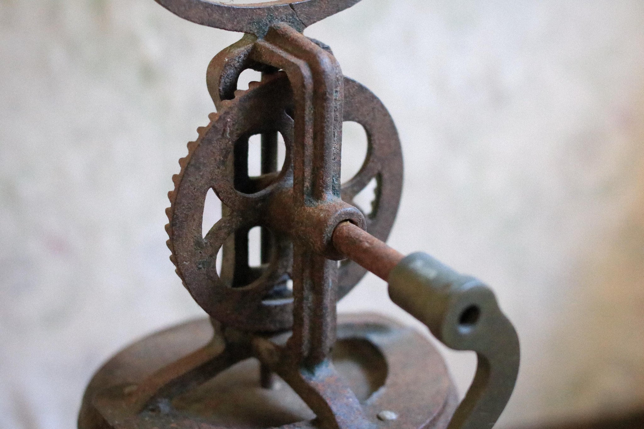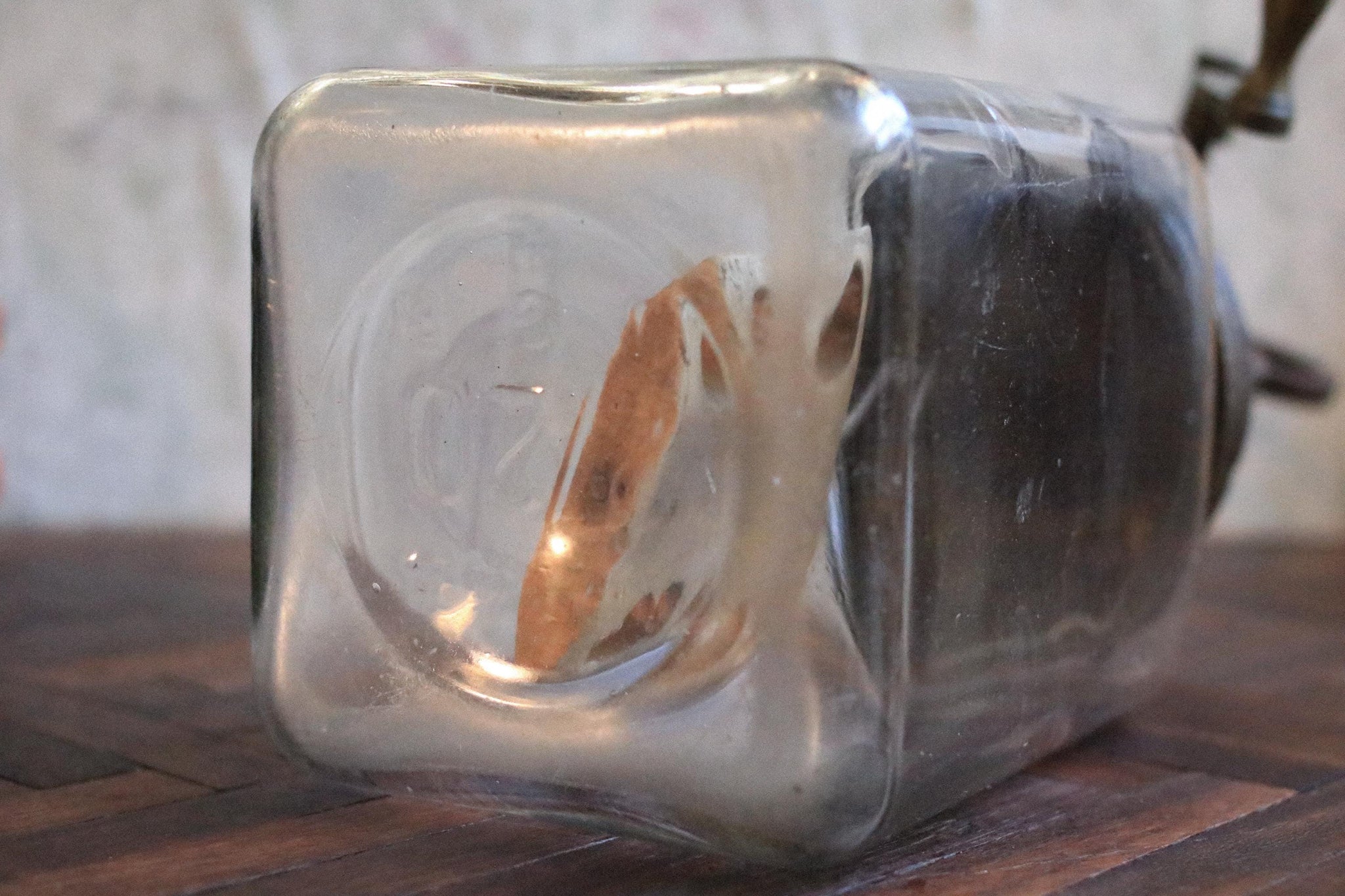 Condition is good and honest: clear jar with light scuffs and expected bubbles from manufacture, no rim chips or cracks observed; ironwork with stable oxidation; paddle showing old staining from use. Handle turns and spins paddle. An evocative, functional bit of kitchen history—perfect for a farmhouse kitchen shelf, shop display or prop styling.