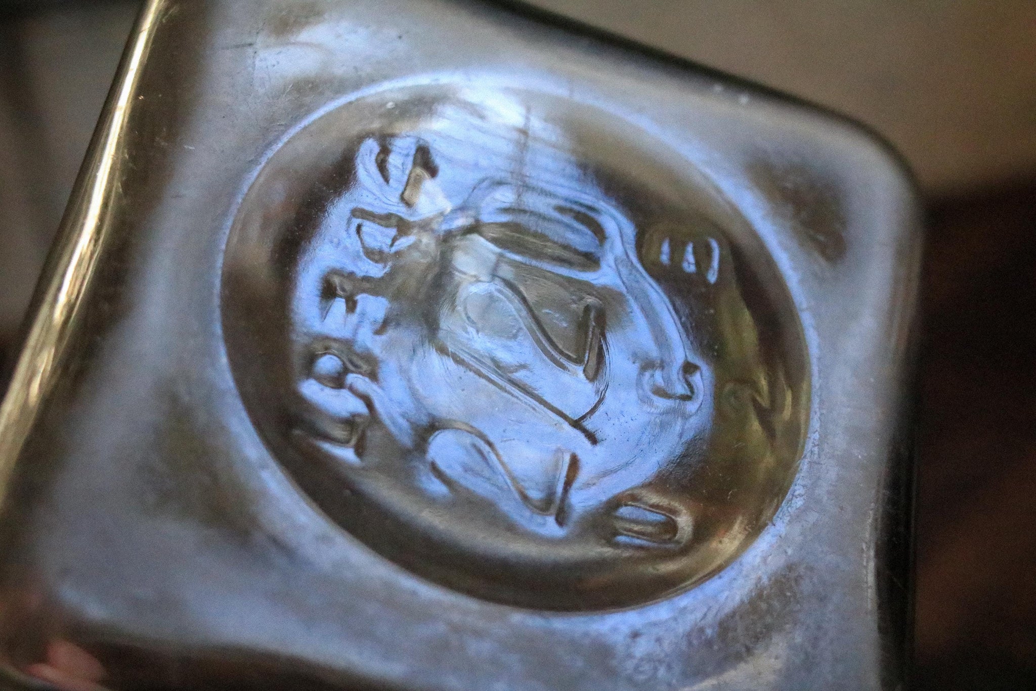 A handsome countertop butter churn with a square clear-glass jar, ribbed screw-top lid and a cast-iron double-gear crank that drives the original perforated wooden paddle. The mechanism turns smoothly and has a lovely, age-darkened patina. The glass is mould-embossed on the base with a 1925 date, and the side shows faint Canadian capacity marks, placing it firmly in the inter-war years.