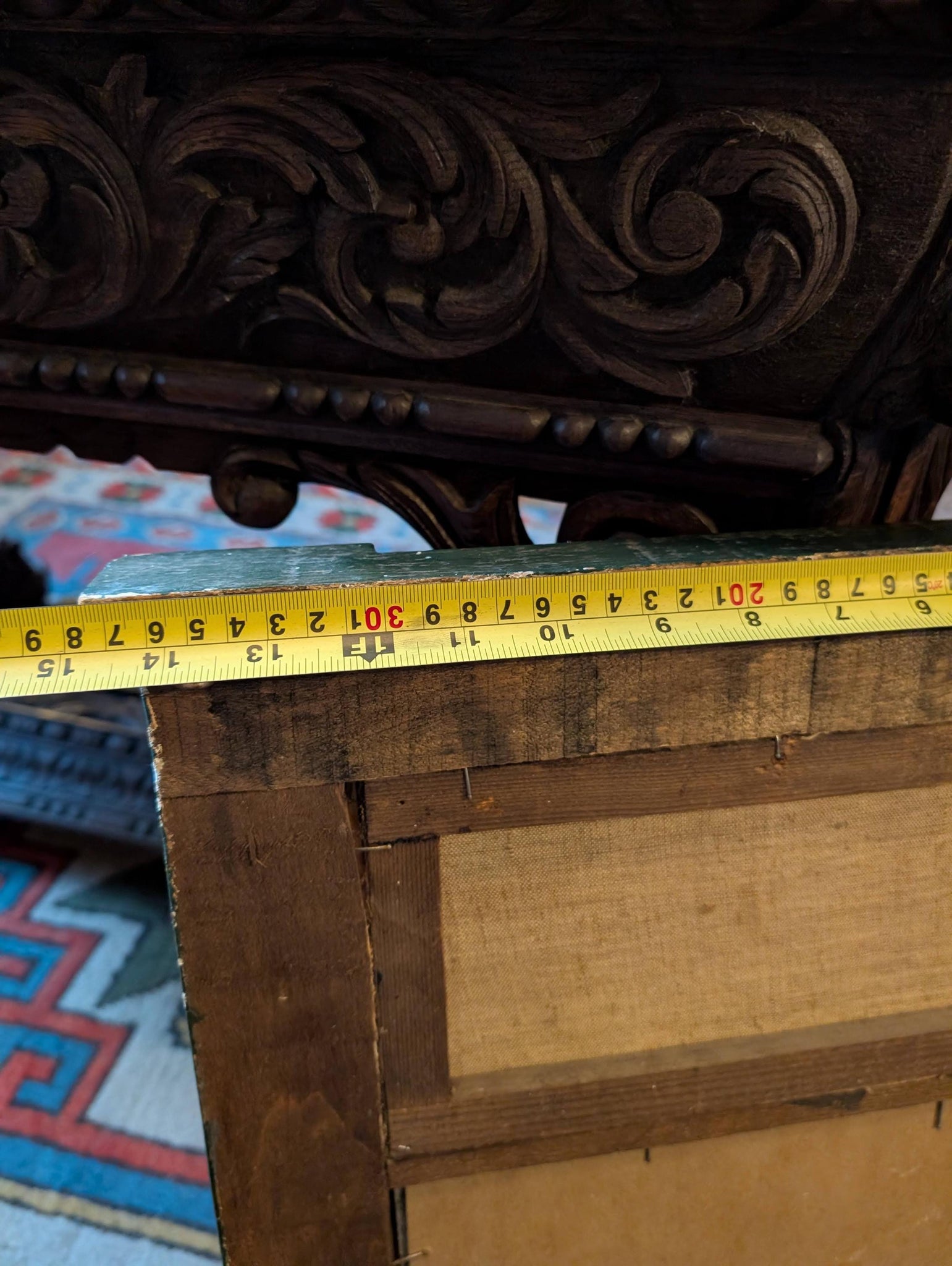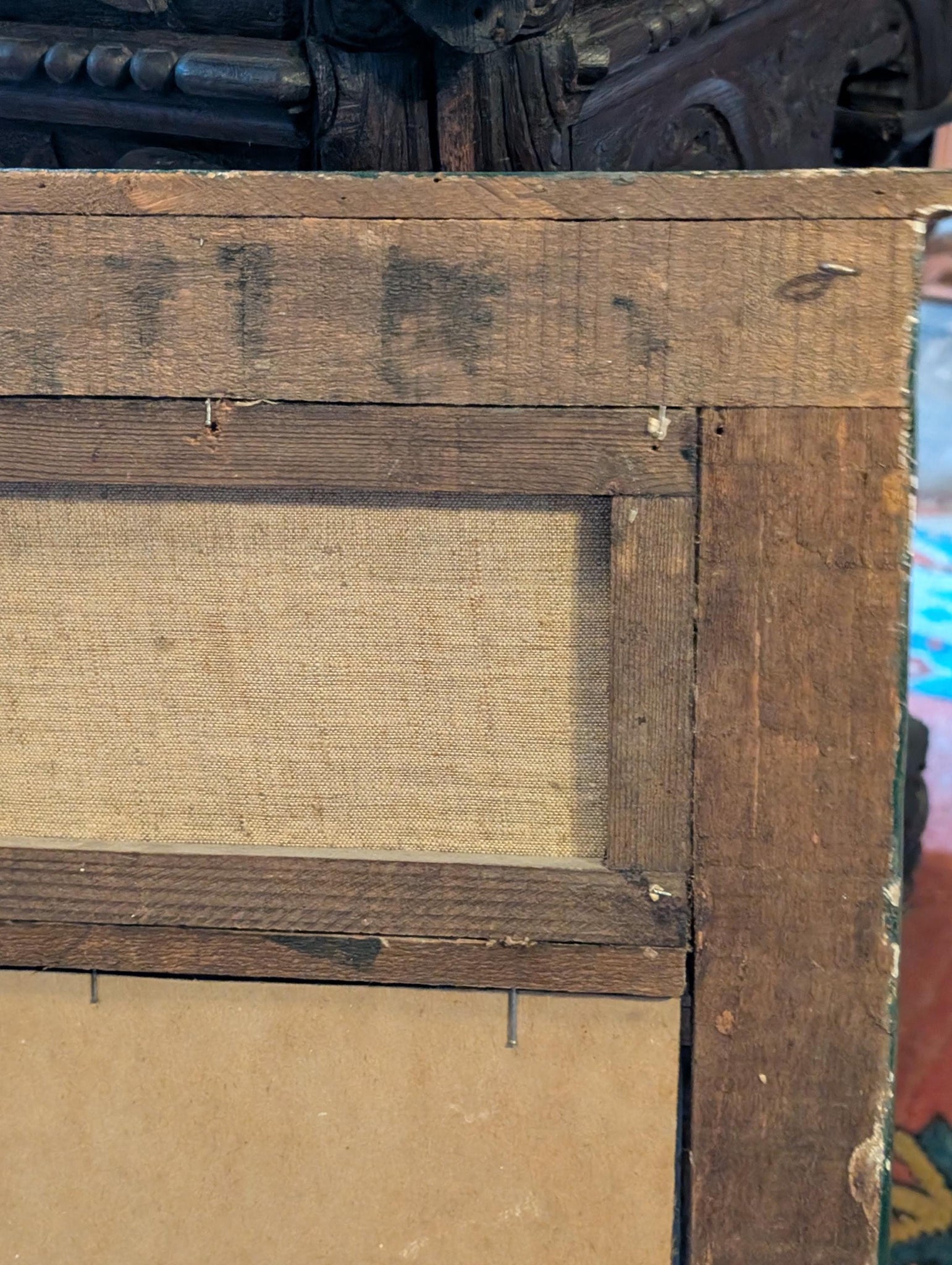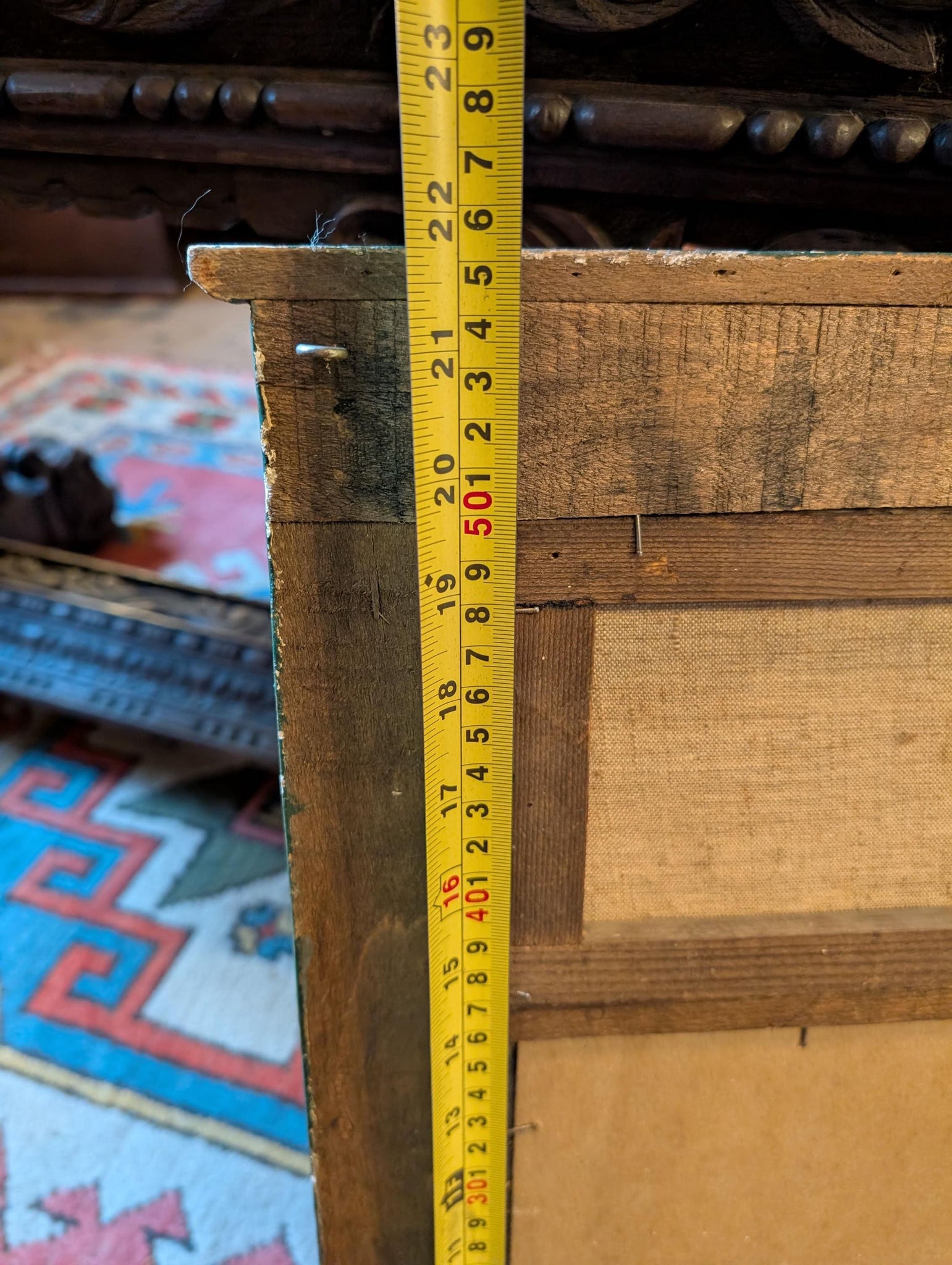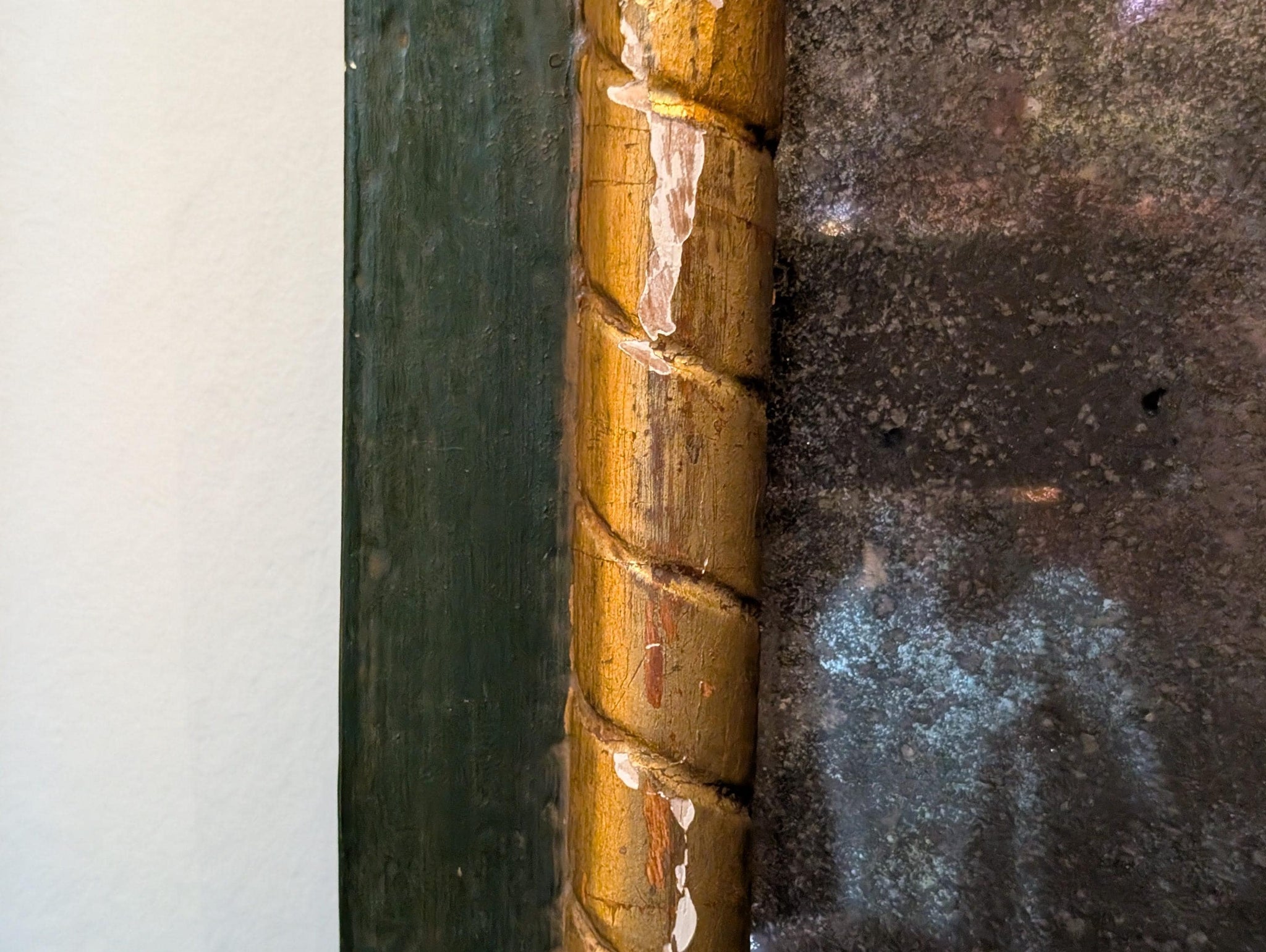 To the back you can see the age of the construction, with old timber, later board and modern fixings showing that the mirror has been sympathetically tightened up over time while keeping its character. There are knocks, small paint losses, touch-ins and cracks to the gilding, plus wear to the edges and corners and plenty of age to the glass – exactly the sort of authentic, timeworn surface that makes this so good over a console, in a stairwell or as a focal point in a French country or cottagecore scheme. Hanging hooks/chains as shown can easily be adapted to your own setup.
