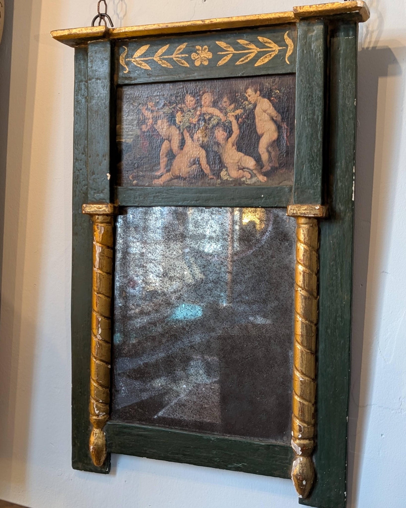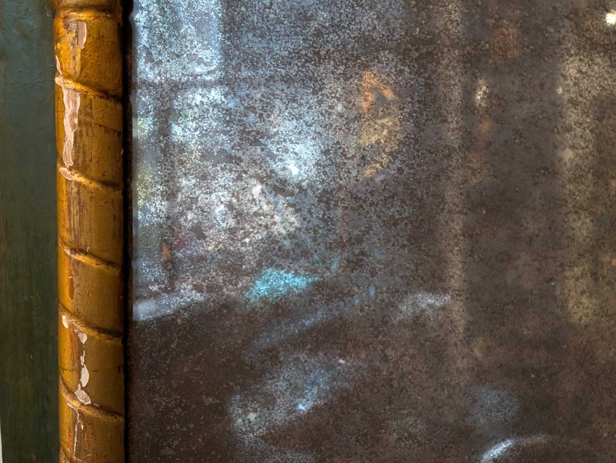 This wonderfully decorative trumeau mirror has all the old-world romance you want for a statement hallway or bedroom. The painted wooden frame is finished in deep bottle green with worn gilt highlights and twisted gilt side columns, topped with a frieze of lively putti carrying garlands of fruit after a Baroque original. Above the cherubs runs a simple foliate border in gold, giving the whole piece a charming, slightly rustic continental feel. The mirror plate itself is heavily aged with all-over speckling and smokiness, giving that soft, dreamy reflection that suits castlecore, grandmillennial and maximalist interiors perfectly.