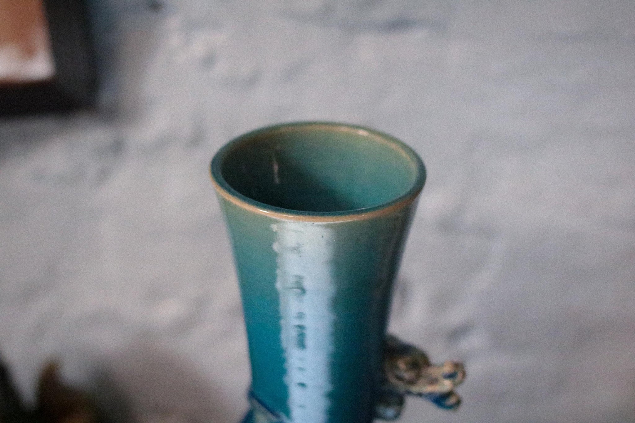 Atmospheric bottle-form Japanese earthenware vase with a coiled dragon in high relief winding around the neck. The glaze graduates from teal to deep peacock blue with lovely pooling and speckling— typical of Meiji period Awaji / studio wares. The applied dragon is crisply modelled with defined scales and whiskers, giving great movement and shadow. Unglazed footrim with buff body and a thick glassy glaze overlap at the base. Presents beautifully on a mantle or cabinet and throws colour in all lights.