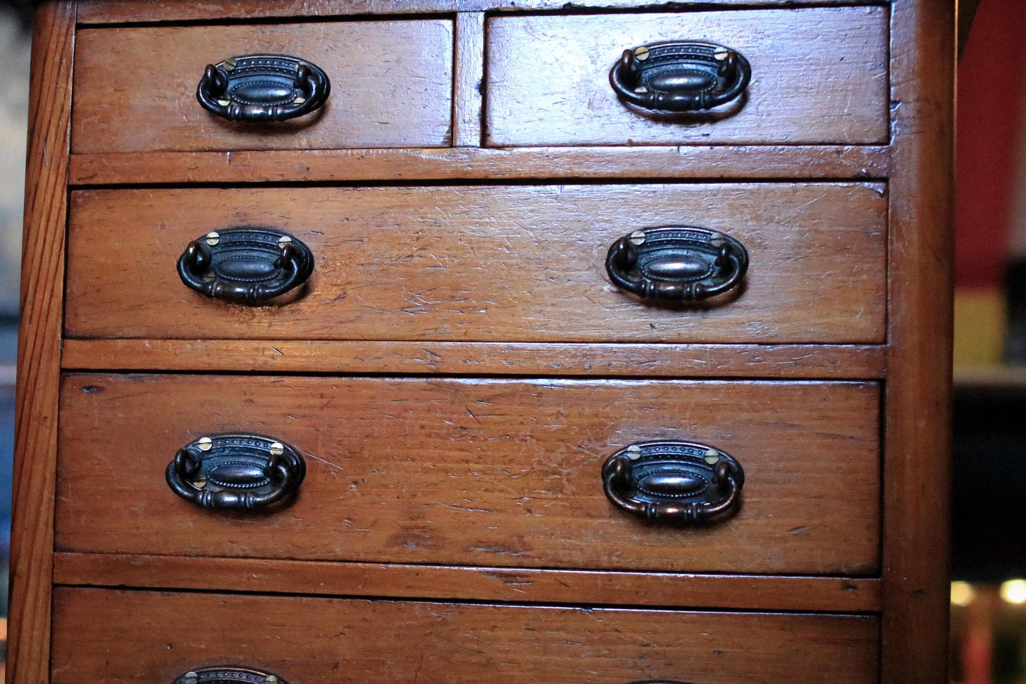 A beautiful little antique miniature chest of drawers, made in warm honey-toned walnut and fitted with lovely pressed-metal swan-neck handles. With two short drawers over three long, it reads like a perfectly proportioned Georgian or Victorian chest in miniature – ideal on a desk, dressing table or sideboard for jewellery, sewing notions or small collections. Pieces like this were often used as apprentice pieces or shop / haberdashery cabinets and it has exactly that “curiosity shop” presence that works so well with dark academia and old-money interiors.