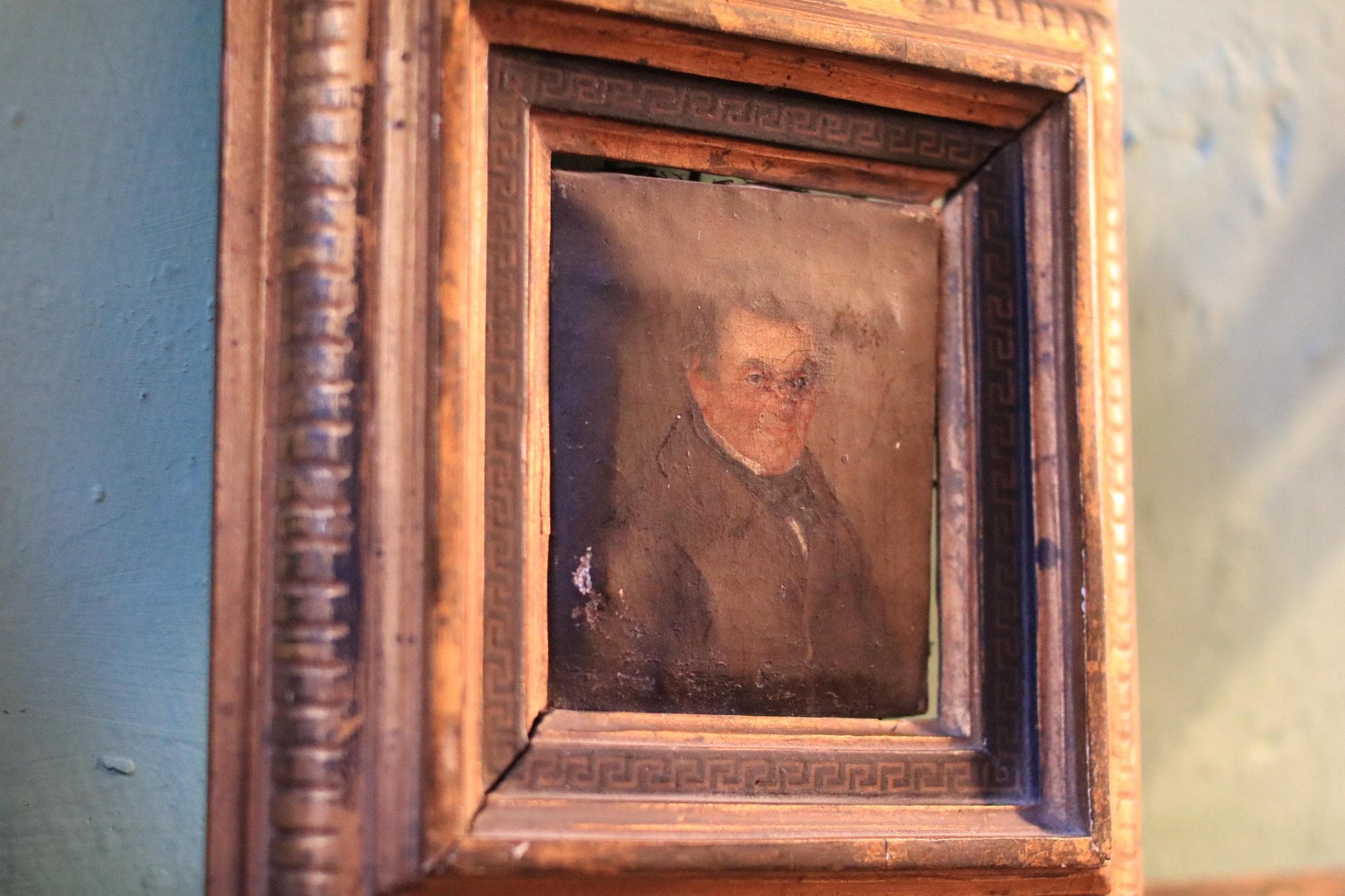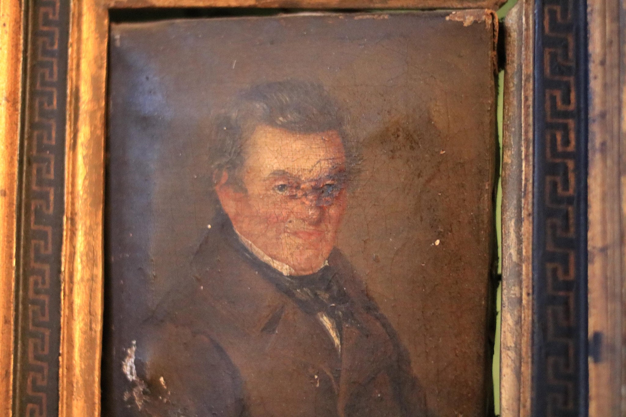 A beautifully atmospheric antique miniature portrait of a gentleman, set behind glass in a warm gilt frame with a Greek key slip. It has that perfect “found object” look for a layered gallery wall, desk vignette, or cabinet display—ideal for the current dark academia / old money / Regencycore direction where small, timeworn originals add instant story and depth.