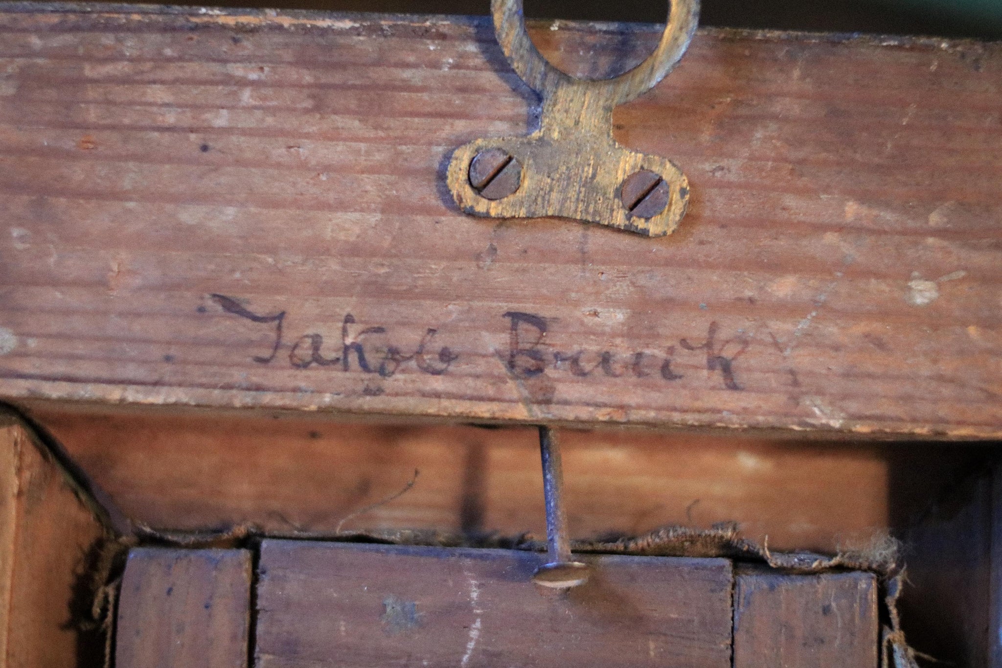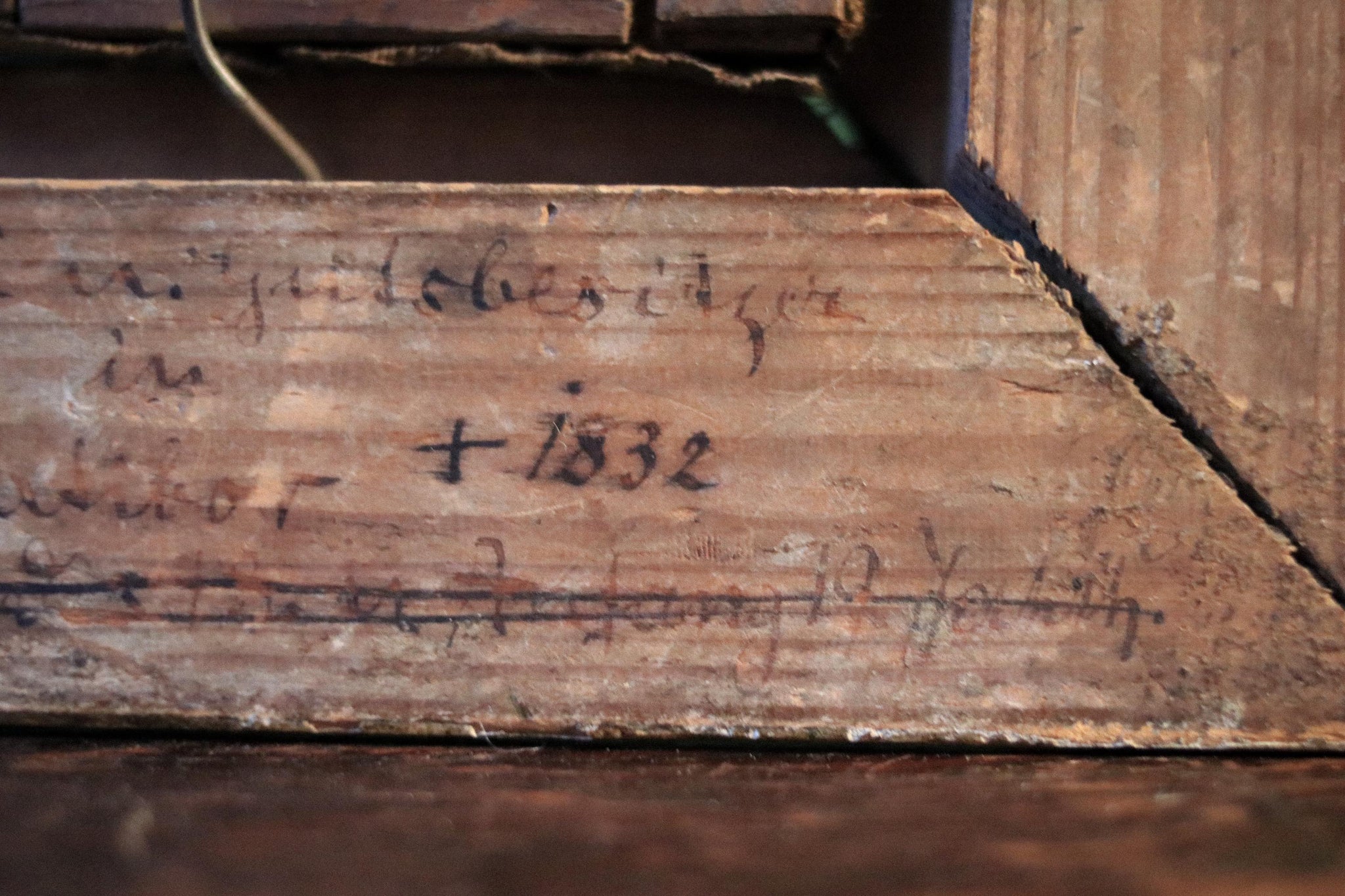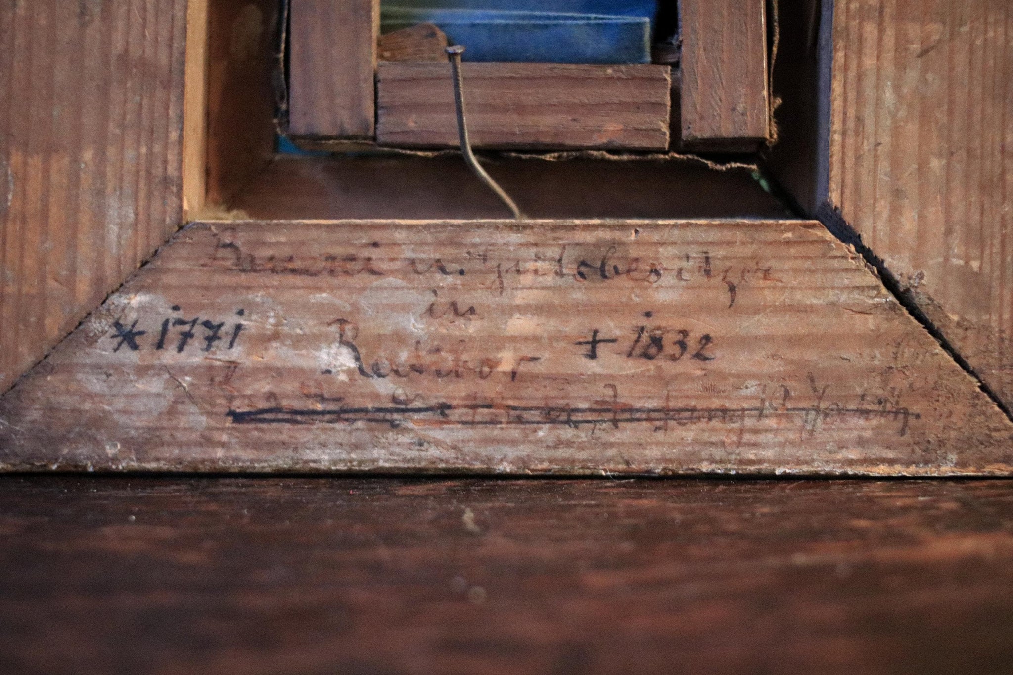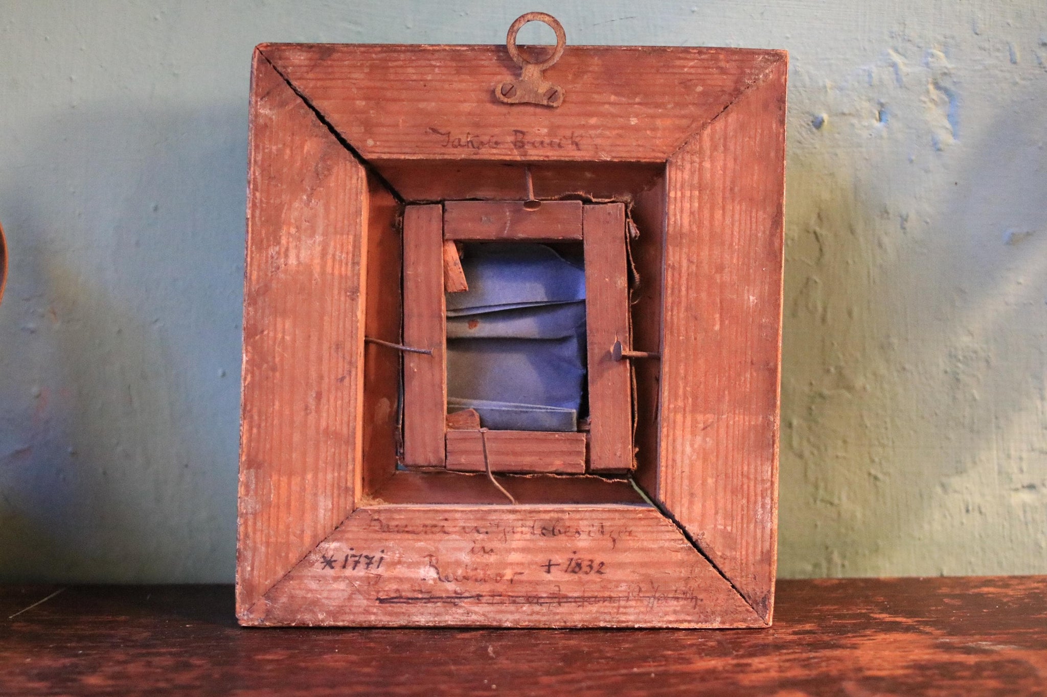 The reverse shows old handwritten notes and dates (photographed), which add great provenance feel even if not fully legible, and the frame has honest age wear, rubbing, and patina consistent with its age. A lovely, characterful piece that looks especially good styled with books, brass, and darker woods.