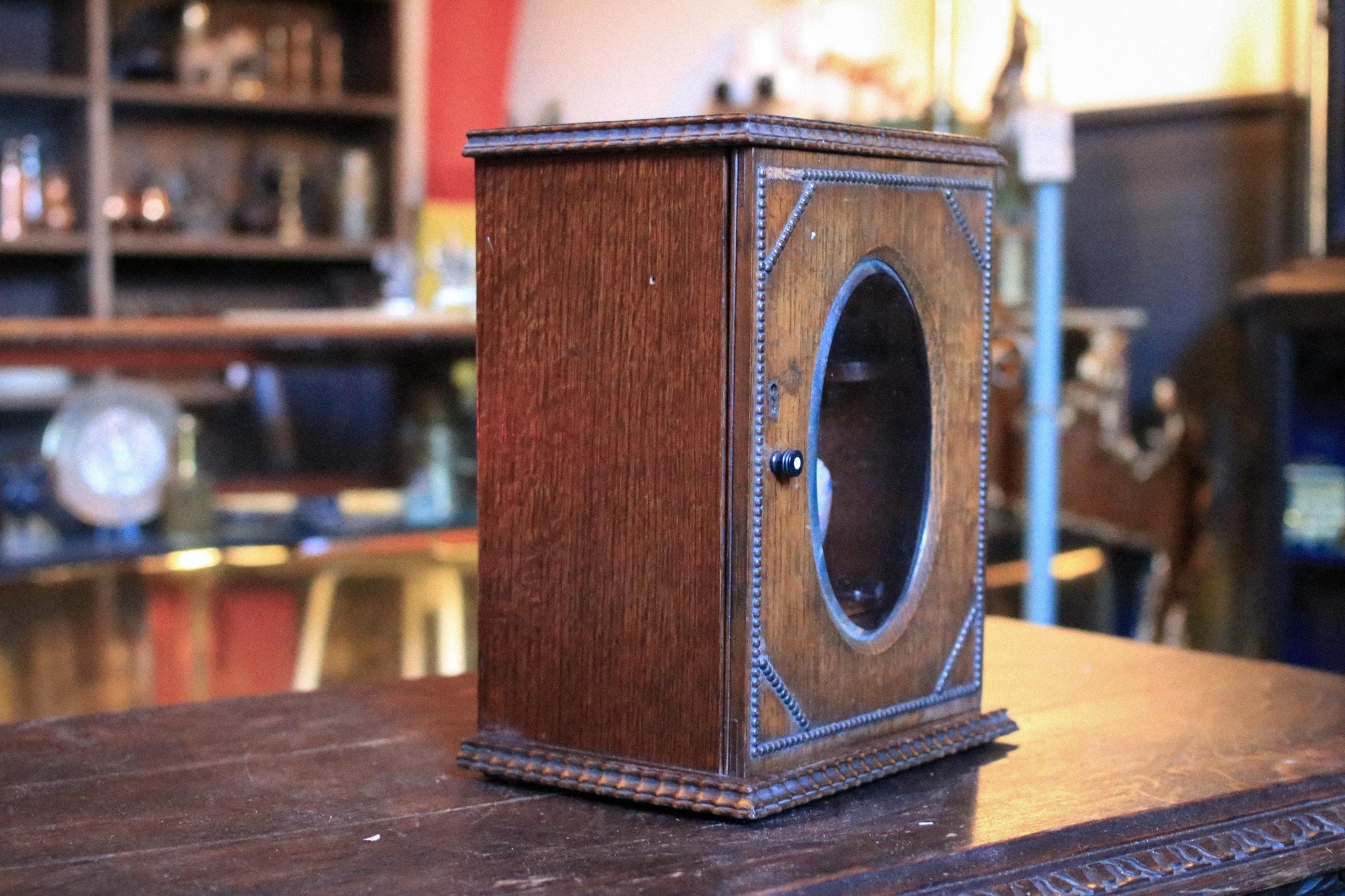 A charming antique smoker’s cabinet in stained oak (or similar hardwood), made for keeping smoking requisites neatly to hand. The front has a lovely oval glazed door framed by a beaded border, giving it that classic gentleman’s club / study feel—ideal for old money / dark academia styling on a desk, sideboard or bar cart. Great as a traditional tobacco/cigar cabinet, and also brilliant repurposed as a small display cabinet for curios or bar bits.