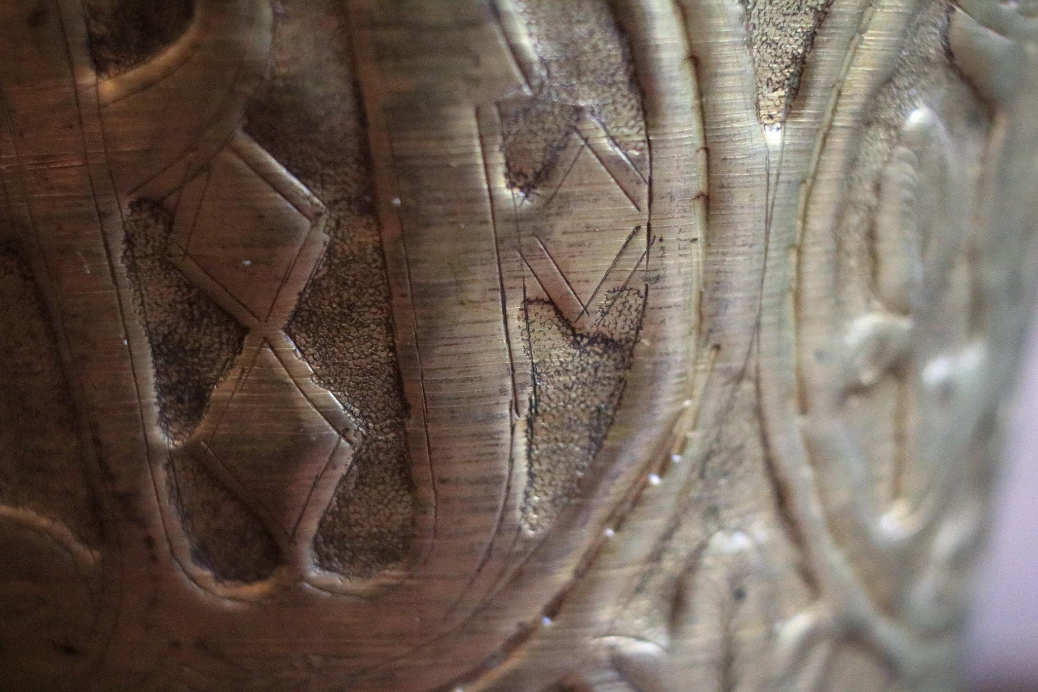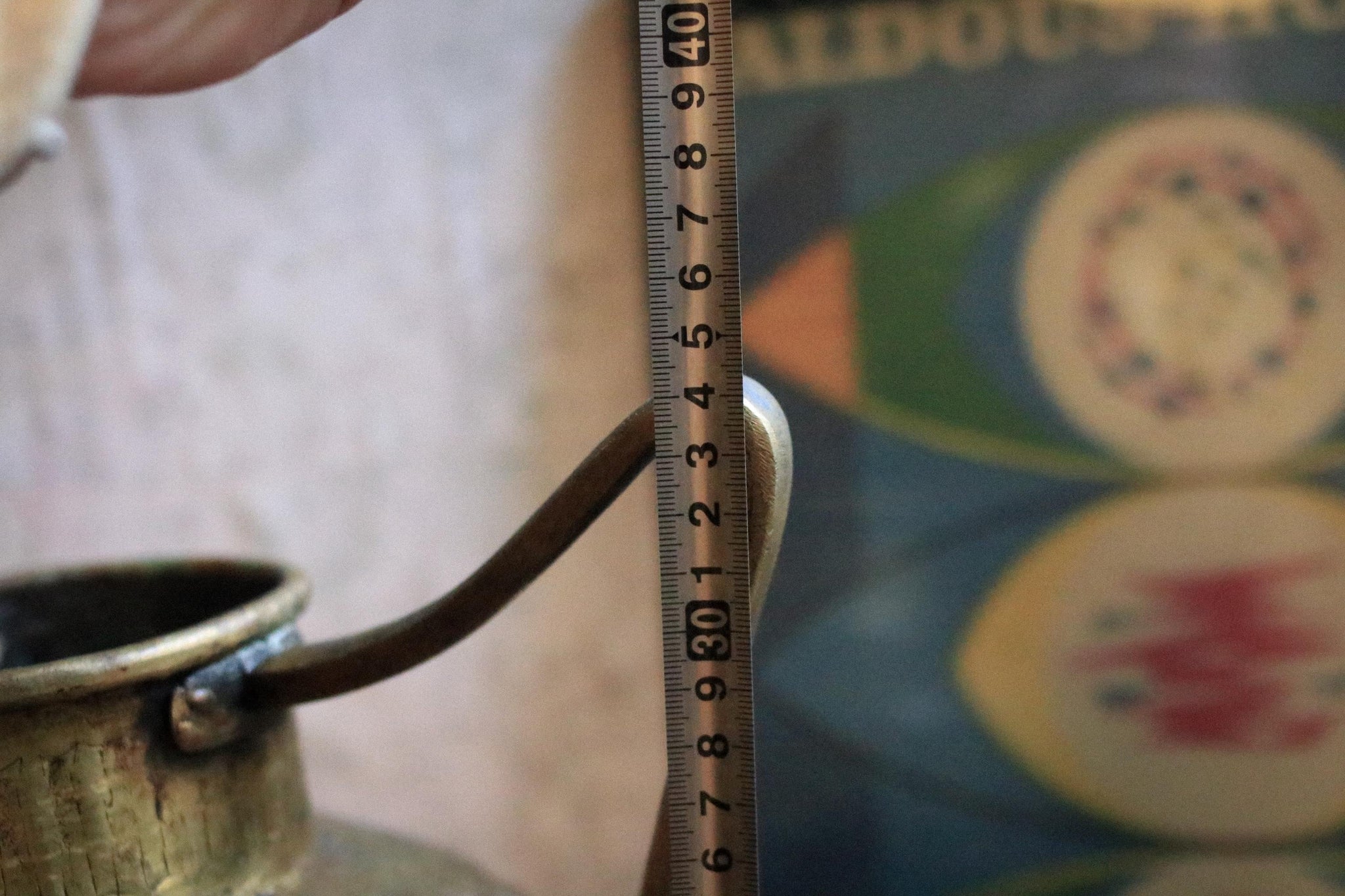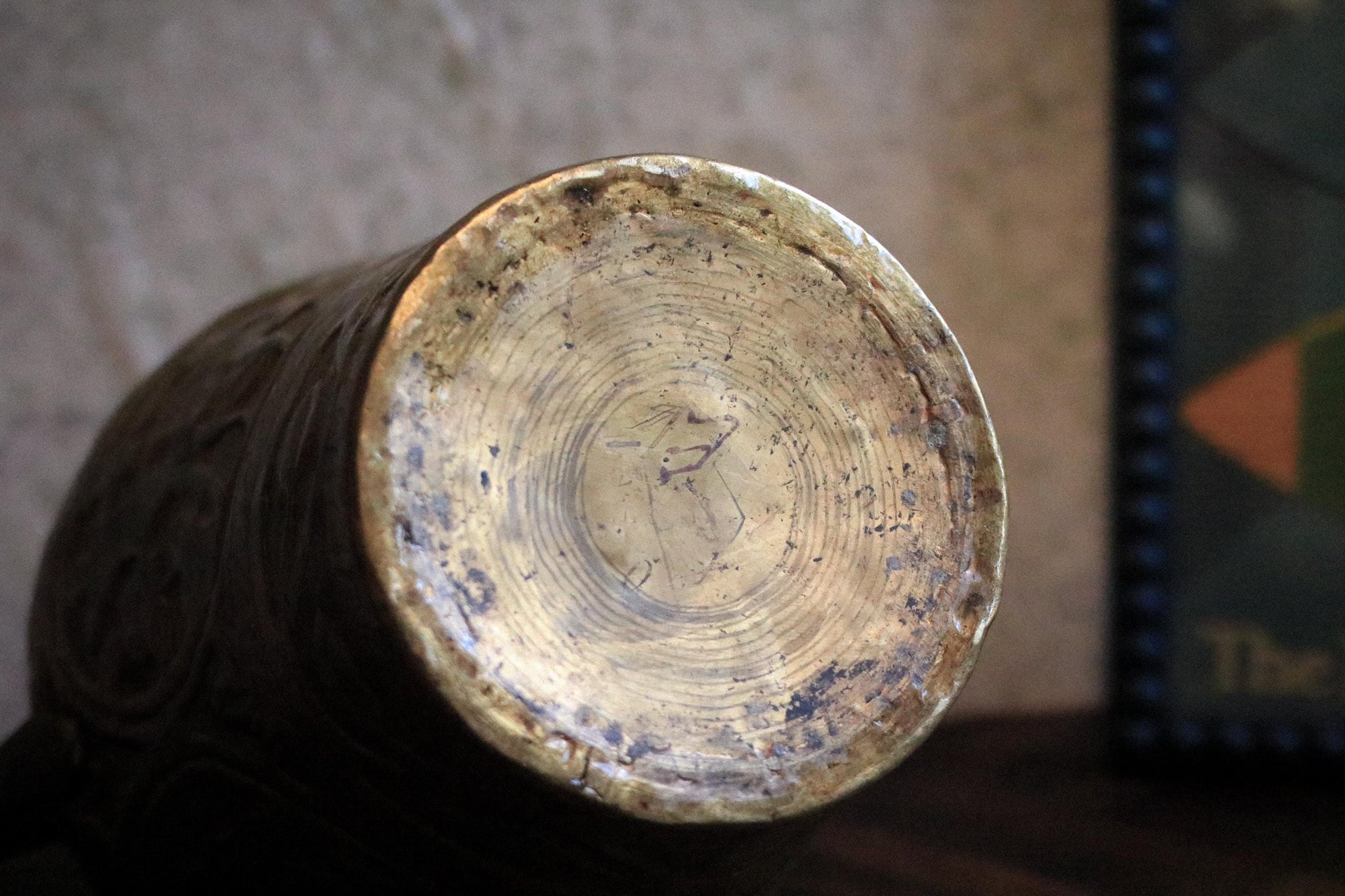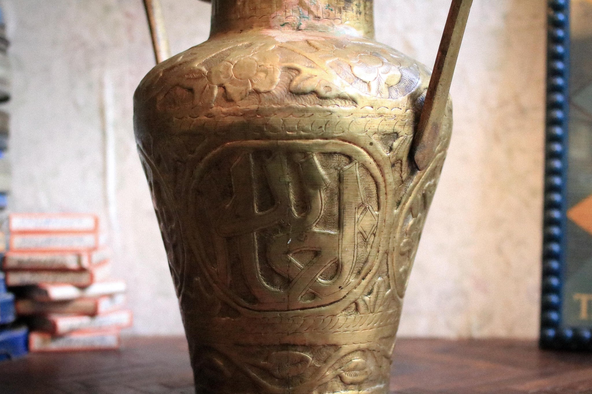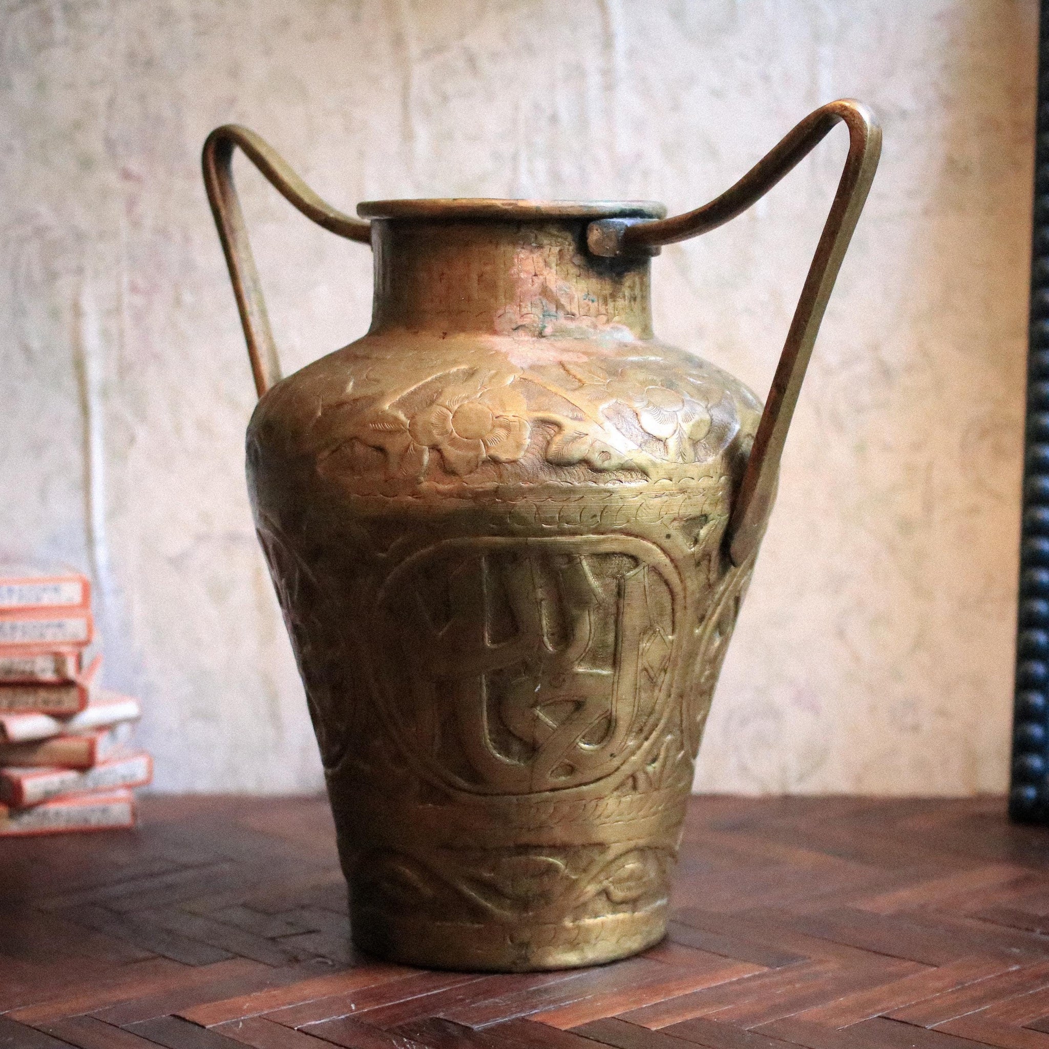 A striking antique Ottoman Islamic brass vessel with a classic urn form and tall double loop handles, richly embossed (not engraved) with decorative bands and Arabic calligraphy. The surface has that deep, lived-in patina collectors want, and it lands perfectly in the current “warm metals / old money / museum-style” interiors trend—ideal as a standalone statement piece on a console, bookshelf styling, or as a dramatic floor accent with dried stems.