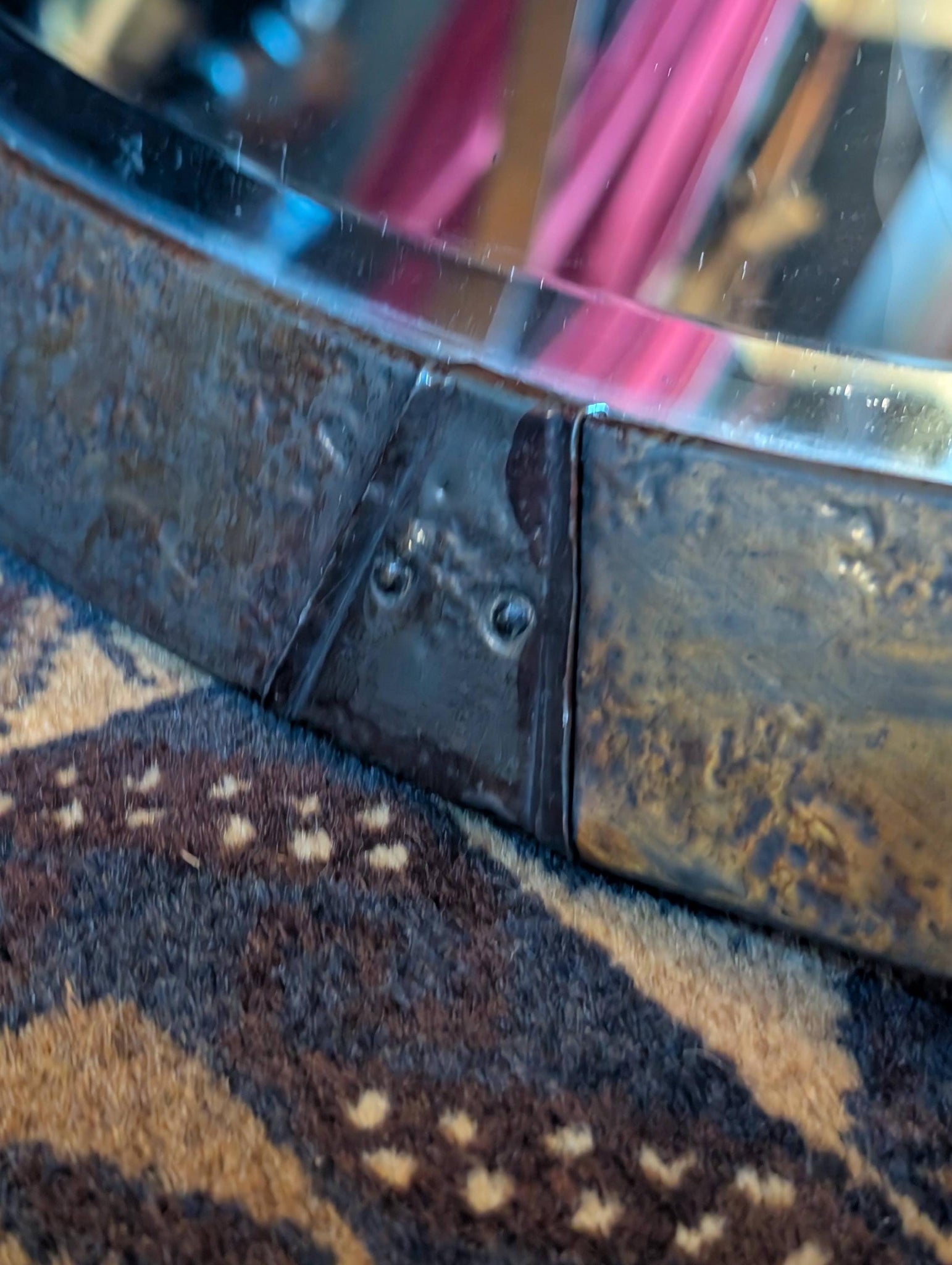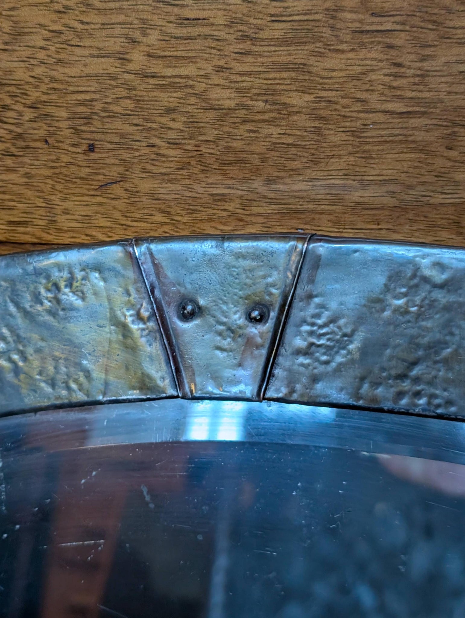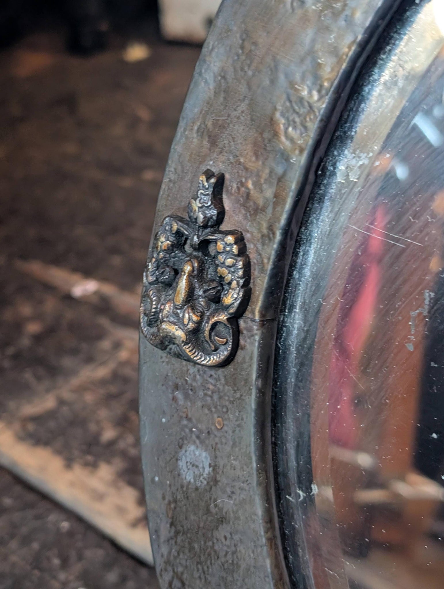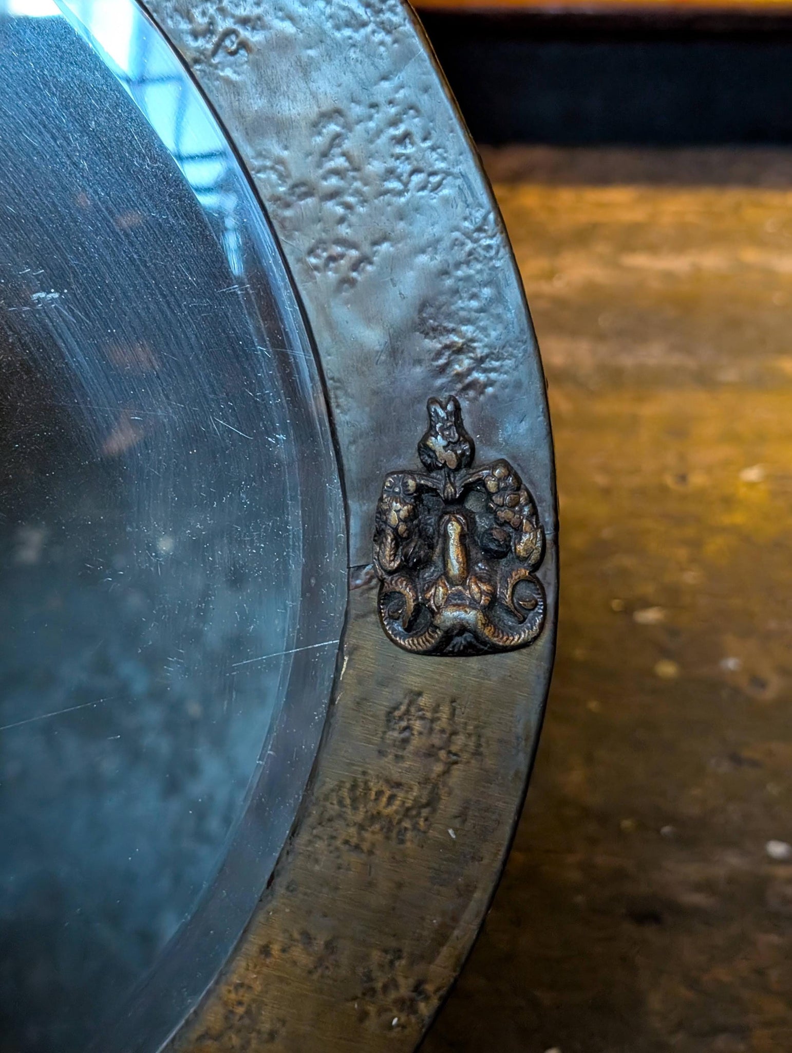 A handsome antique oval wall mirror with a beautifully aged metal frame in a pewter tone finish, detailed with a softly textured surface and small applied decorative mounts. It has a strong, understated look that works especially well in darker layered interiors, whether you lean towards castlecore, old money or an Arts and Crafts influenced room. The simple oval plate and restrained ornament give it presence without feeling too fussy, making it an easy piece for a hallway, bedroom, cloakroom or above a chest.