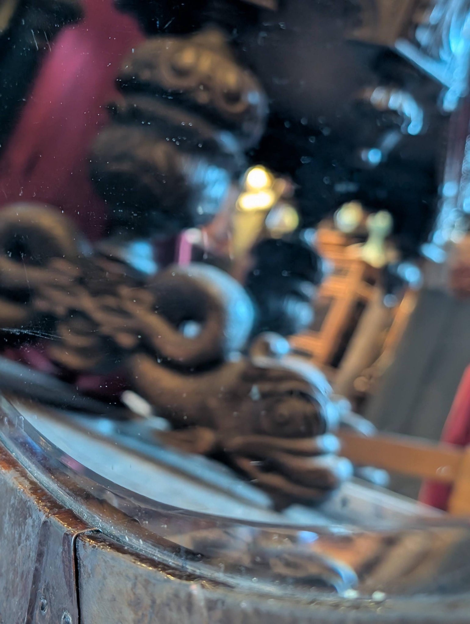 This one has a lovely timeworn surface and honest age throughout. There is visible wear and patina to the frame, some rubbing and marks, a visible join to the rim, and light age-related wear to the mirror plate and reverse, all shown in the photographs. It retains its hanging loops to the back and displays with plenty of character.