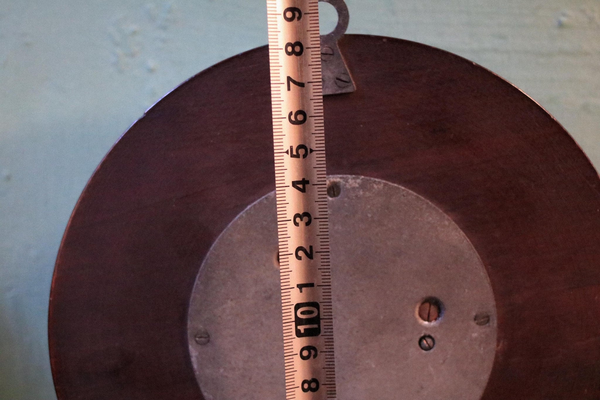 Condition is nicely timeworn with patina and surface wear consistent with age, including age marks to the dial edge and general rubbing to the case (all visible in photos). Hanging ring at the top for wall mounting. Diameter is 18 cm (7.1 in)