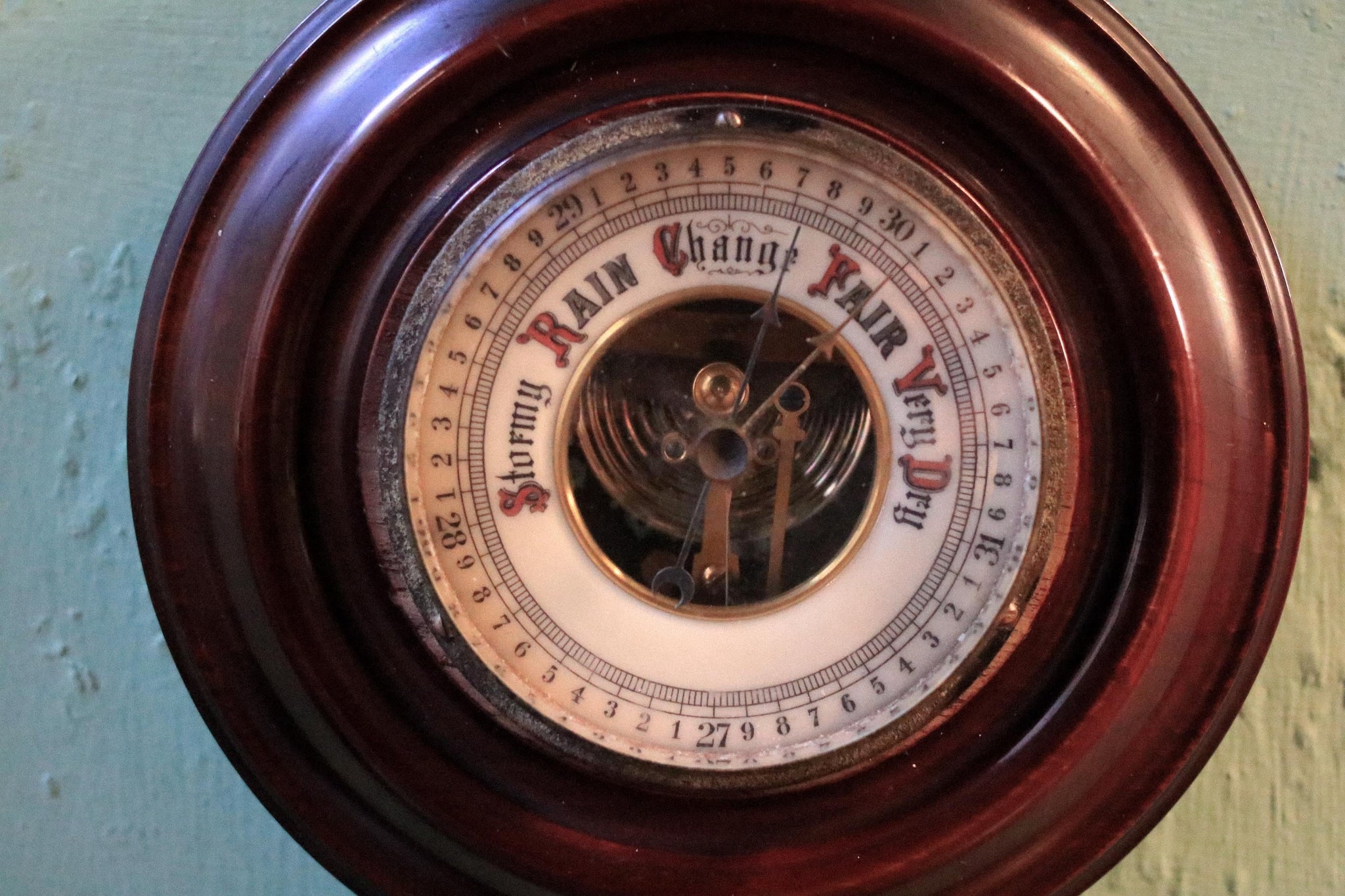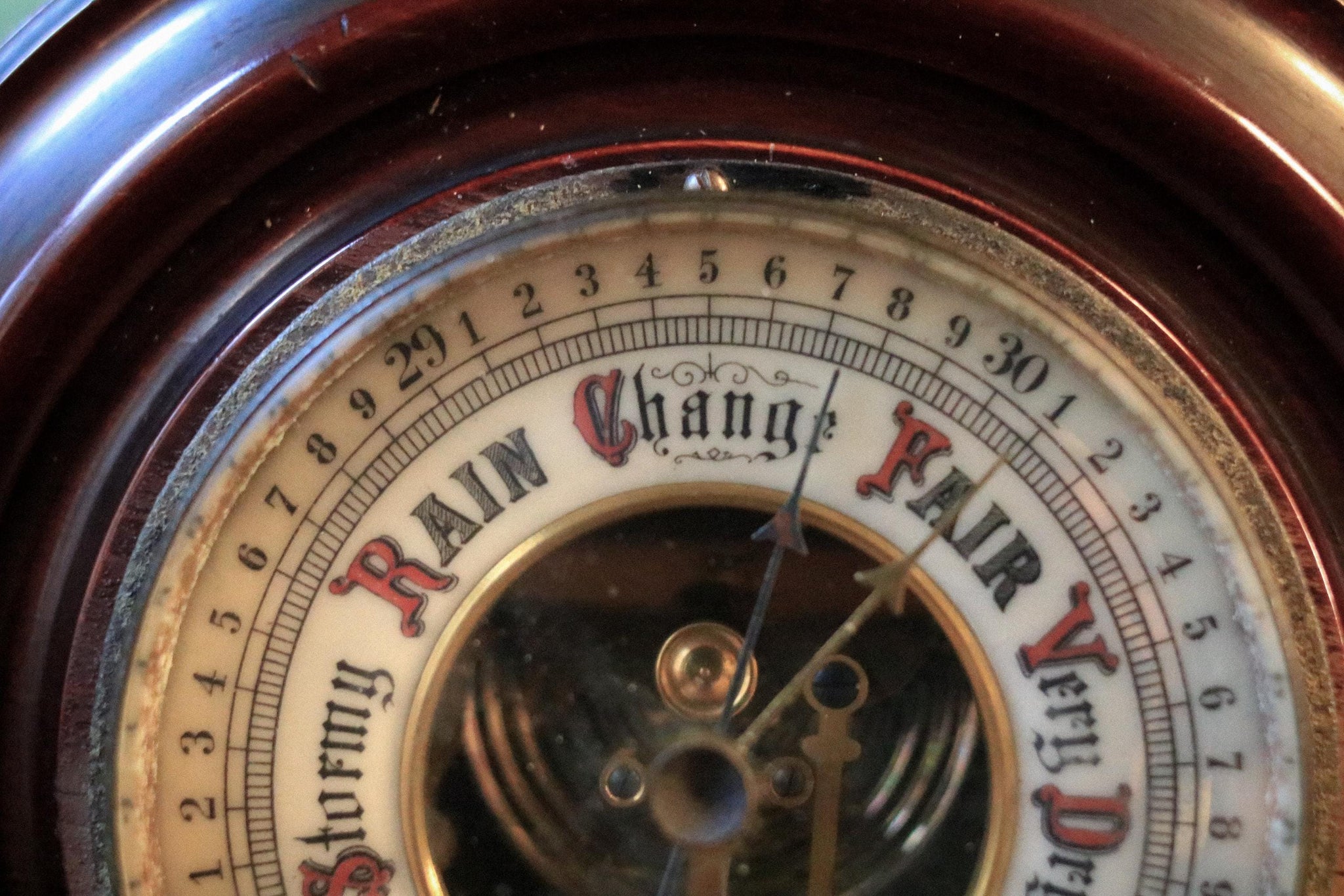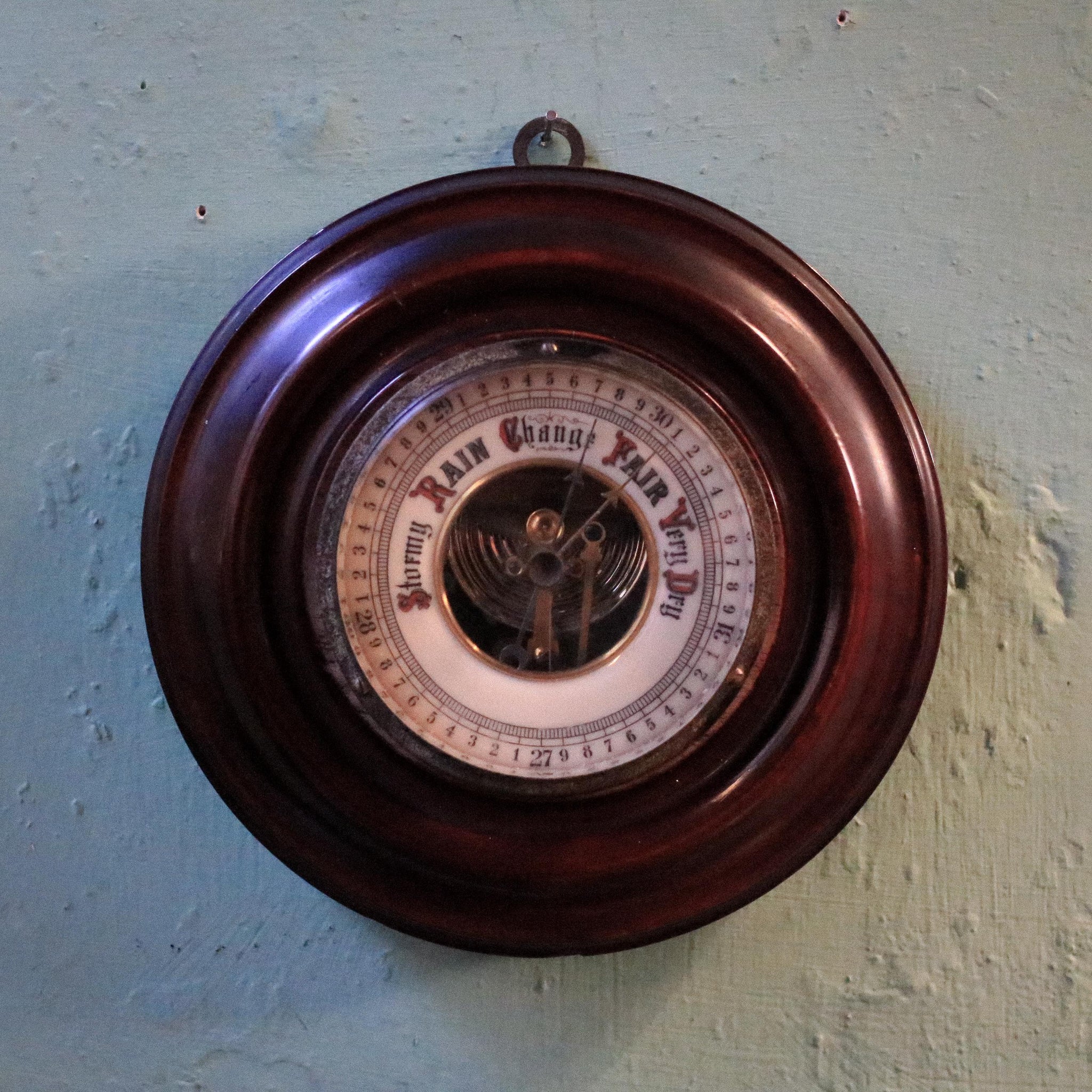A beautifully aged round wall barometer with a classic “Stormy / Rain / Change / Fair / Very Dry” dial and an open-centre view to the movement, set into a richly toned polished wooden surround with a brass bezel and glass face. It’s the kind of piece that instantly lands in a space—perfect for Dark Academia / Old Money interiors, a study wall, hallway vignette, or layered gallery arrangement where you want that subtle “heritage instrument” vibe without trying too hard.